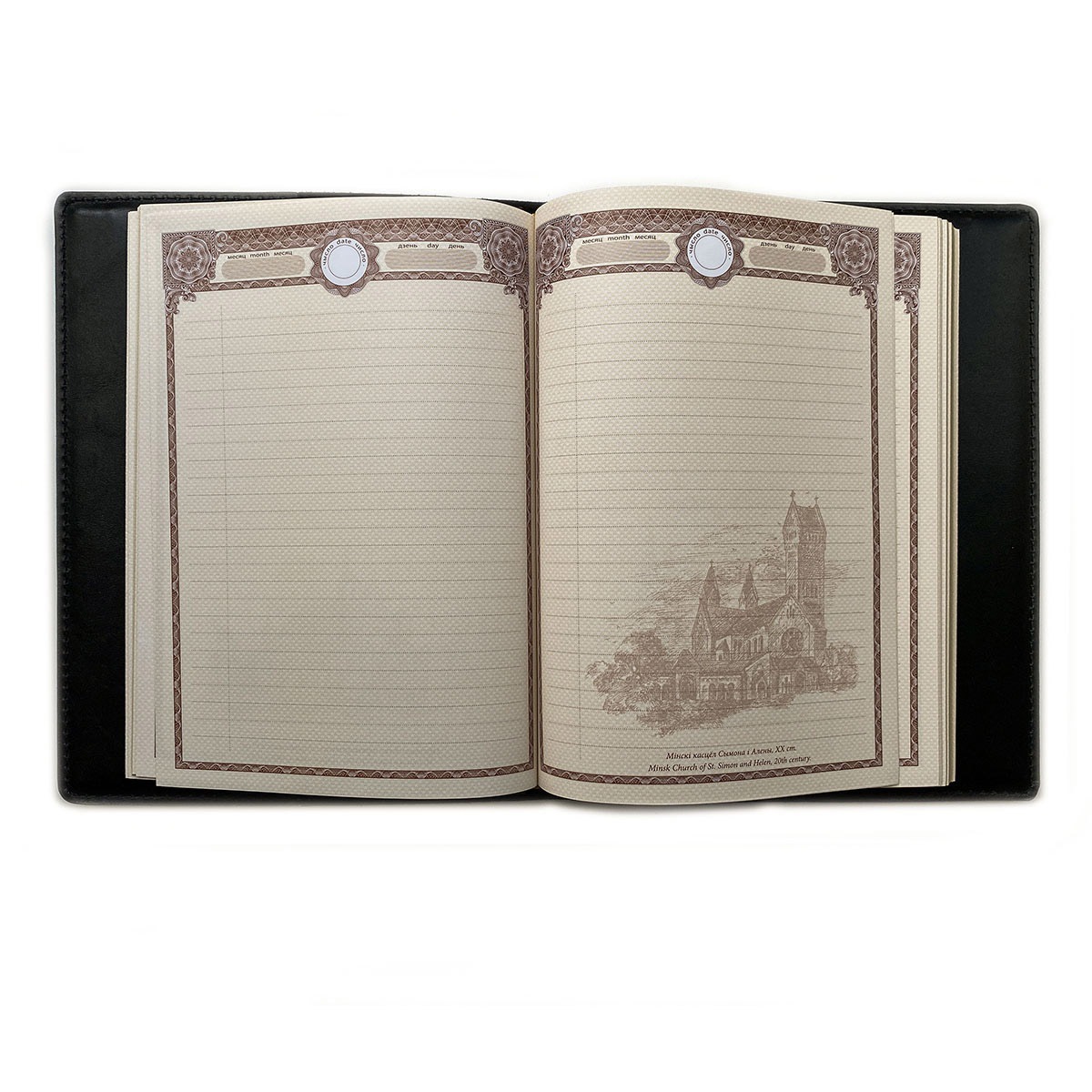 Ежедневник формата А5 в обложке из натуральной кожи с оригинальным тиснением. Сменный блок стандартного размера А5, изготовлен из лощеной бумаги высокого качества. На каждой странице в виде водяных знаков сделаны изображения памятников мировой архитектуры. Срез блока с трех сторон фольгирован "под золото". Обложка выполнена из высококачественной натуральной телячей кожи.