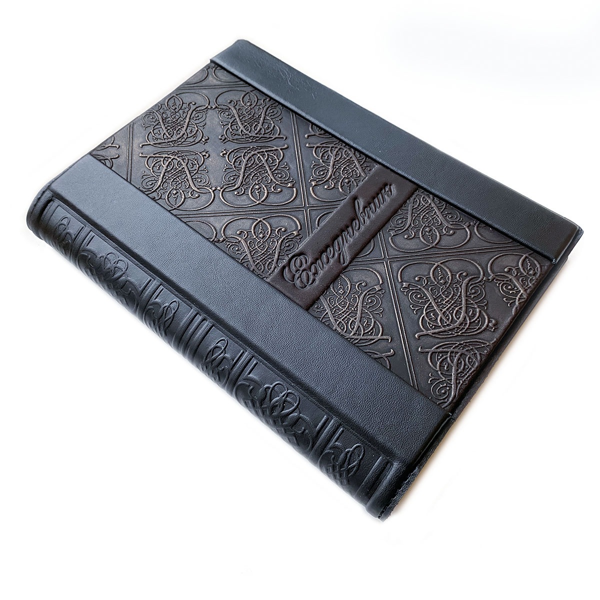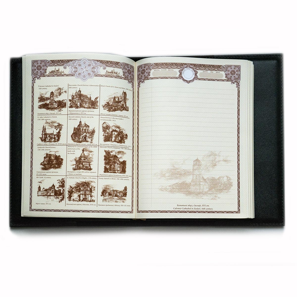 Ежедневник формата А5 в обложке из натуральной кожи с оригинальным тиснением. Сменный блок стандартного размера А5, изготовлен из лощеной бумаги высокого качества. На каждой странице в виде водяных знаков сделаны изображения памятников мировой архитектуры. Срез блока с трех сторон фольгирован "под золото". Обложка выполнена из высококачественной натуральной телячей кожи.