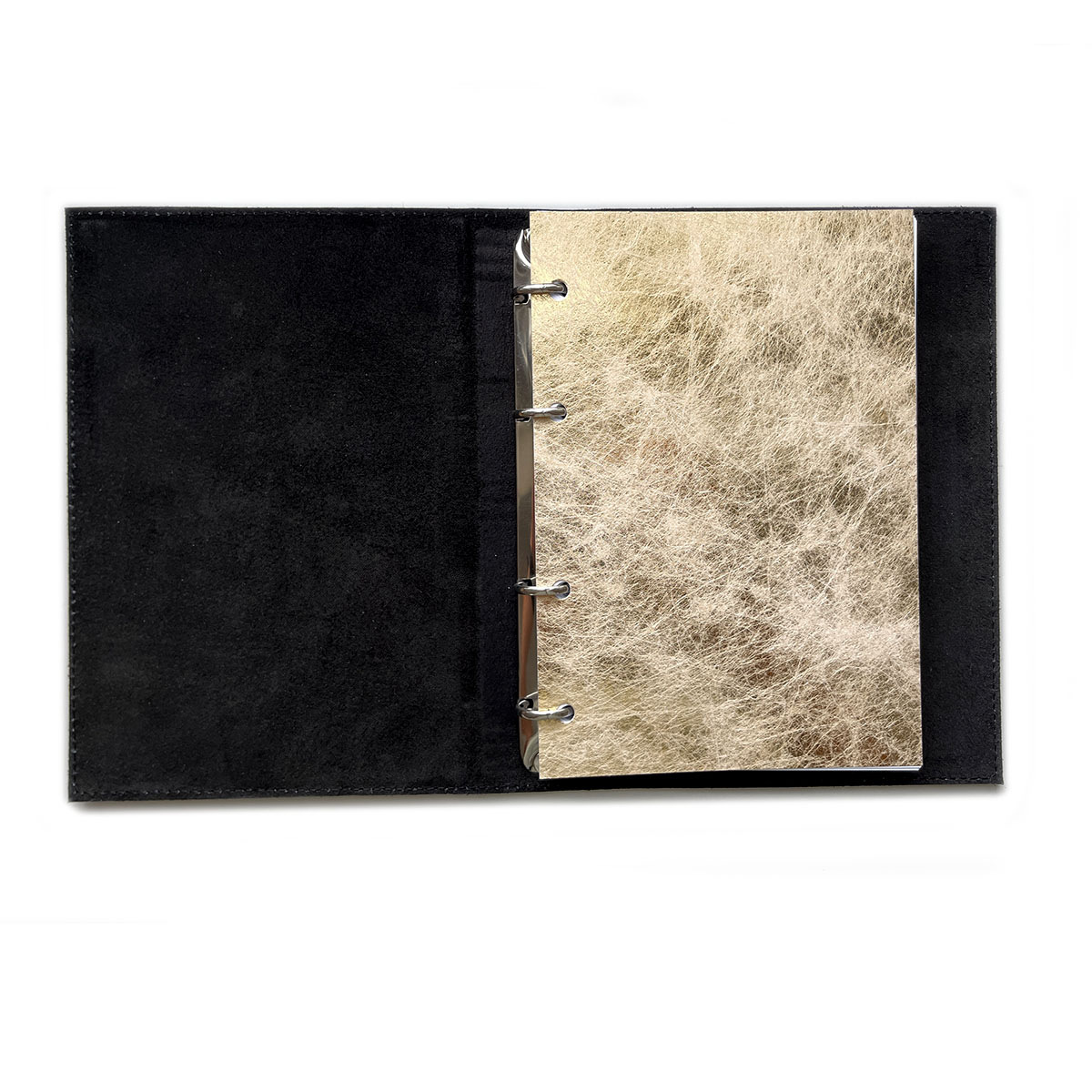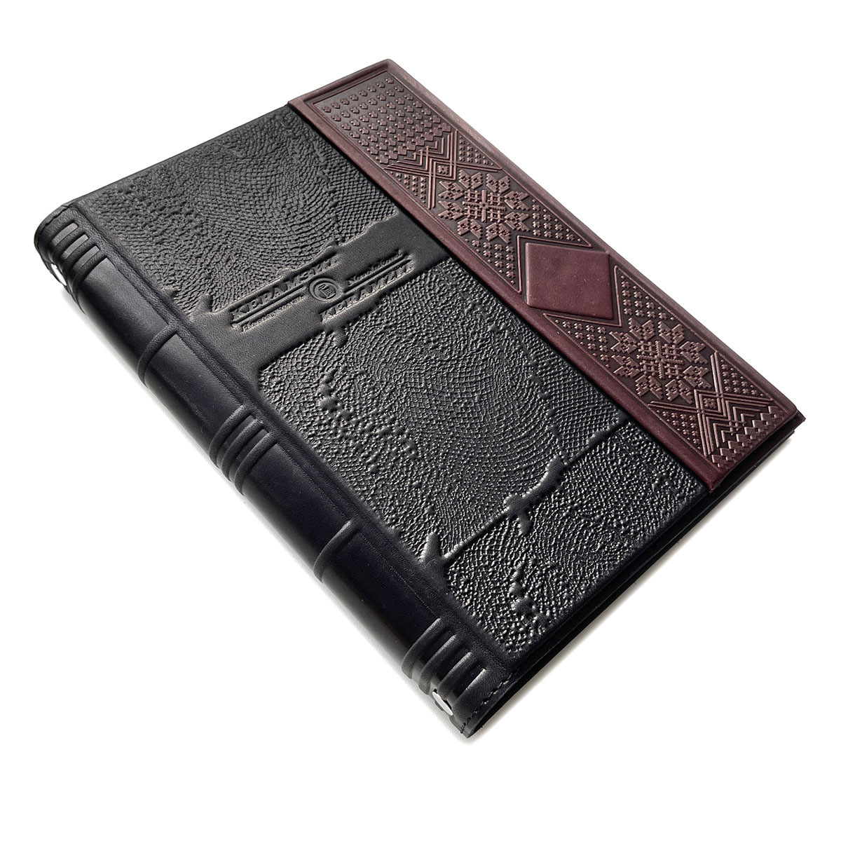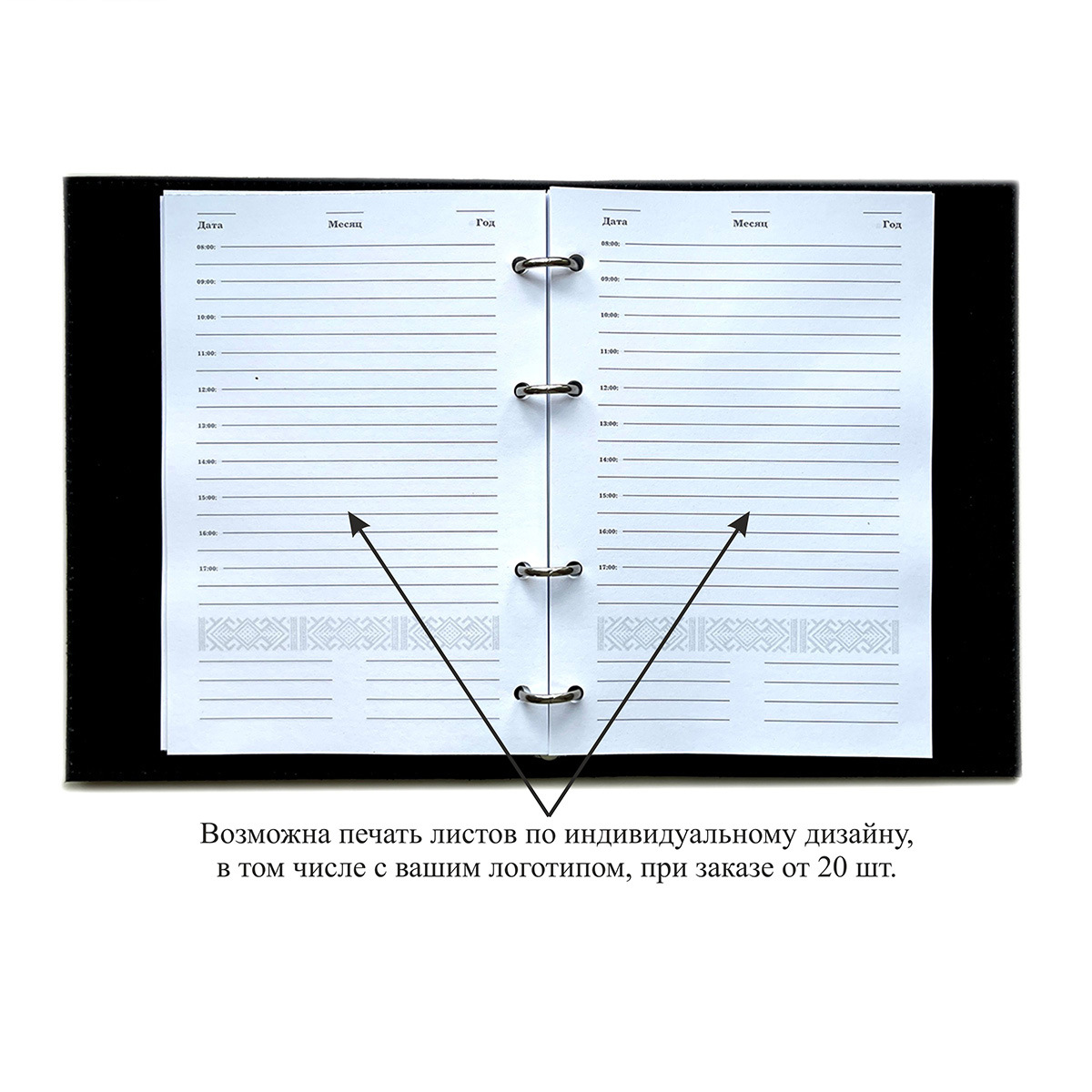 Кожаный ежедневник с креплениями листов на кольцах от бренда Гук с тиснением логотипа на обложке и на листах. Изготовлен из натуральной кожи. Сменный блок, напечатаный по индивидуальному макету. Когда вы испишете последнюю страничку, вы сможете приобрести блок в любом магазине канцтоваров и заменить на новый, а обложка с кольцевым механизмом останется. Изготовление под заказ с логотипом на обложке возможно от 10 одинаковых единиц. Изготовление с печатью индивидуального блока от 20 одинаковых единиц.