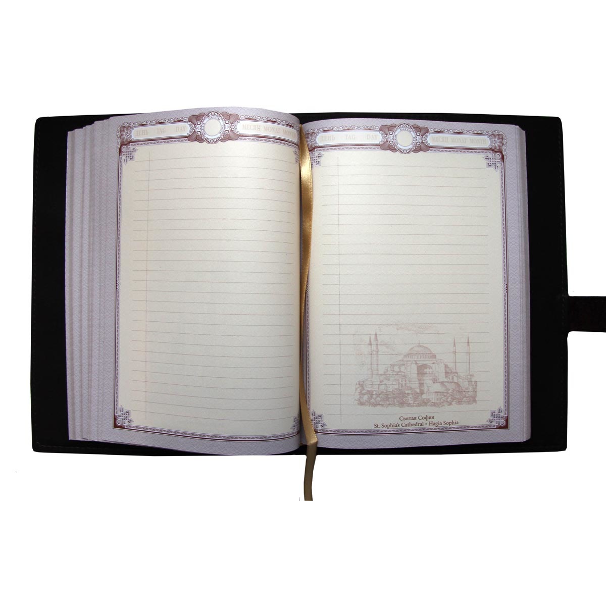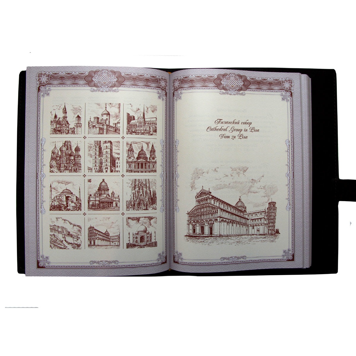 Ежедневник формата А5 в обложке "МОДЕРН" из натуральной кожи с оригинальным тиснением.Сменный блок стандартного размера А5, изготовлен из лощеной бумаги высокого качества. На каждой странице в виде водяных знаков сделаны изображения памятников мировой архитектуры. Срез блока с трех сторон фольгирован "под золото". Обложка выполнена из высококачественной натуральной телячей кожи.