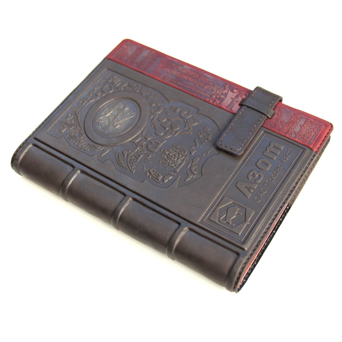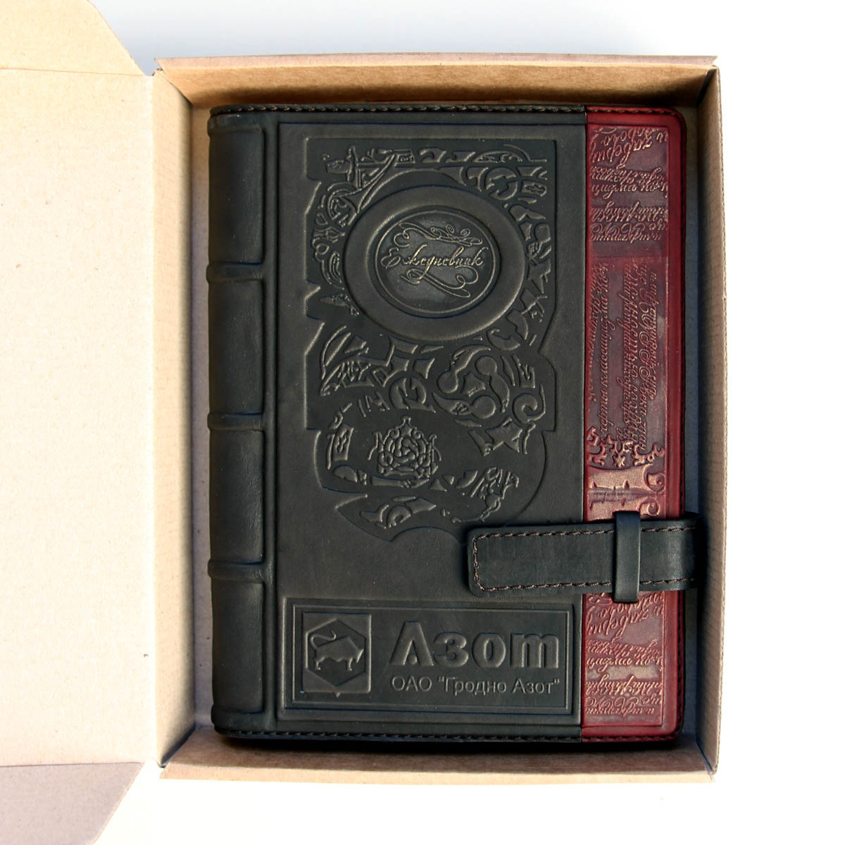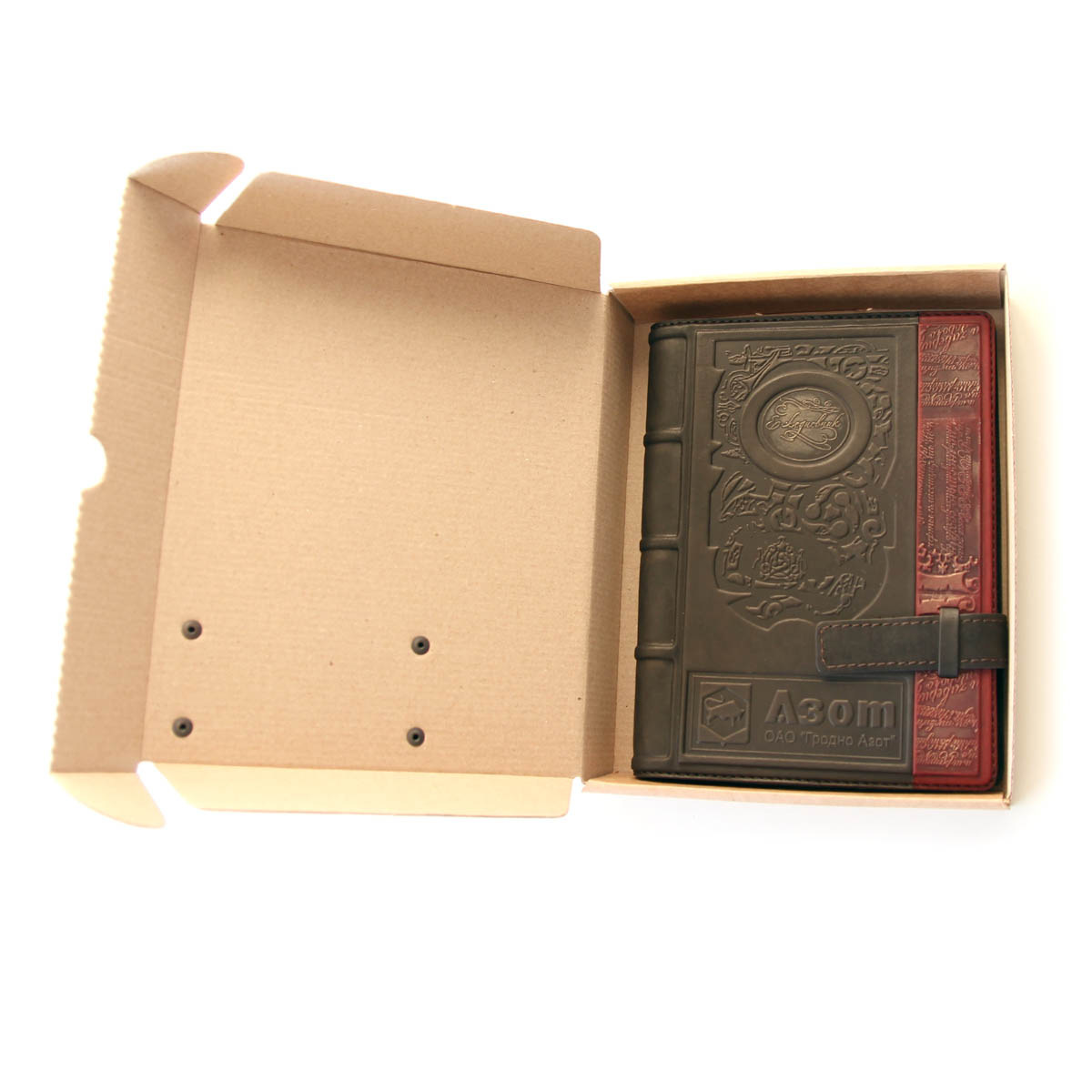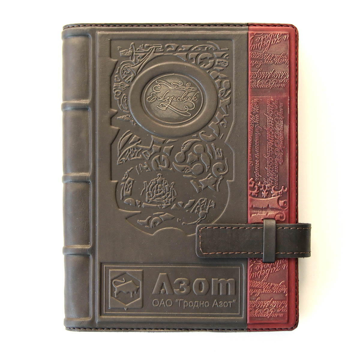 Пример изготовления ежедневника с нанесением логотипа. Ежедневник формата А5 в обложке из натуральной кожи с оригинальным тиснением.Сменный блок стандартного размера А5, изготовлен из лощеной бумаги высокого качества. На каждой странице в виде водяных знаков сделаны изображения памятников архитектуры. На выбор предлагается один из двух вариантов ежедневника: "Шедевры мирового зодчества" либо "Архитектура Беларуси". Оба варианта ежедневника недатированы, надписи на страницах дублируются на нескольких языках.Срез блока с трех сторон фольгирован "под золото". Обложка выполнена из высококачественной натуральной телячей кожи. Ежедневник упакован в картонную упаковку, на которой приделана кожаная бирка с логотипом заказчика. Ежедневники в кожаной обложке с логотипом изготавливаются под заказ от 10 единиц. Стоимость указана ориентировочная.