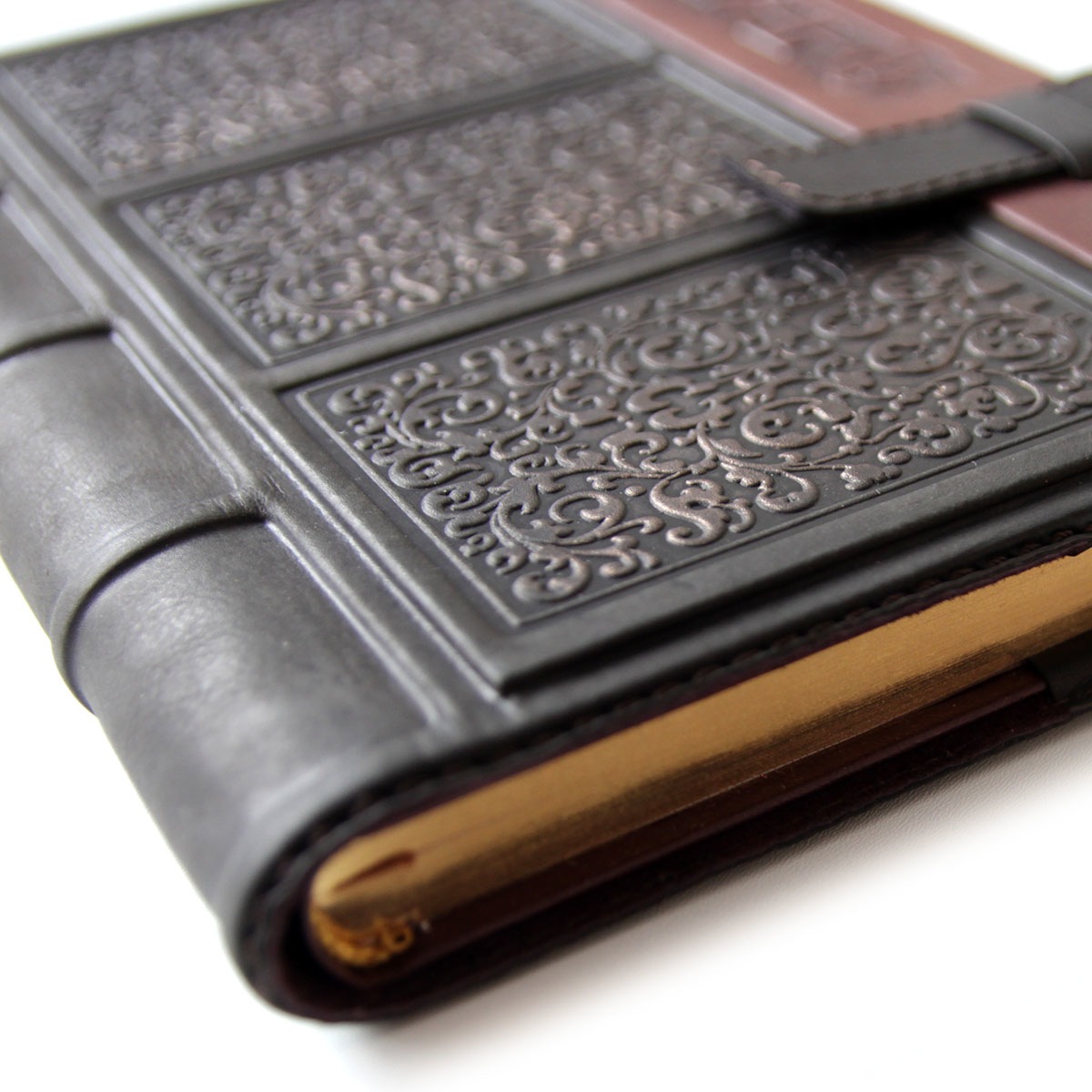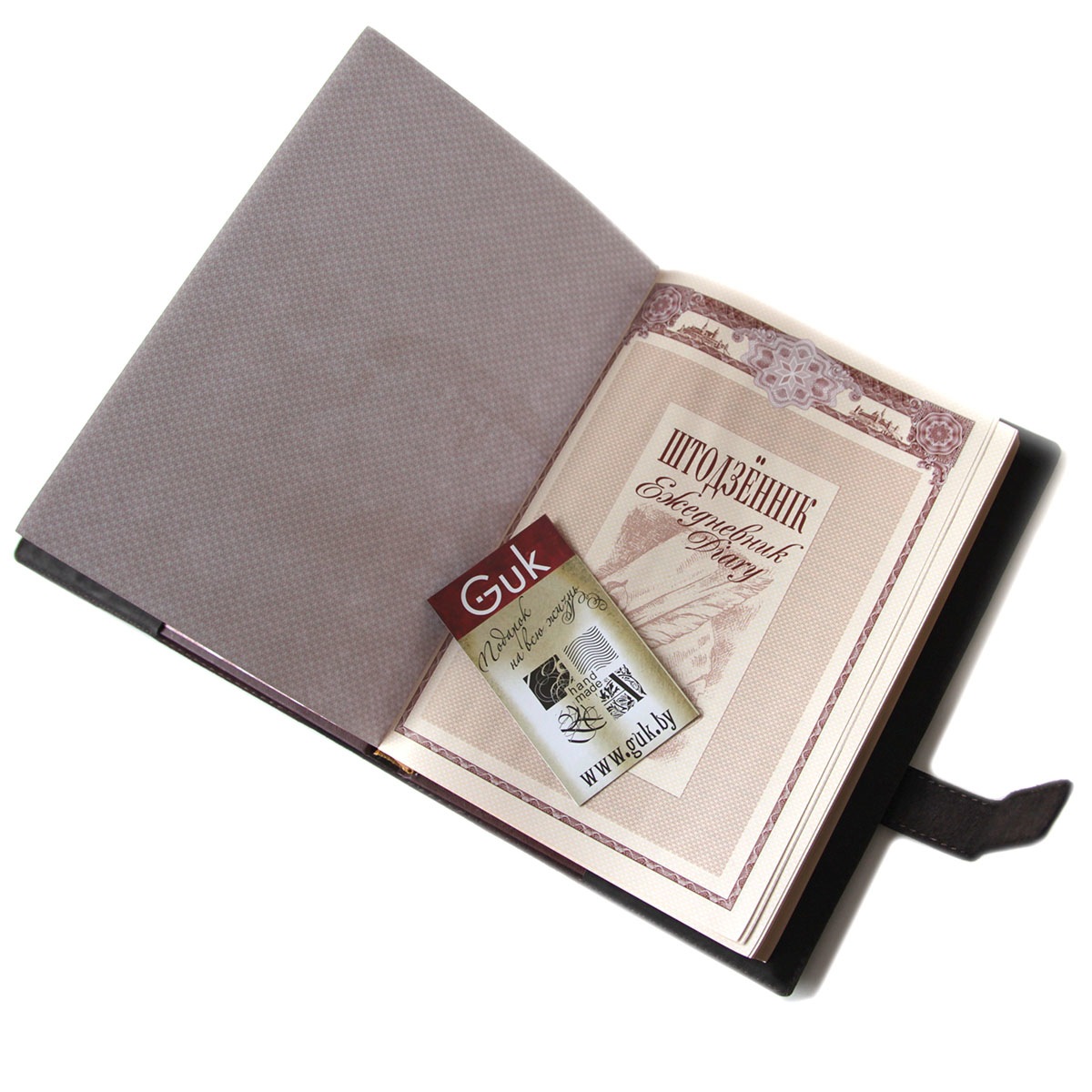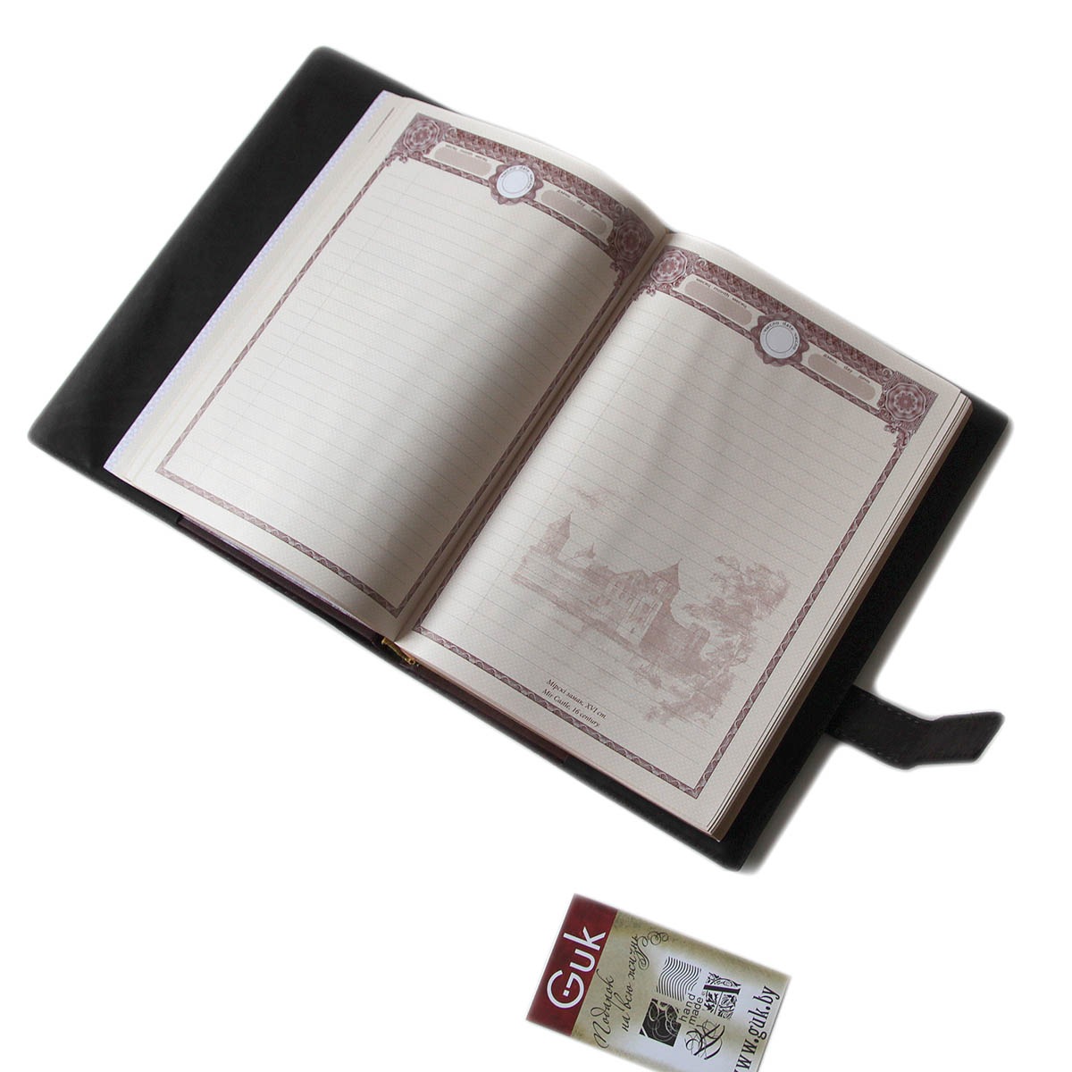Пример изготовления ежедневника с нанесением логотипа. Ежедневник формата А5 в обложке из натуральной кожи с оригинальным тиснением.Сменный блок стандартного размера А5, изготовлен из лощеной бумаги высокого качества. На каждой странице в виде водяных знаков сделаны изображения памятников архитектуры. На выбор предлагается один из двух вариантов ежедневника: "Шедевры мирового зодчества" либо "Архитектура Беларуси". Оба варианта ежедневника недатированы, надписи на страницах дублируются на нескольких языках.Срез блока с трех сторон фольгирован "под золото". Обложка выполнена из высококачественной натуральной телячей кожи. Ежедневник упакован в картонную упаковку, на которой приделана кожаная бирка с логотипом заказчика. Ежедневники в кожаной обложке с логотипом изготавливаются под заказ от 10 единиц.