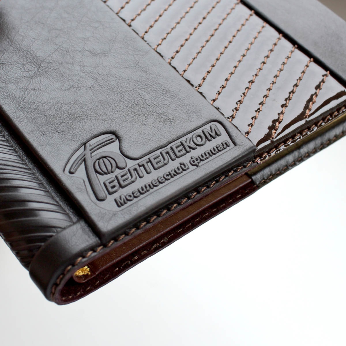 Пример изготовления ежедневника с нанесением логотипа. Ежедневник формата А5 в обложке из натуральной кожи с оригинальным тиснением.Сменный блок стандартного размера А5, изготовлен из лощеной бумаги высокого качества. На каждой странице в виде водяных знаков сделаны изображения памятников архитектуры. На выбор предлагается один из двух вариантов ежедневника: "Шедевры мирового зодчества" либо "Архитектура Беларуси". Оба варианта ежедневника недатированы, надписи на страницах дублируются на нескольких языках.Срез блока с трех сторон фольгирован "под золото". Обложка выполнена из высококачественной натуральной телячей кожи. Ежедневник упакован в картонную упаковку, на которой приделана кожаная бирка с логотипом заказчика. Ежедневники в кожаной обложке с логотипом изготавливаются под заказ от 10 единиц.