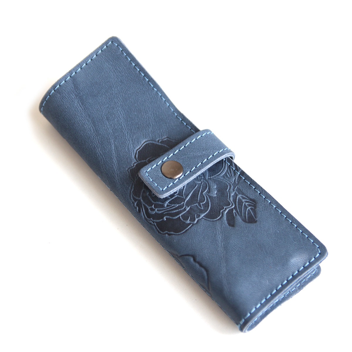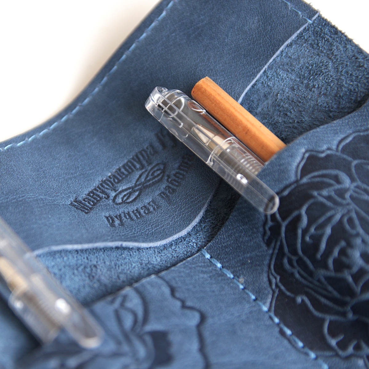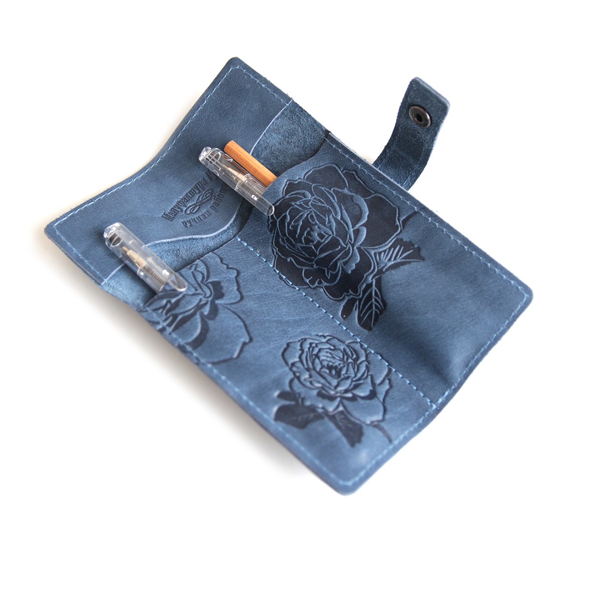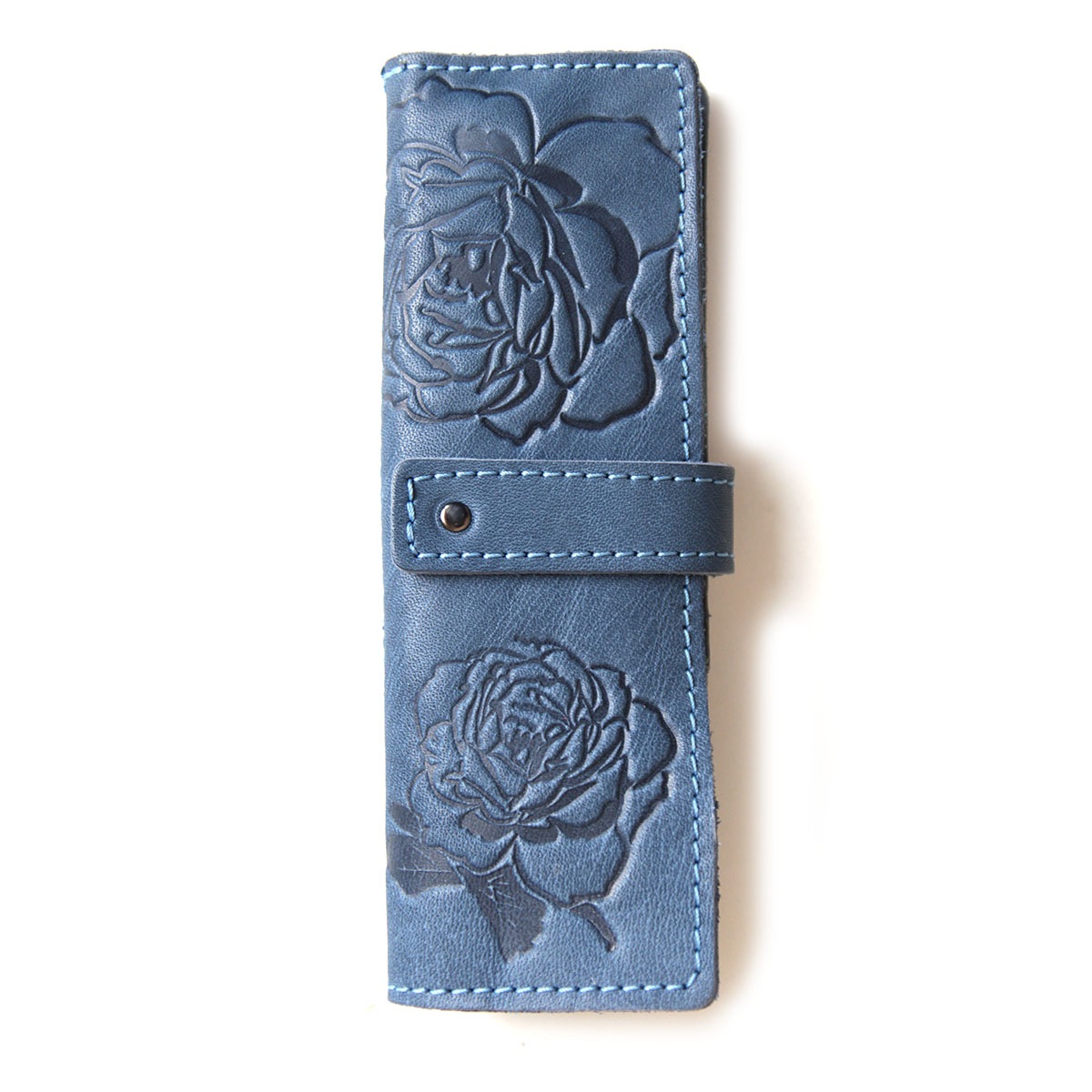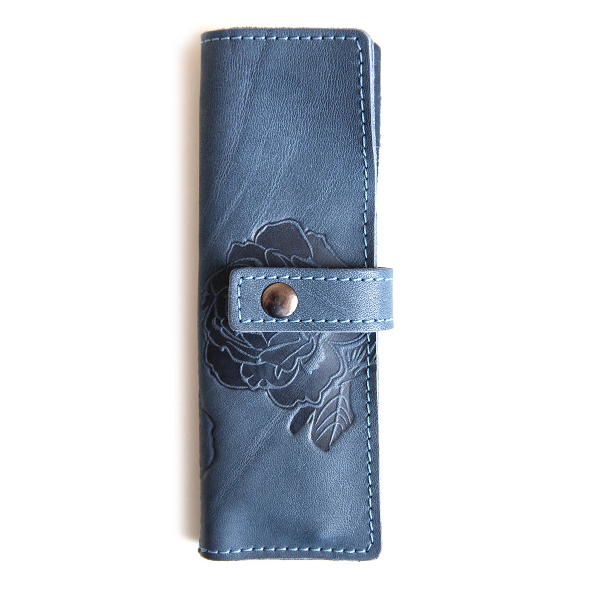 Футляр для ручки "PEONIES" из натуральной кожи с тиснением. Имеет два отделения для ручек или карандашей шириной по 6 см и высотой 12 см. Закрывается на кнопку.