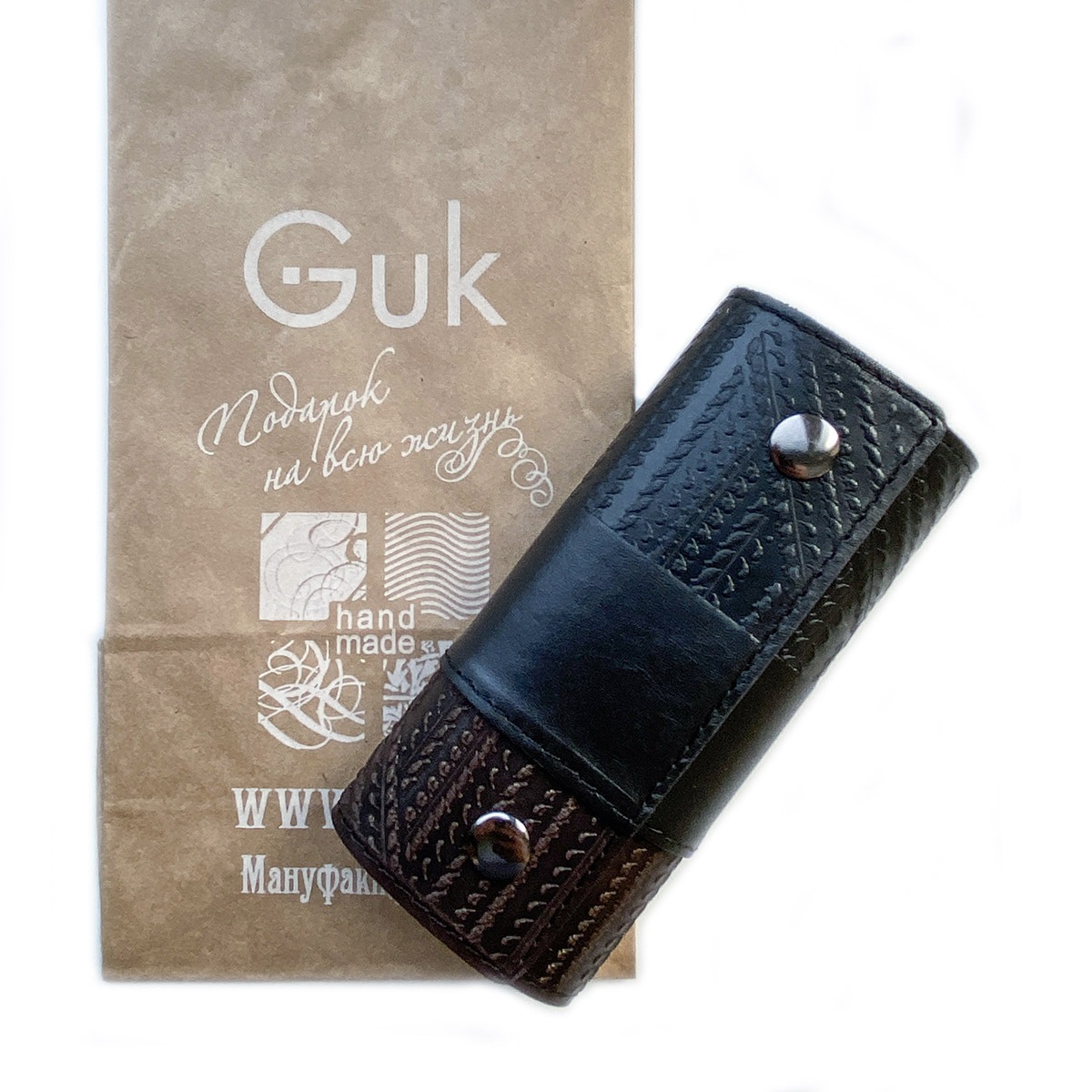 Ключница из высококачественной натуральной кожи. Ключница закрывается на две кнопки. Скручивается в трубочку, Имеет жесткую основу. Ключи крепятся на карабины.