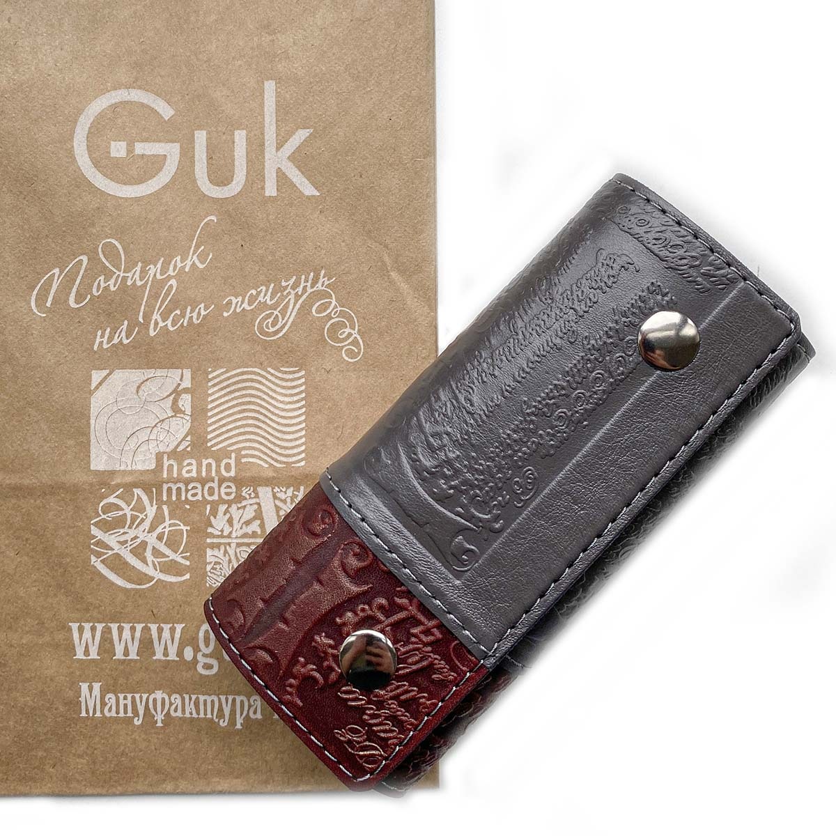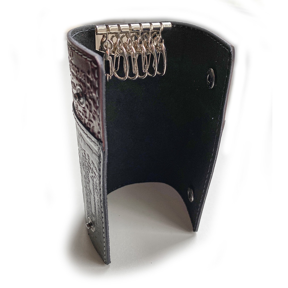 Ключница из высококачественной натуральной кожи с оригинальным тиснением. Ключница закрывается на две кнопки. Скручивается в трубочку, Имеет жесткую основу. Ключи крепятся на металлические карабины.