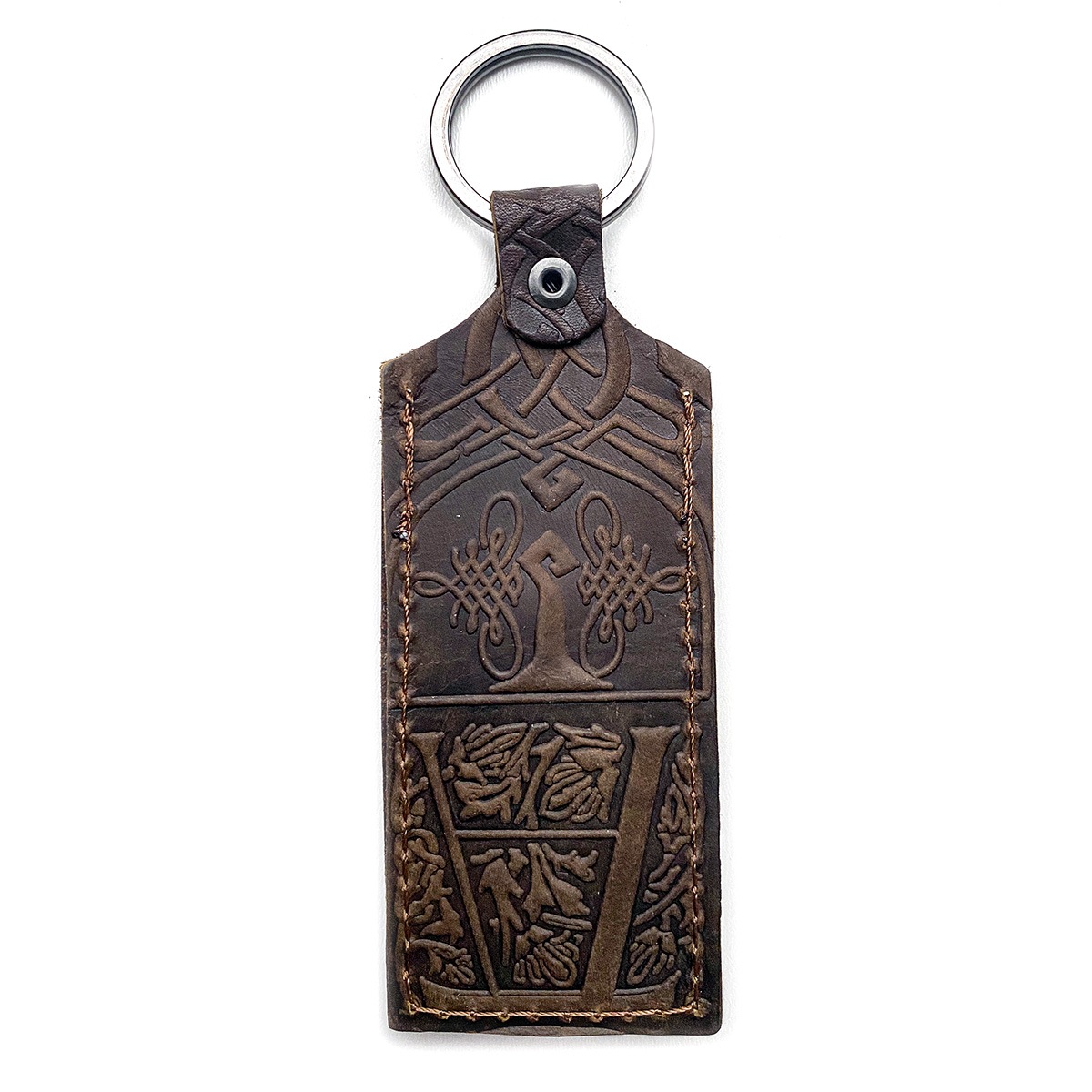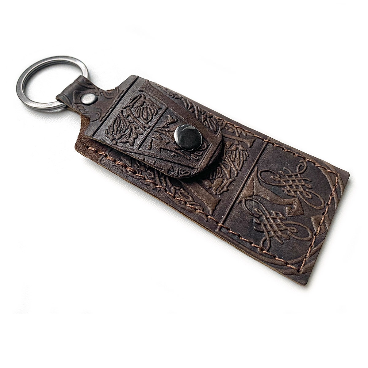 Кожаный брелок-футляр для флэшки из натуральной кожи с тиснением. Тиснение в ассортименте. Крепление к ключам при помощи кольца. Брелок закрывается на кнопку. Универсален, подходит к большинству USB-флэшек.