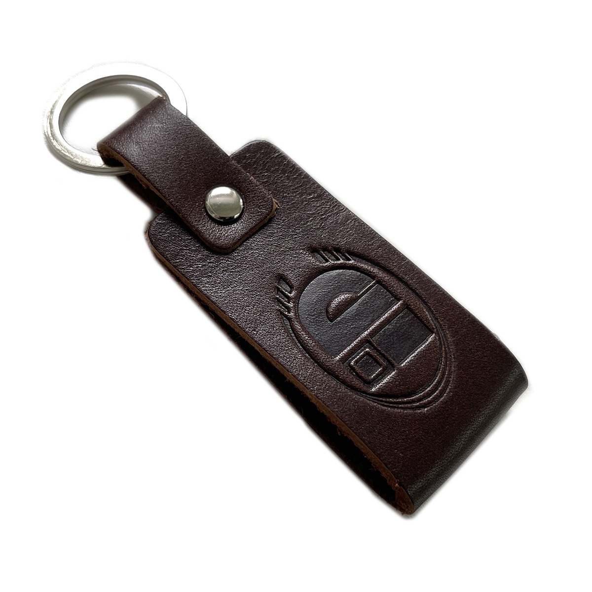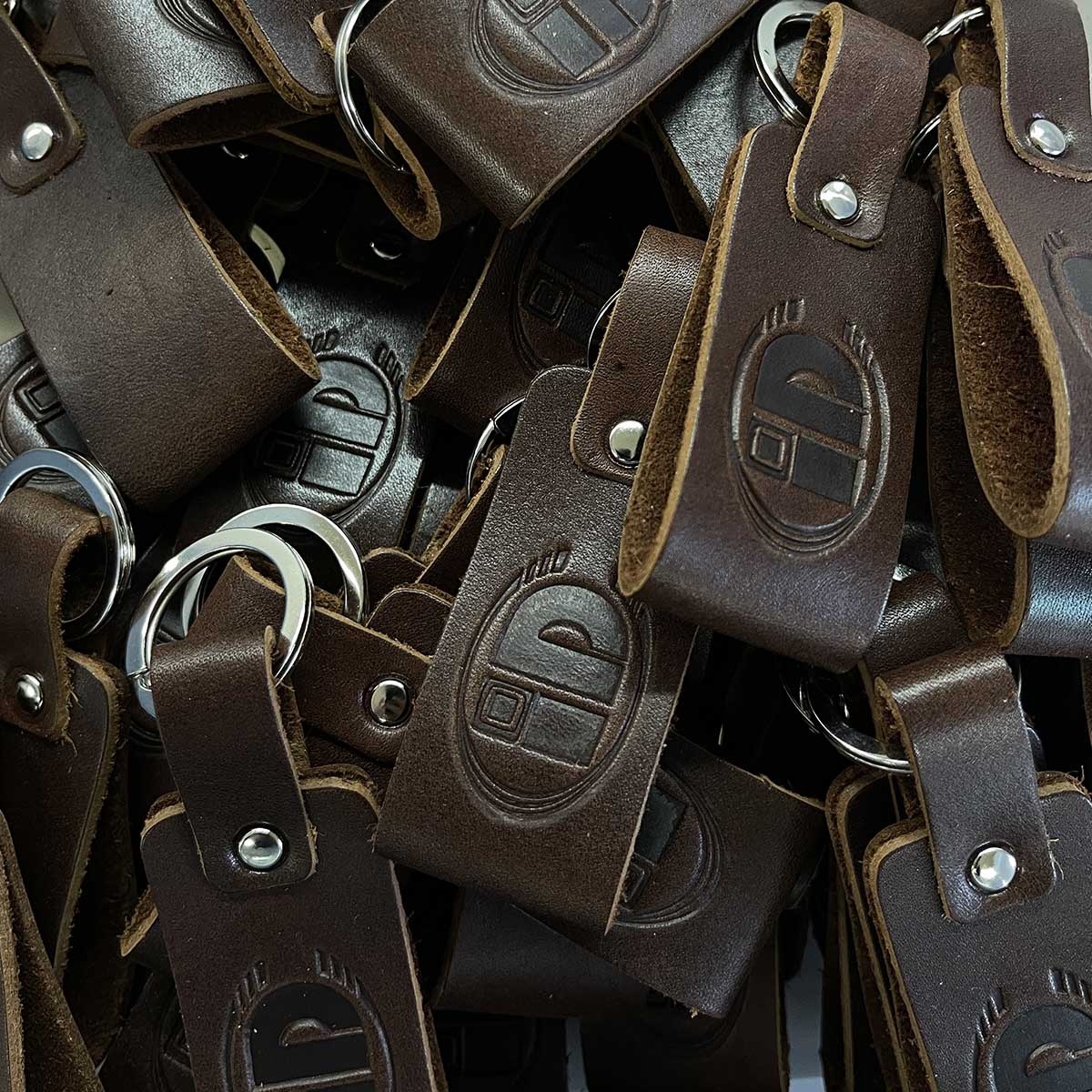 Кожаный брелок из натуральной кожи с тиснением. Тиснение логотипа. Крепление к ключам при помощи кольца. Данные брелки изготавливаем тиражем от 50 штук под заказ с вашим логотипом.