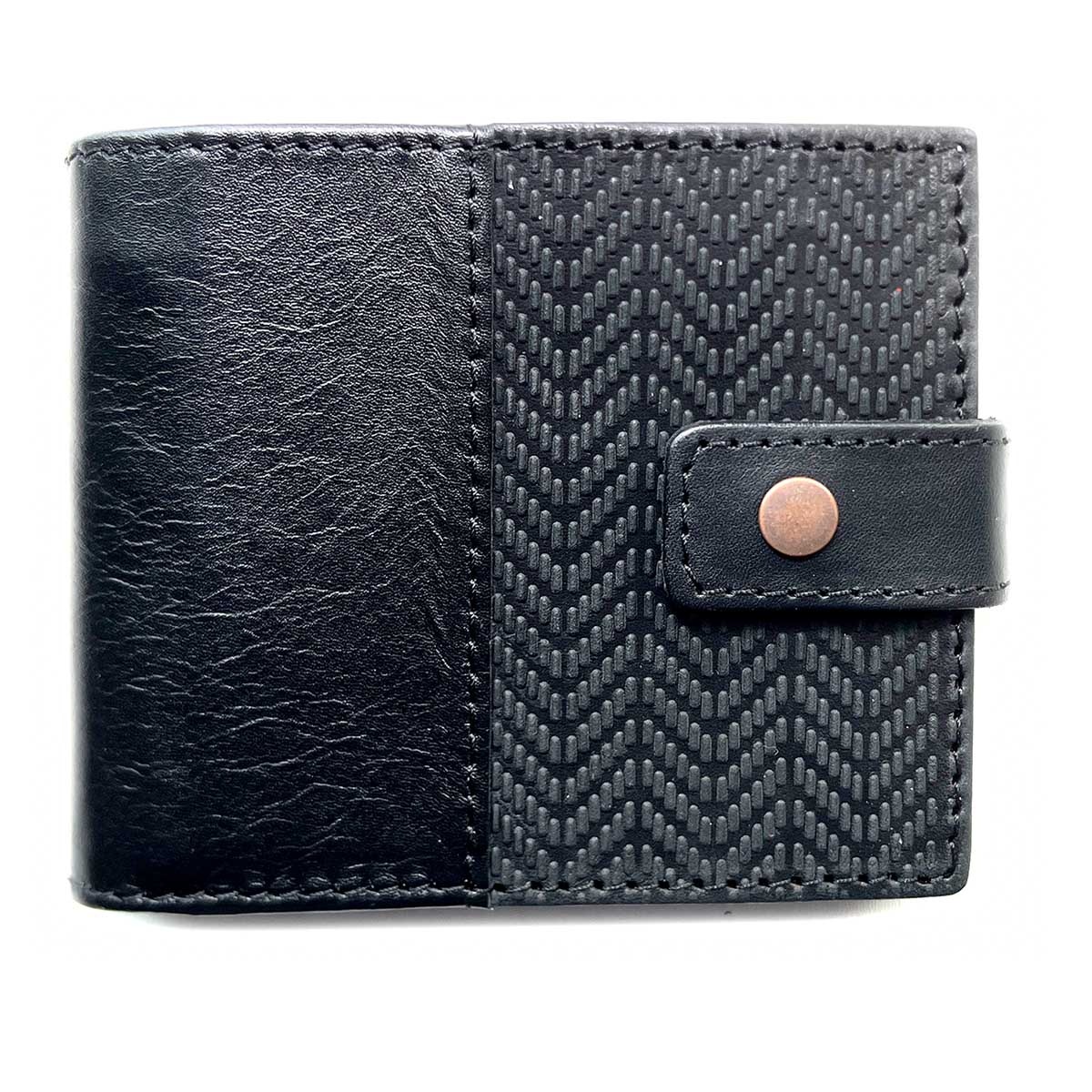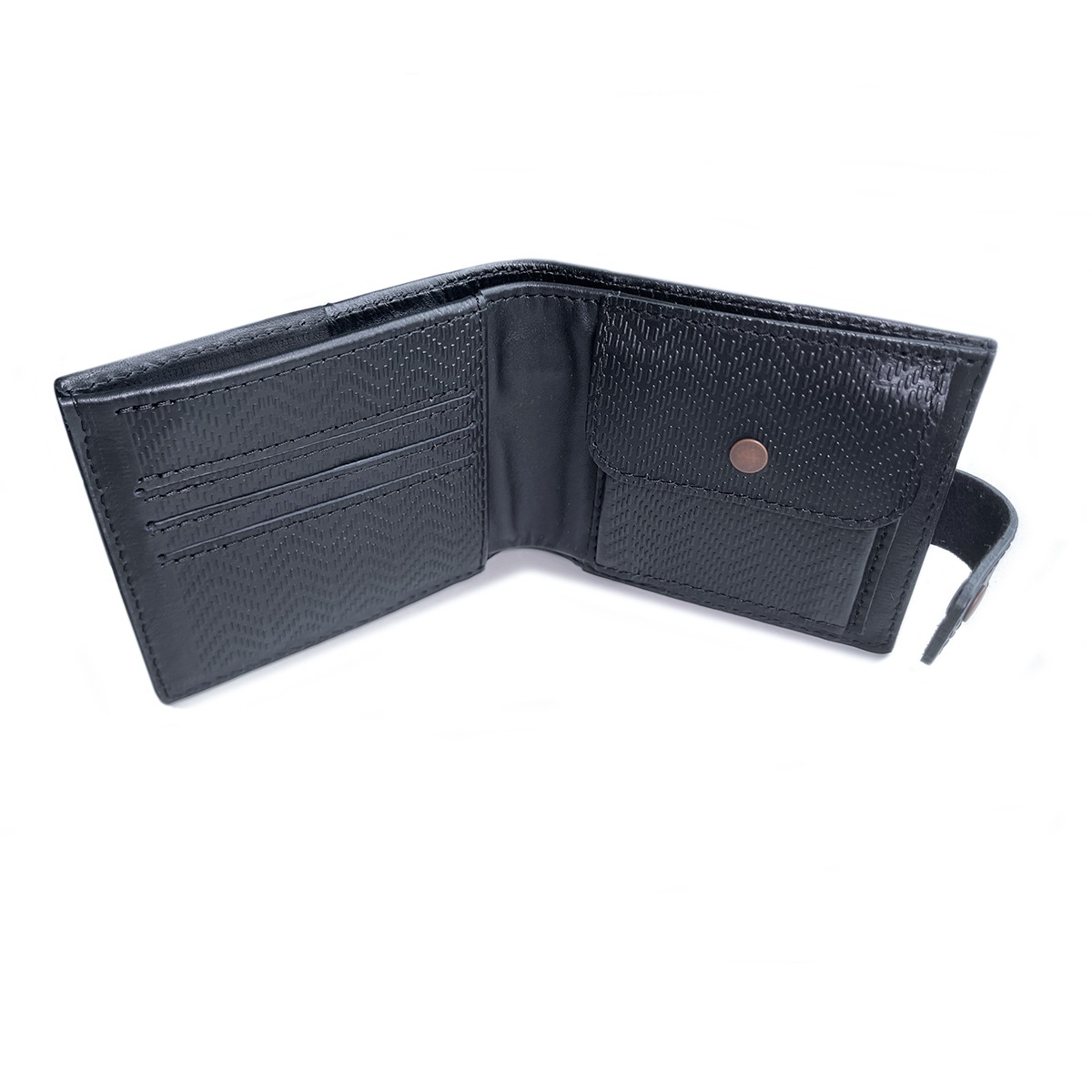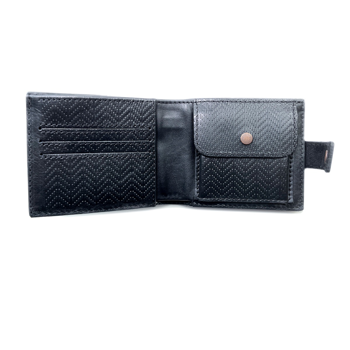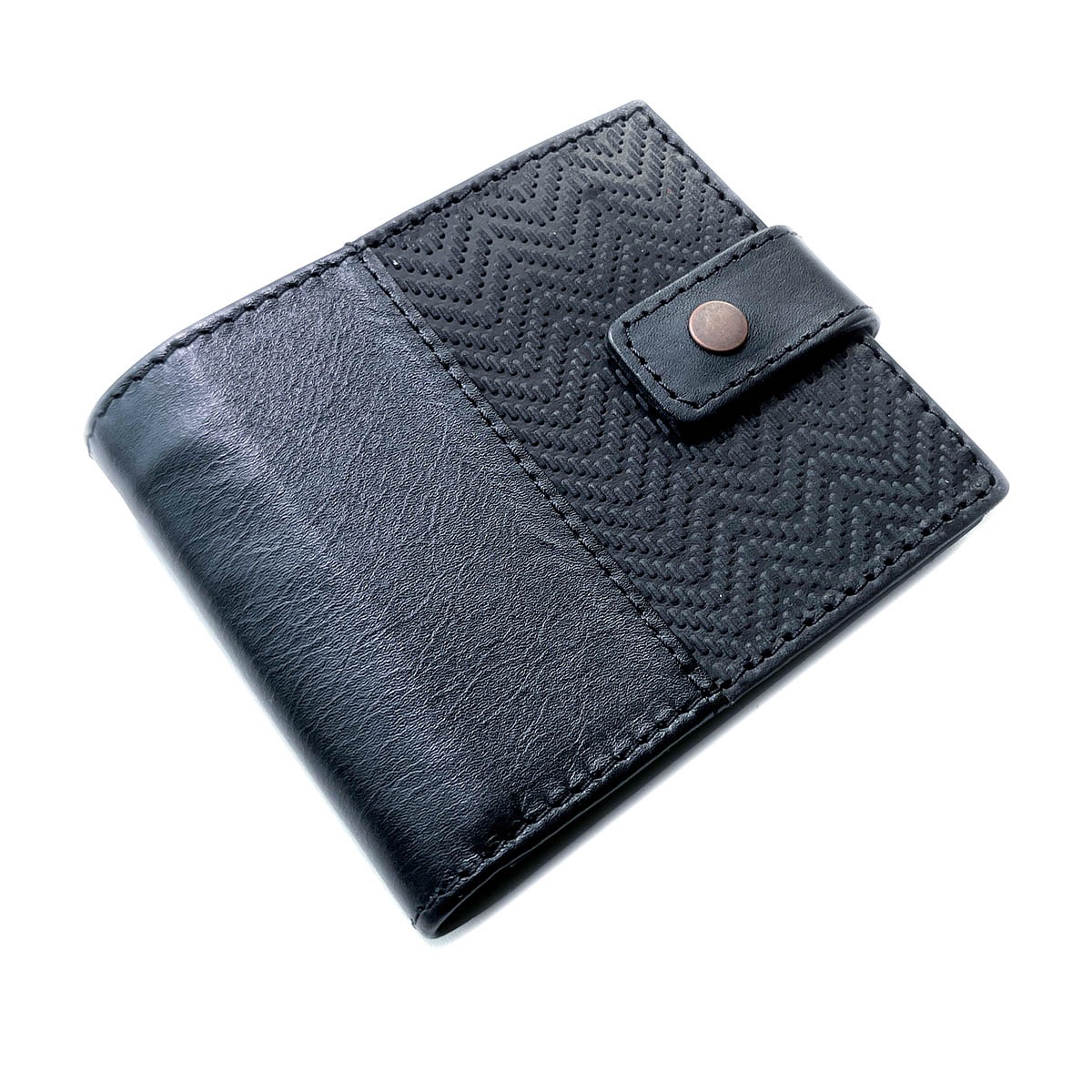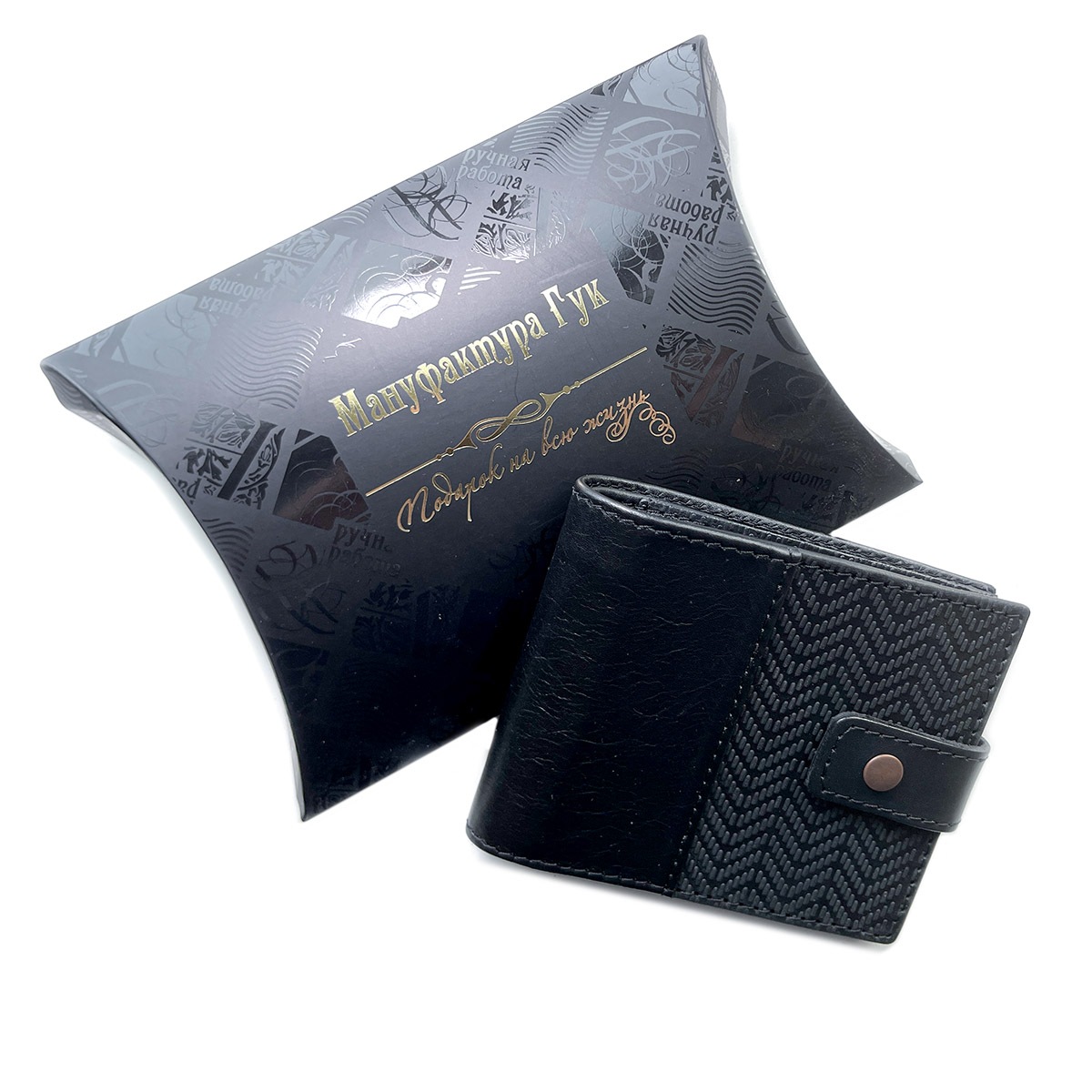 Кожаный кошелек classik "КОЛОС BLACK". Имеет 2 кармана для бумажных купюр плюс карман на молнии. Слева 3 кармана для карточек, справа карман для мелочи на кнопке.