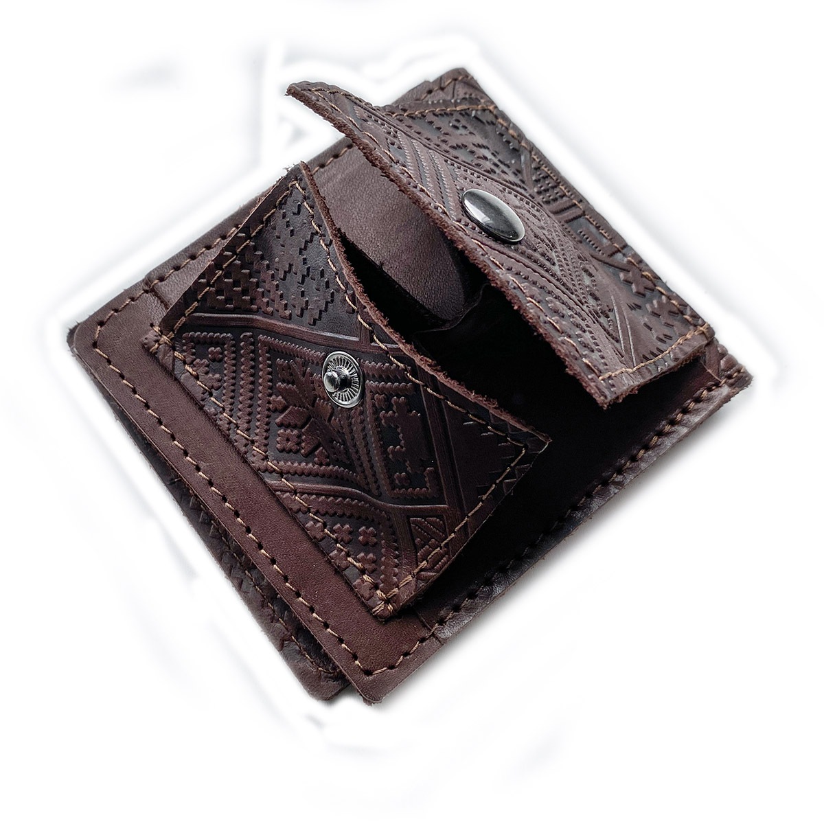 Кожаный кошелек ручной работы. Имеет 1 карман для бумажных купюр. 6 карманов для карточек. 1 карман-евромонетница для копеек.
