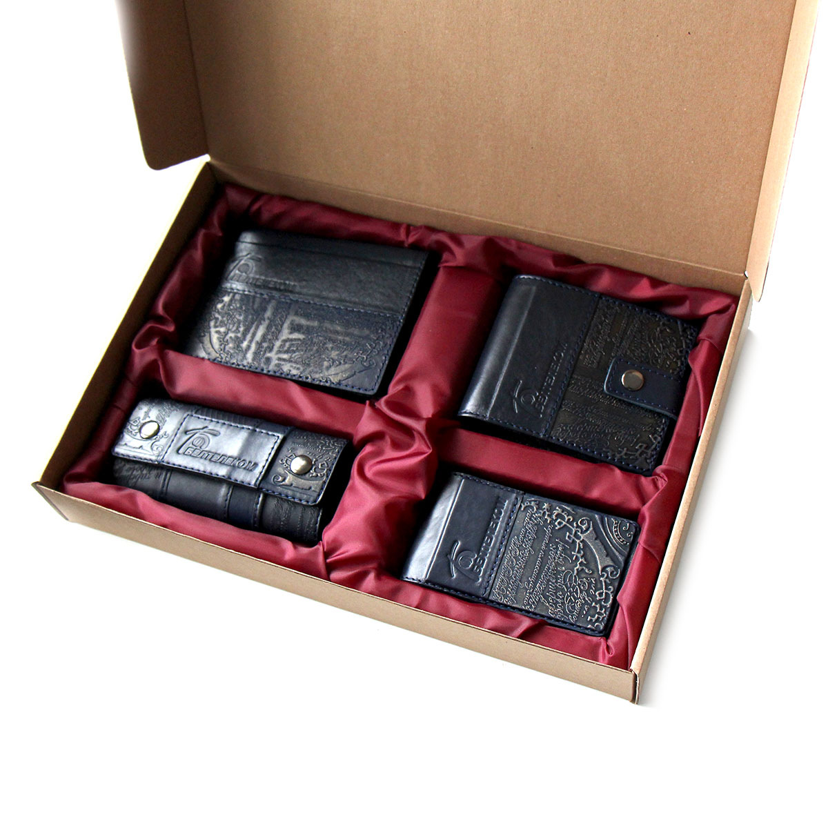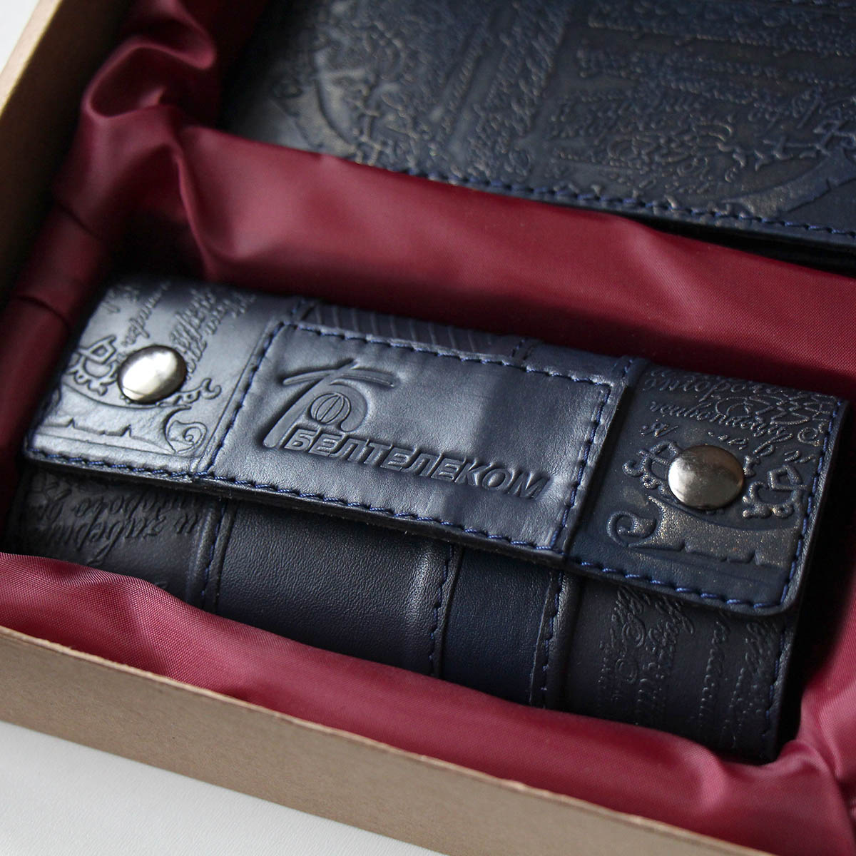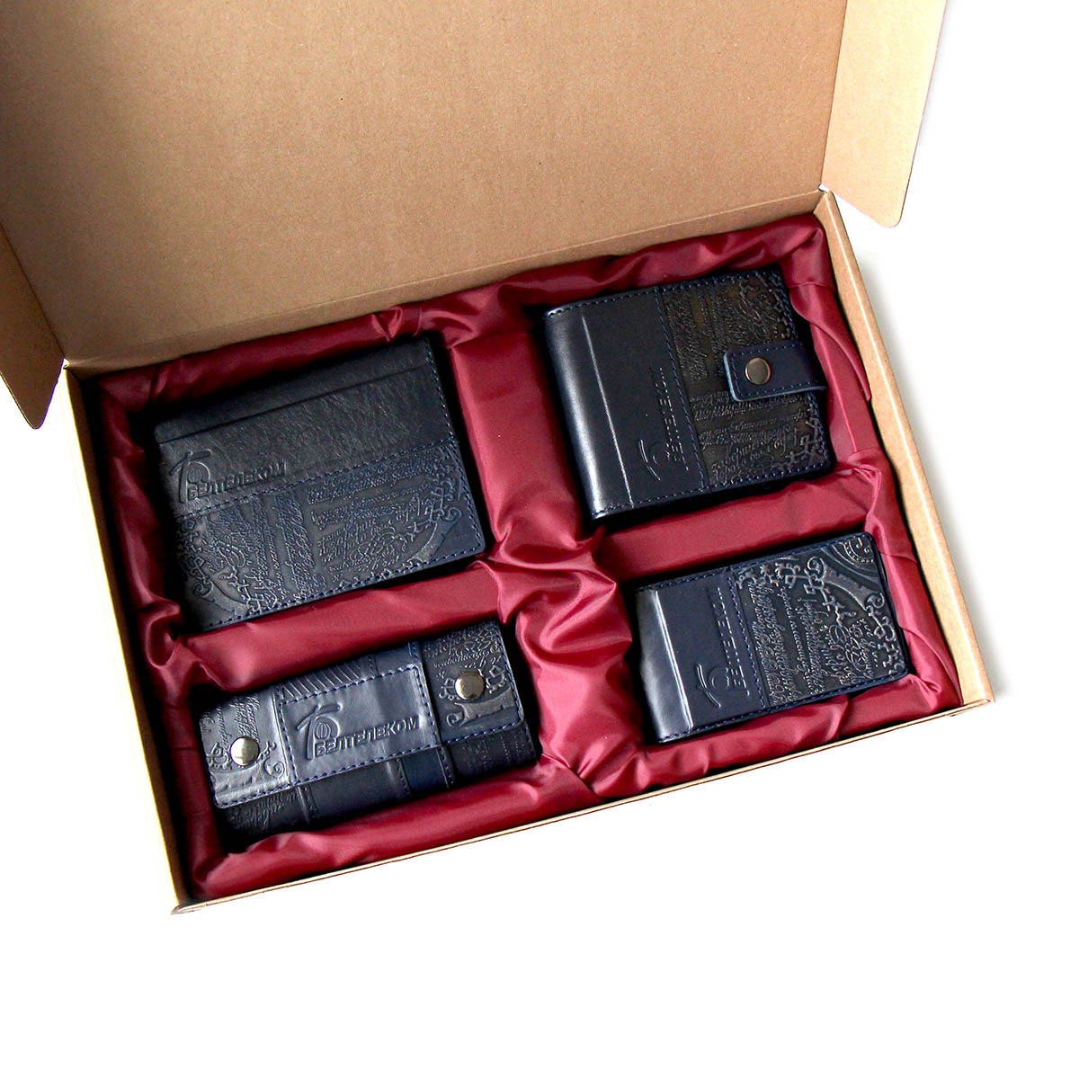 Пример набора подарочного с нанесением логотипа. Вы можете укомплектовать набор любыми нашими изделия в любом дизайне, из тех, которые есть у нас на сайте. Мануфактура Гук изготовит для вас любое количество наборов начиная от 5 наборов. Подарочный бокс из картона с ложементом из ткани и кожаной биркой с вашим логотипом. Размер бокса подбирается, исходя из расположения и количества наборов в изделии. Стоимость набора складывается из стоимости изделий, которыми он будет комплектоваться+стоимость подарочного бокса.