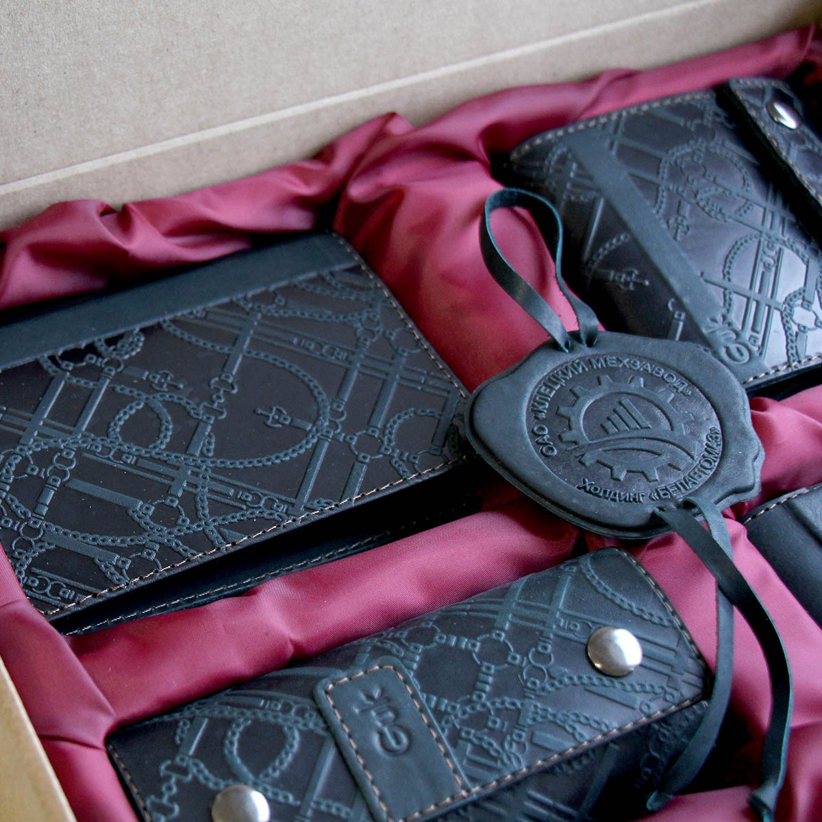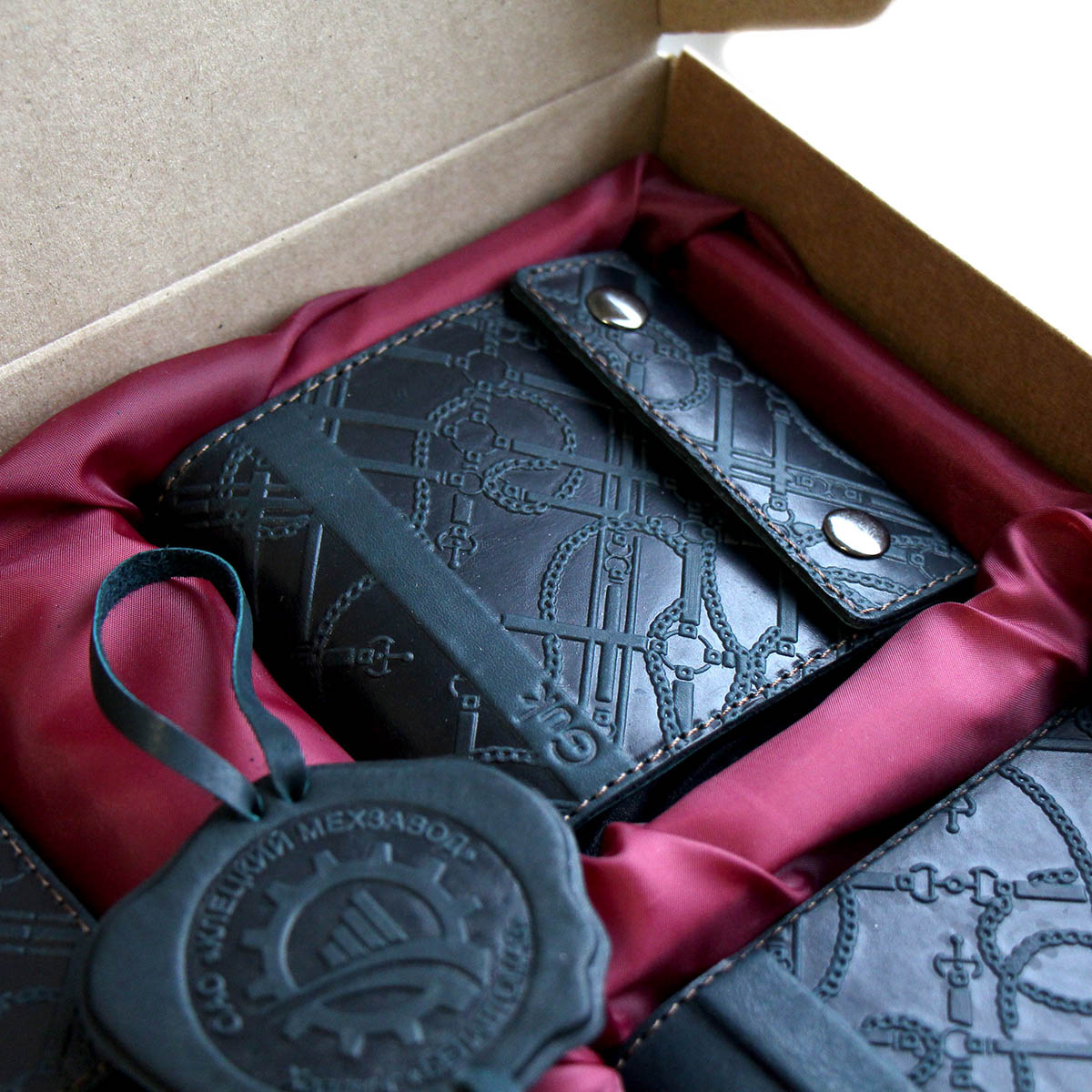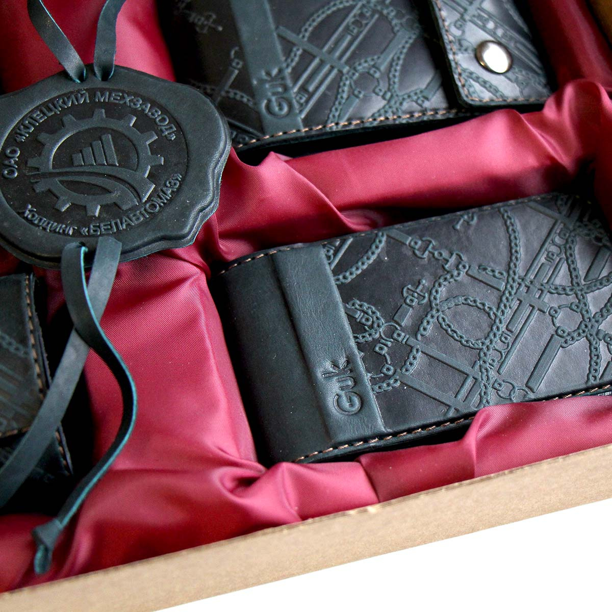 Пример набора подарочного с нанесением логотипа. Вы можете укомплектовать набор любыми нашими изделия в любом дизайне, из тех, которые есть у нас на сайте. Мануфактура Гук изготовит для вас любое количество наборов начиная от 5 наборов. Подарочный бокс из картона с ложементом из ткани и кожаной биркой с вашим логотипом. Размер бокса подбирается, исходя из расположения и количества наборов в изделии. Стоимость набора складывается из стоимости изделий, которыми он будет комплектоваться+стоимость подарочного бокса.