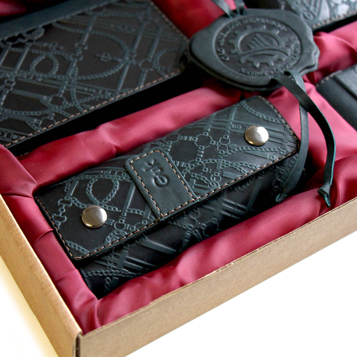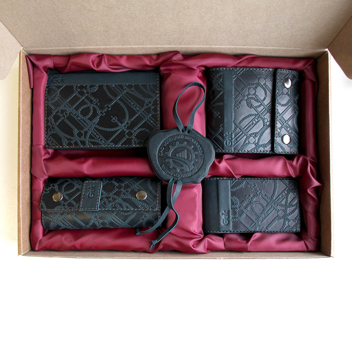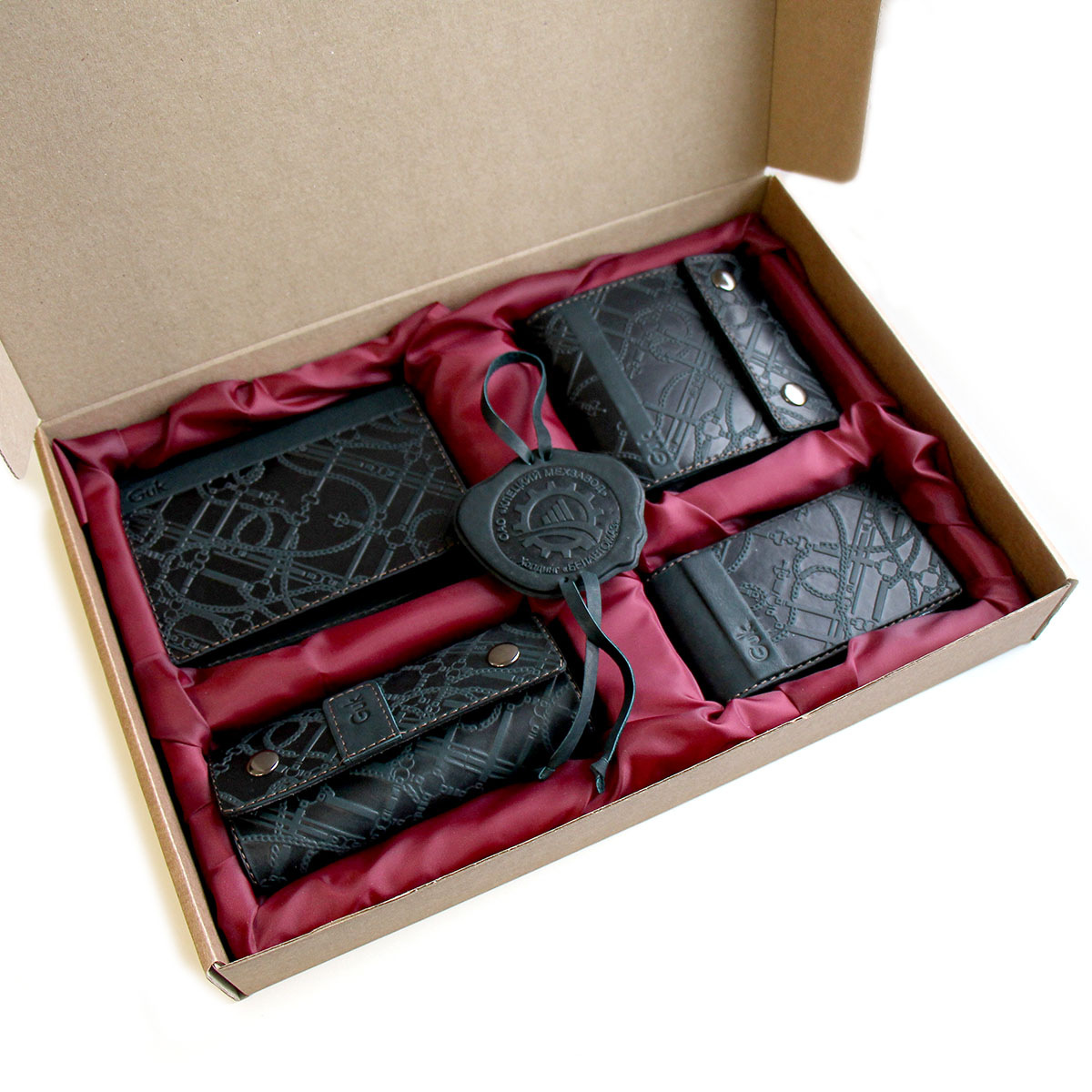 Пример набора подарочного с нанесением логотипа. Вы можете укомплектовать набор любыми нашими изделия в любом дизайне, из тех, которые есть у нас на сайте. Мануфактура Гук изготовит для вас любое количество наборов начиная от 5 наборов. Подарочный бокс из картона с ложементом из ткани и кожаной биркой с вашим логотипом. Размер бокса подбирается, исходя из расположения и количества наборов в изделии. Стоимость набора складывается из стоимости изделий, которыми он будет комплектоваться+стоимость подарочного бокса.