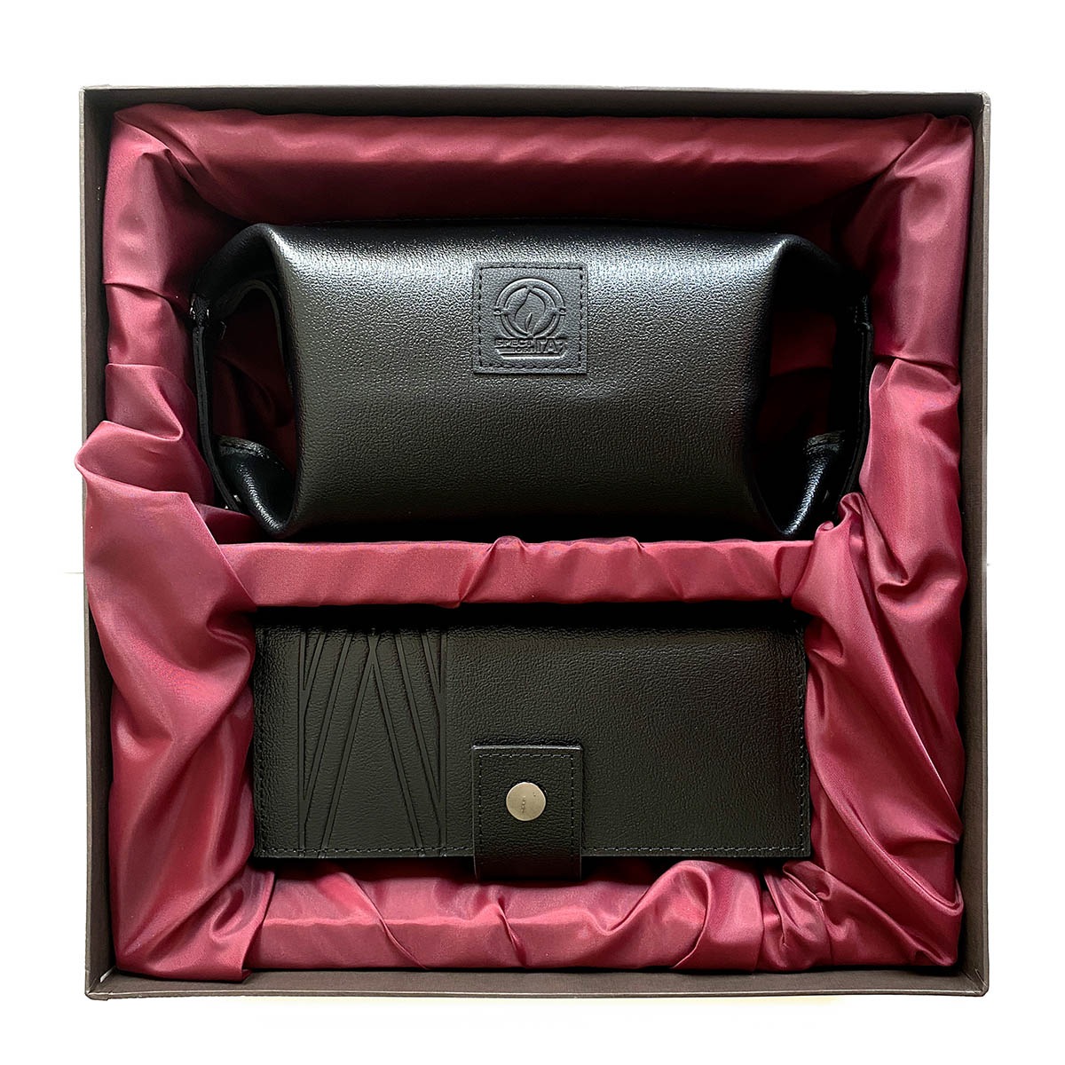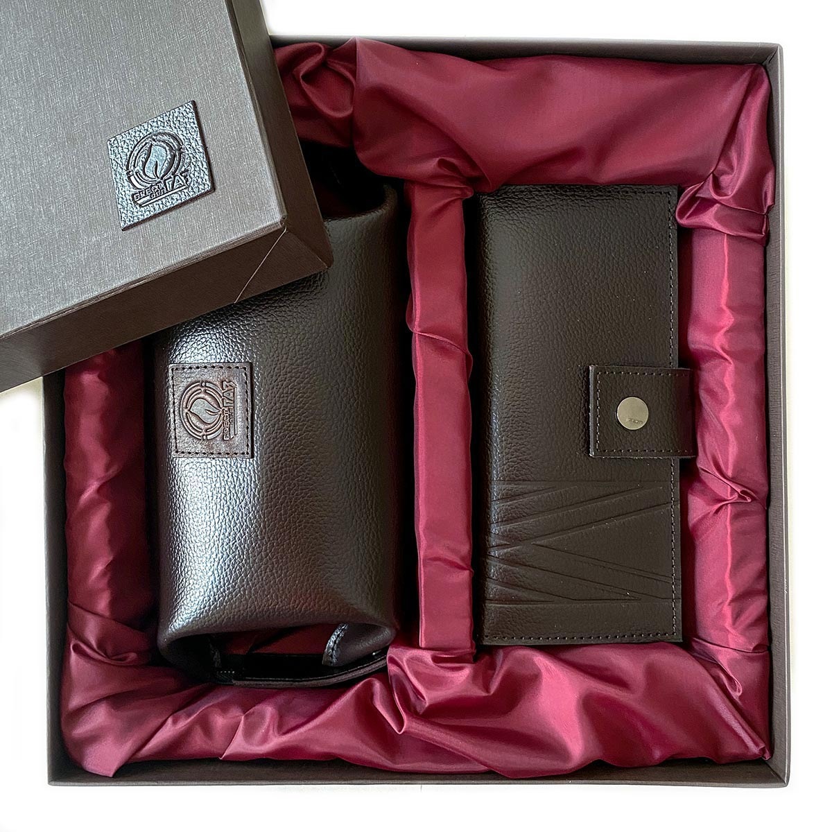 Пример набора подарочного с нанесением логотипа. Вы можете укомплектовать набор любыми нашими изделия в любом дизайне, из тех, которые есть у нас на сайте. Мануфактура Гук изготовит для вас любое количество. начиная от 5 наборов. Подарочный бокс из переплетного картона, обклеянного дизайнерской бумагой высокого качества, с ложементом из ткани и кожаной биркой с вашим логотипом. Размер бокса высчитывается, исходя из расположения и количества наборов в изделии. В данный набор входят большое портмоне и нессесер (футляр для предметов в поездке). На фото представлены два набора, в черном и коричневых цветах. Стоимость набора складывается из стоимости изделий, которыми он будет комплектоваться+стоимость подарочного бокса.