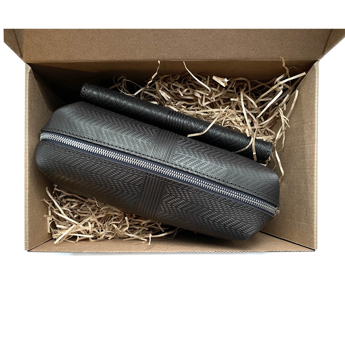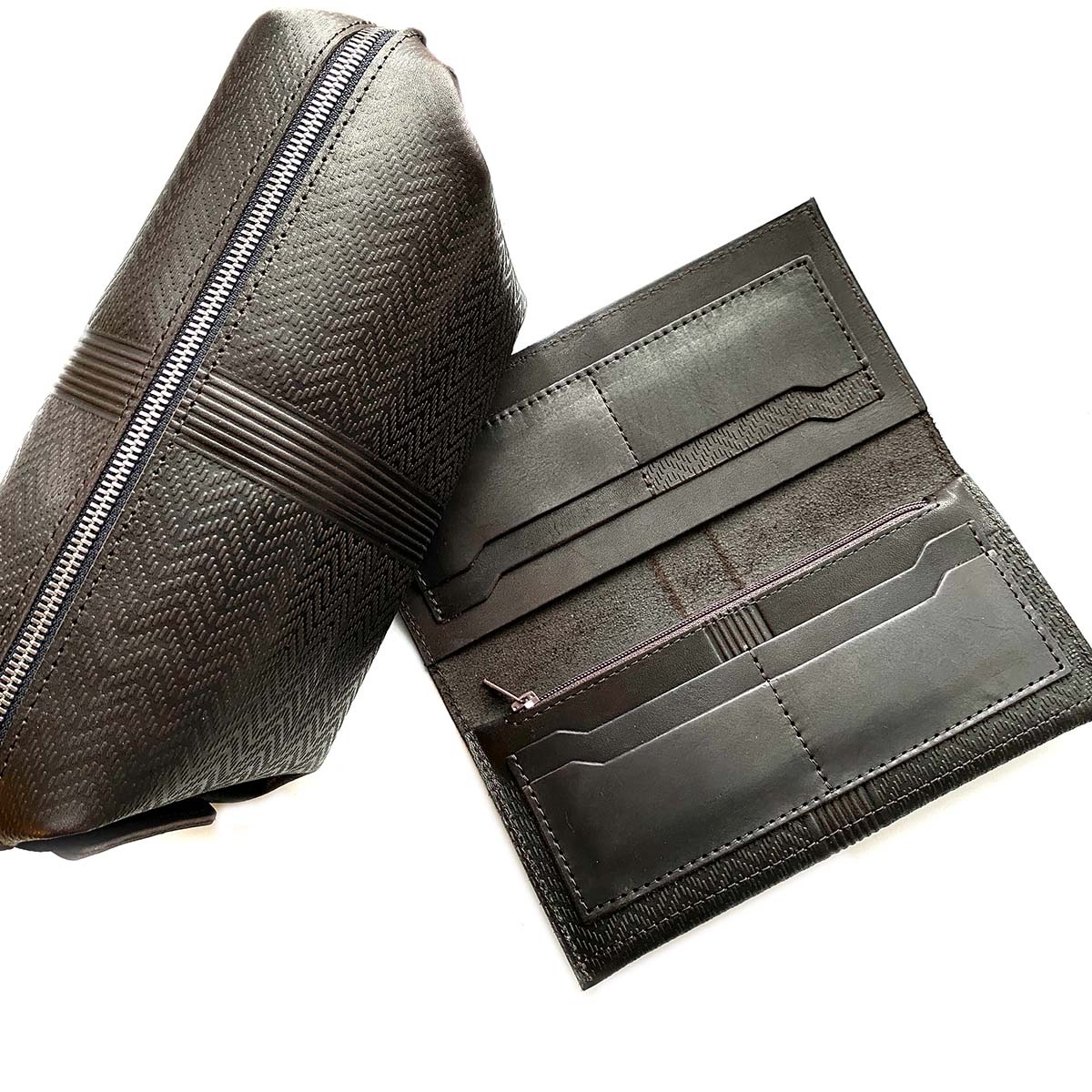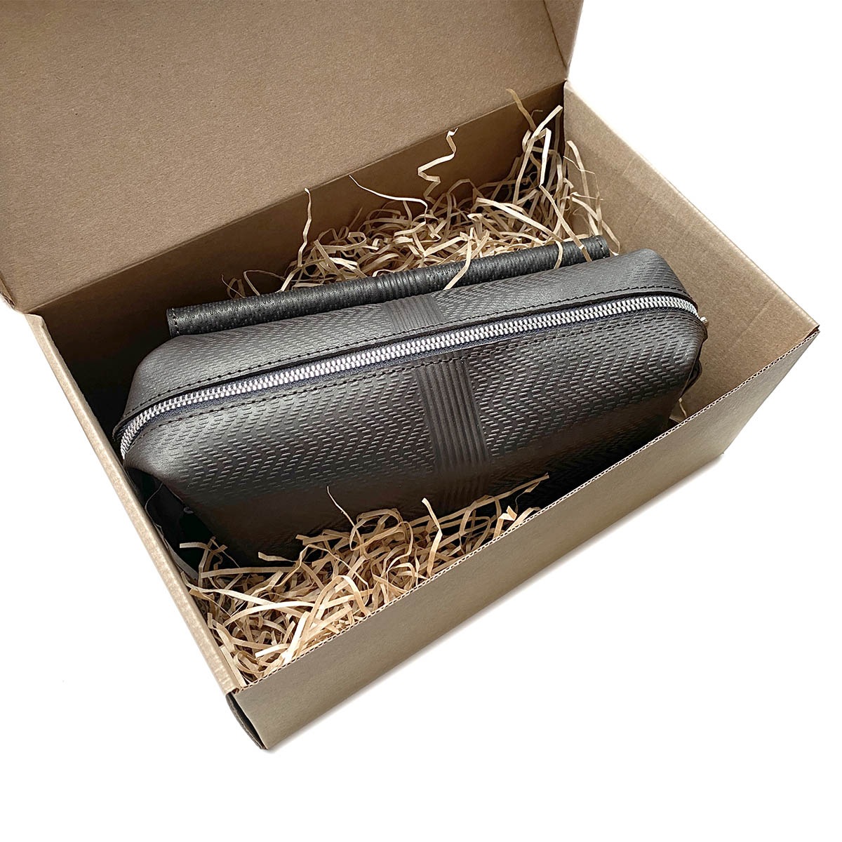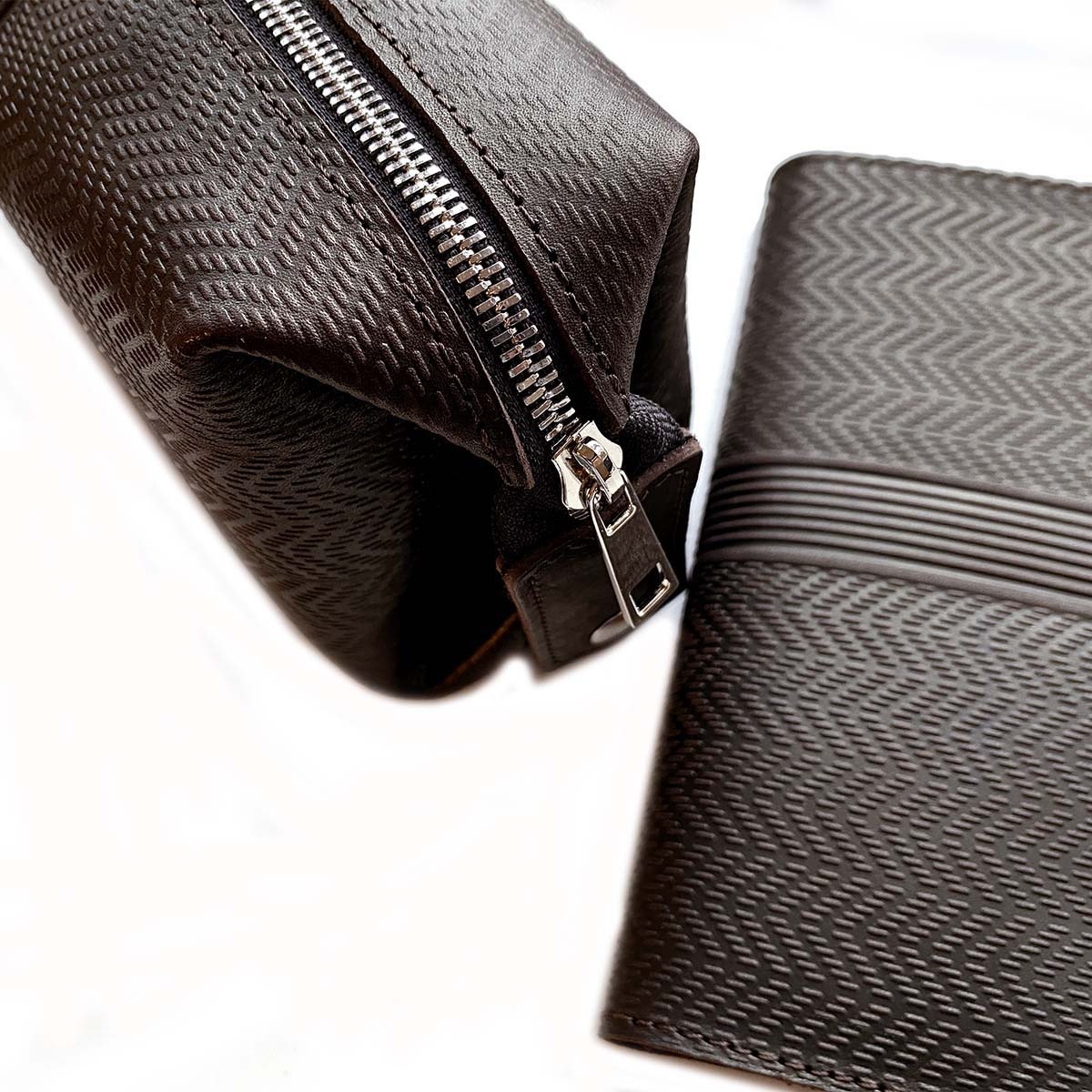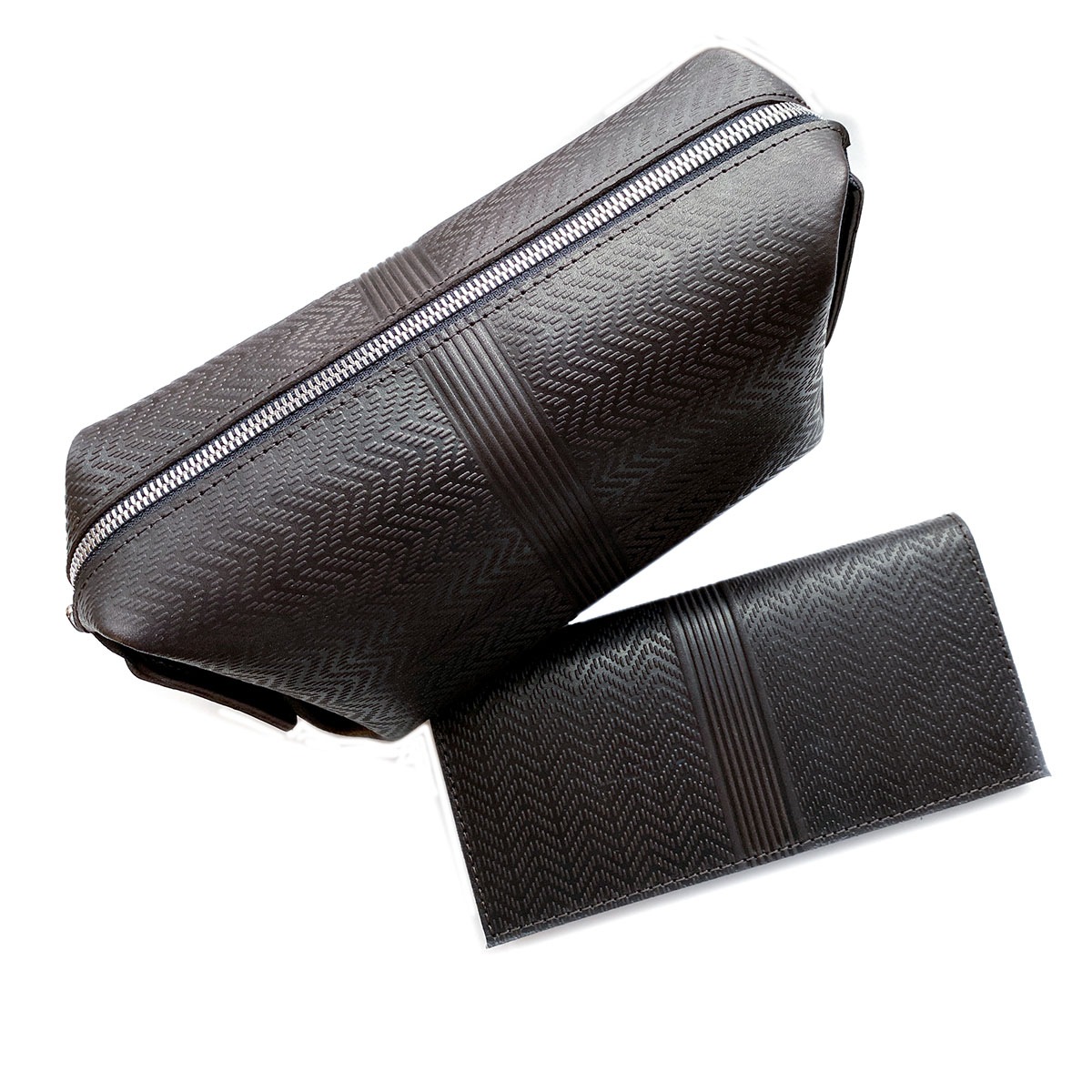 Подарочный набор из 4-х кожаных изделий в боксе из крафт-картона. В комплект набора входят:большое портмоне, несессер.