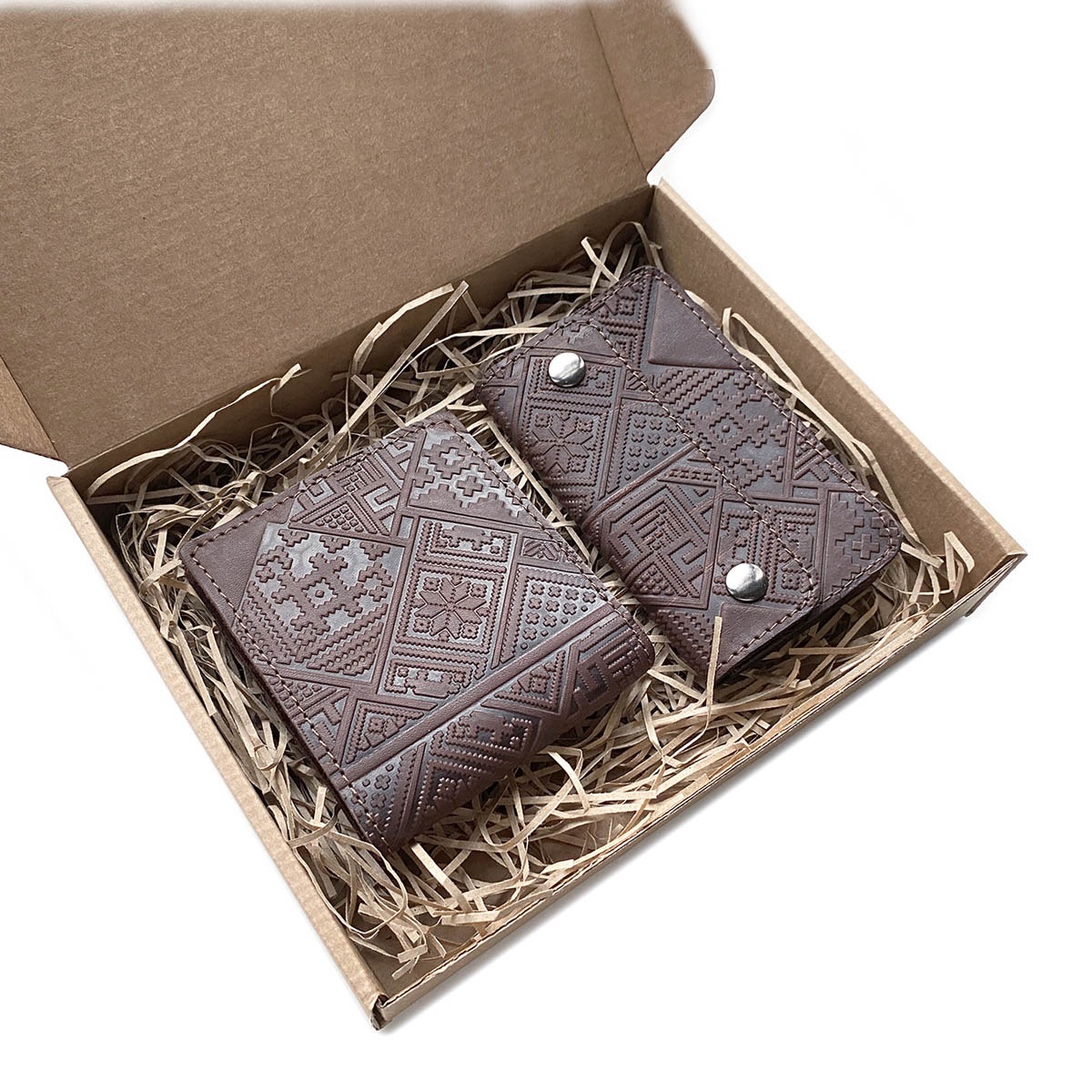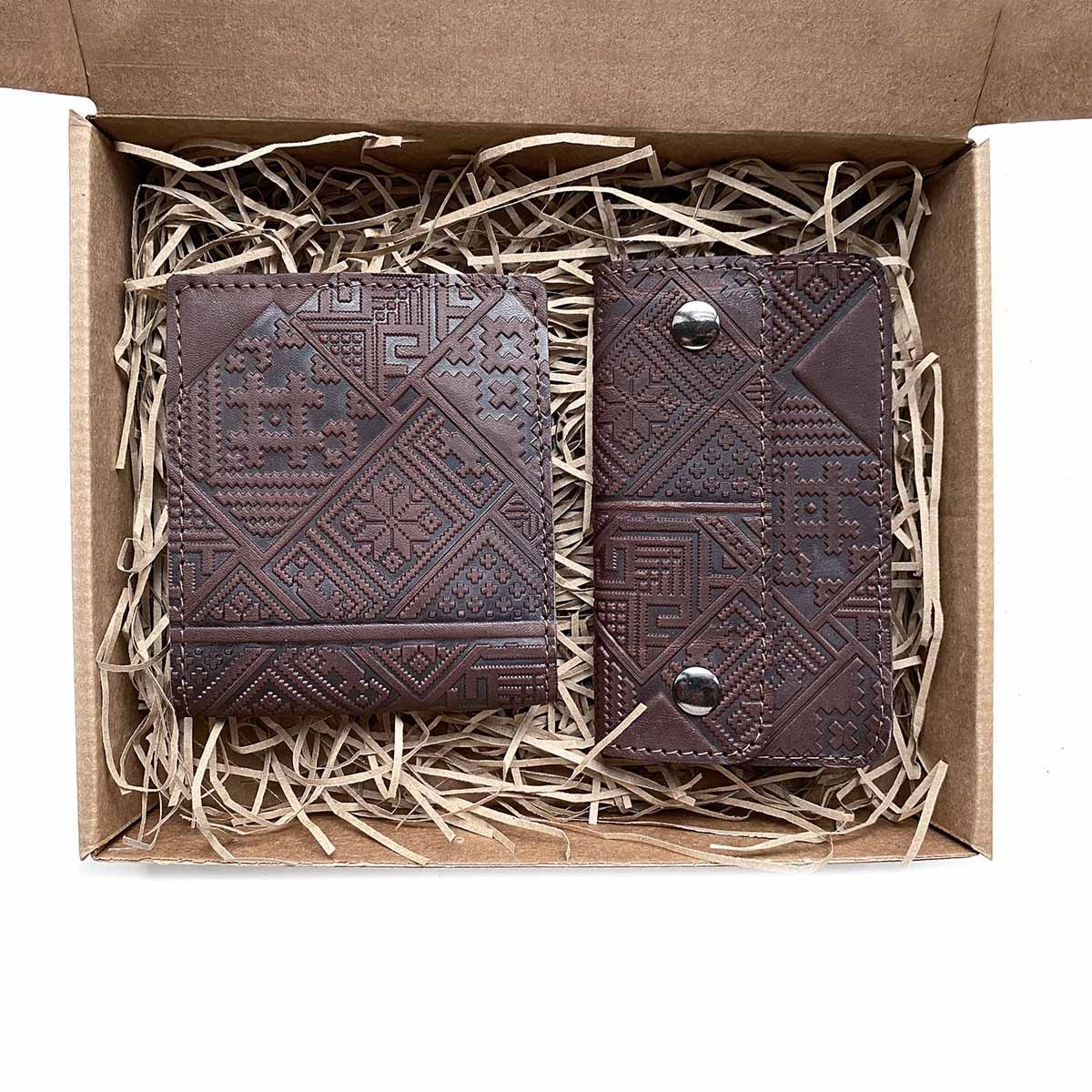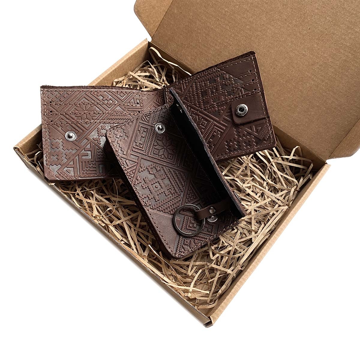 Подарочный набор из 4-х кожаных изделий в боксе из крафт-картона. В комплект набора входят: портмоне с евромонетницей, ключница.