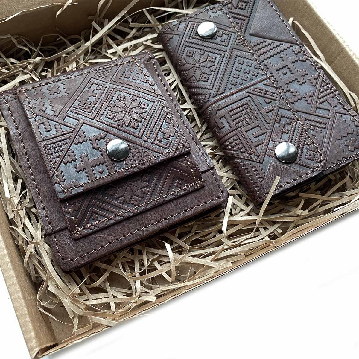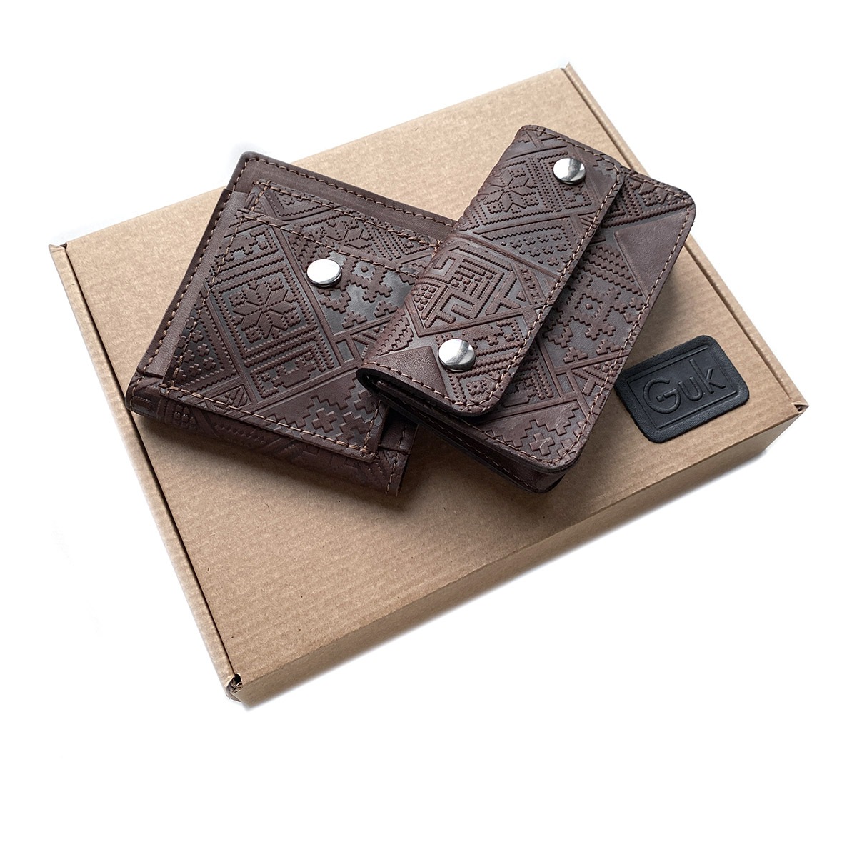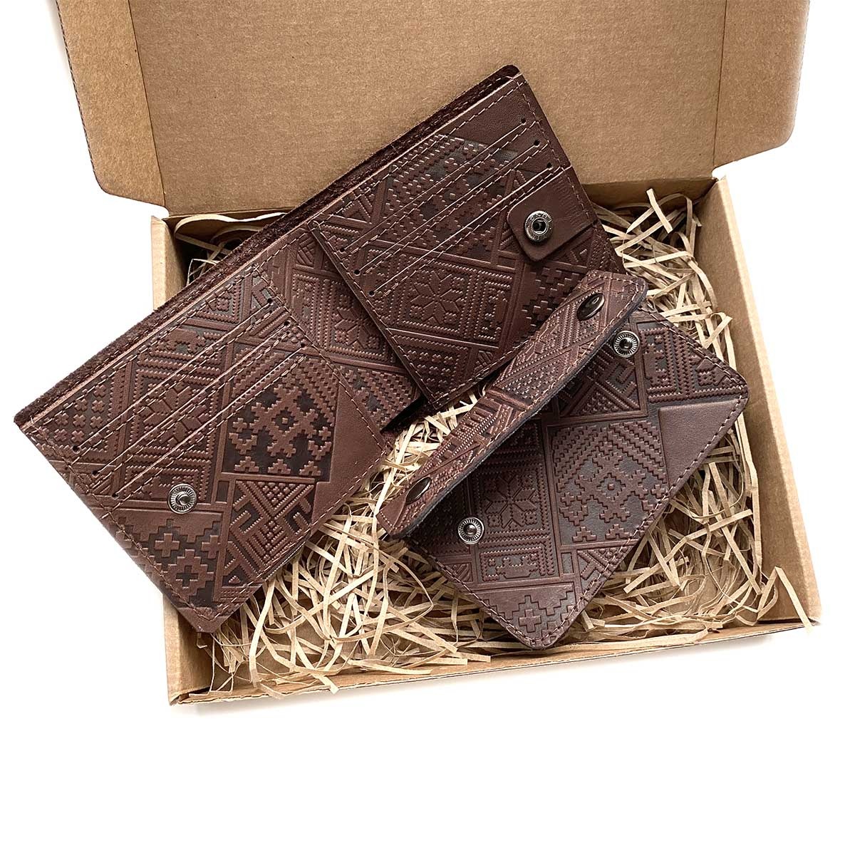 Подарочный набор из 4-х кожаных изделий в боксе из крафт-картона. В комплект набора входят: портмоне с евромонетницей, ключница.