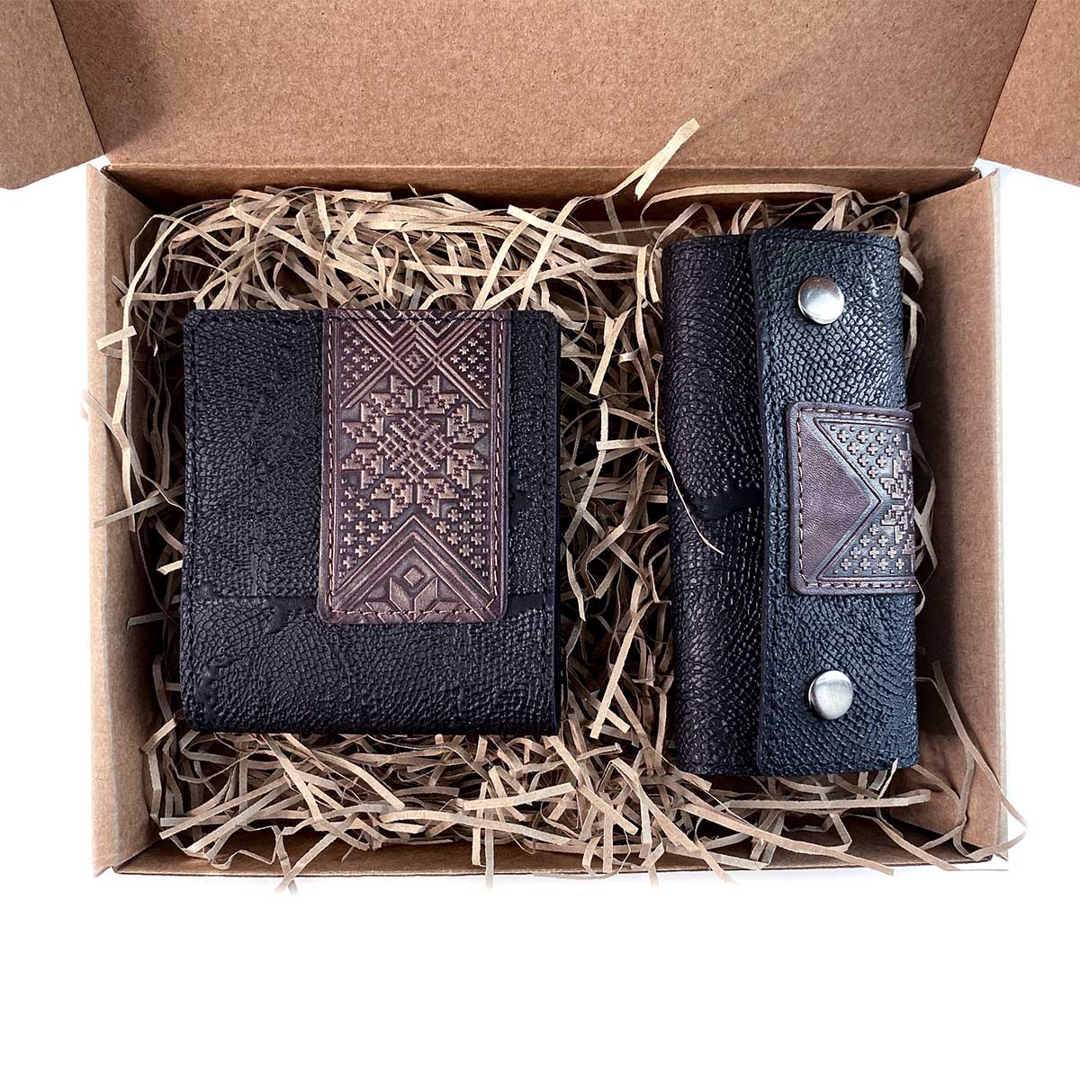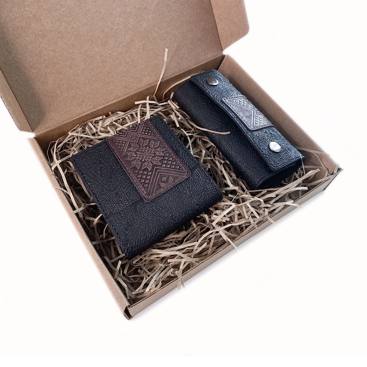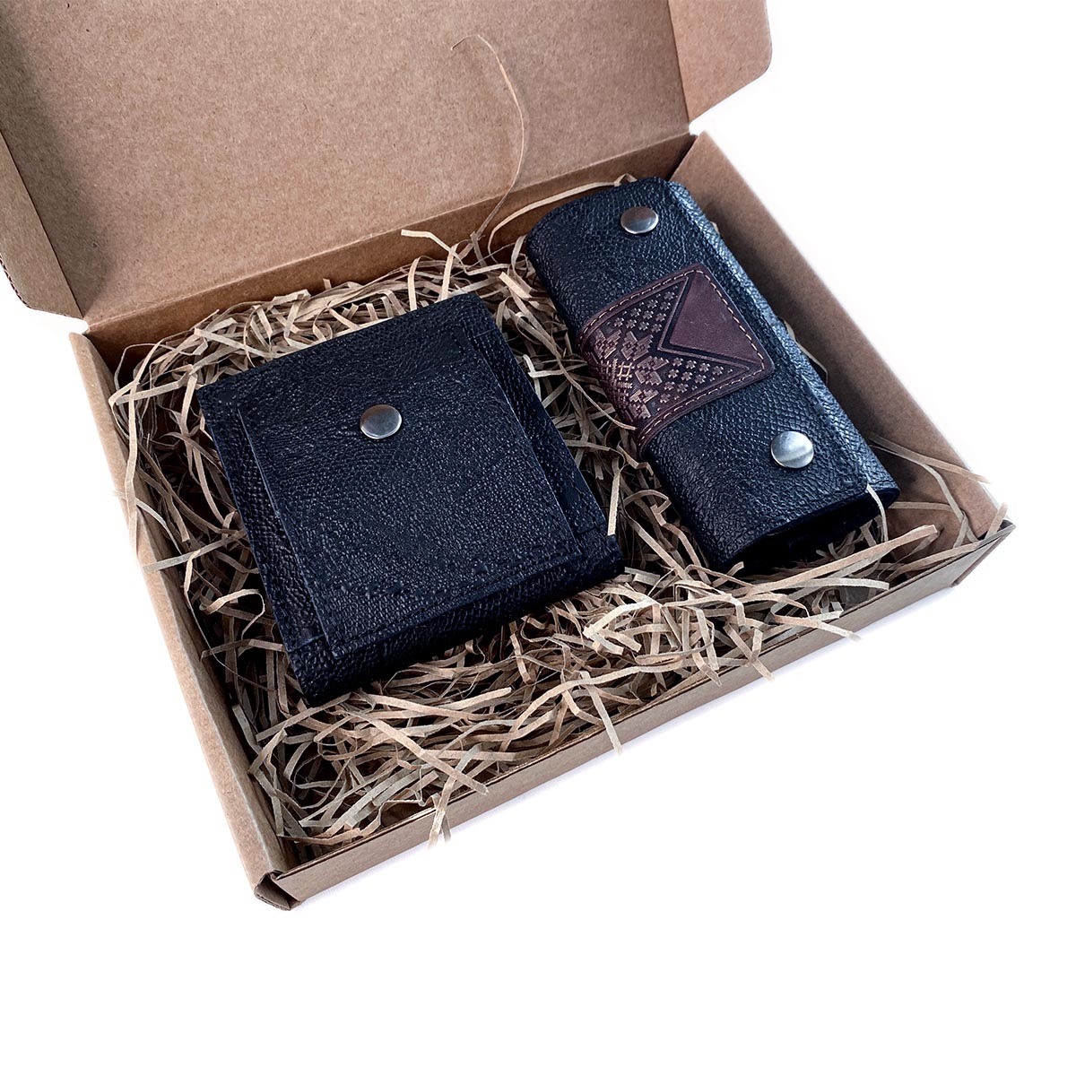 Подарочный набор из 2-х кожаных изделий в боксе из крафт-картона. В комплект набора входят: портмоне c евромонетницей, ключница.