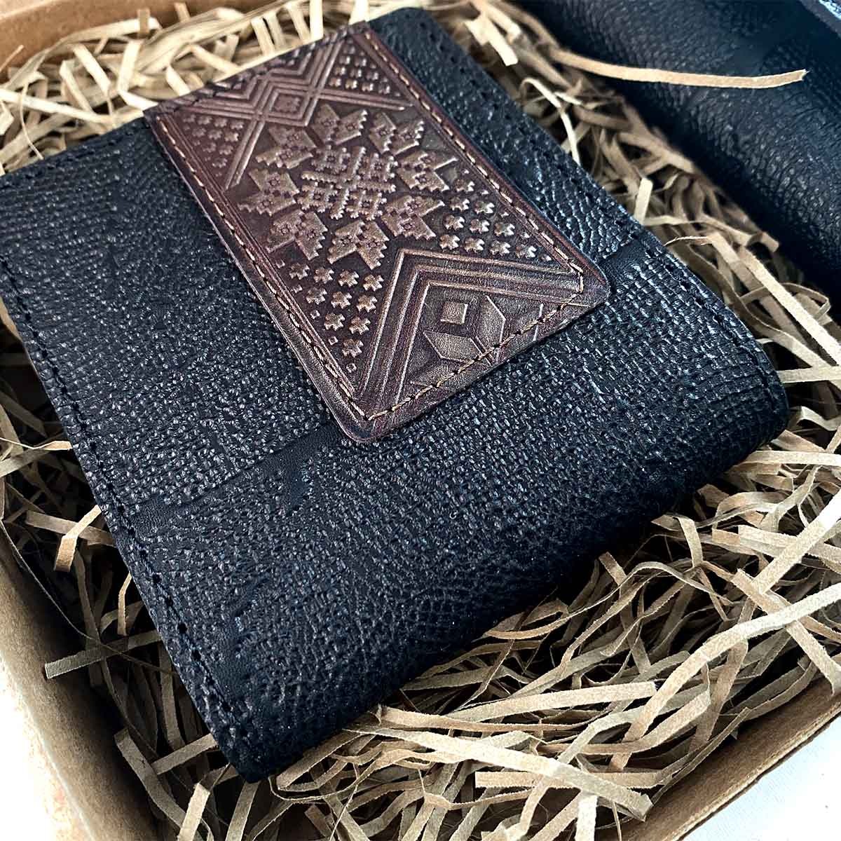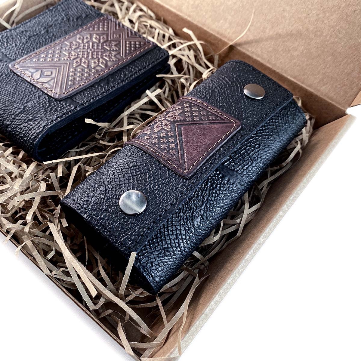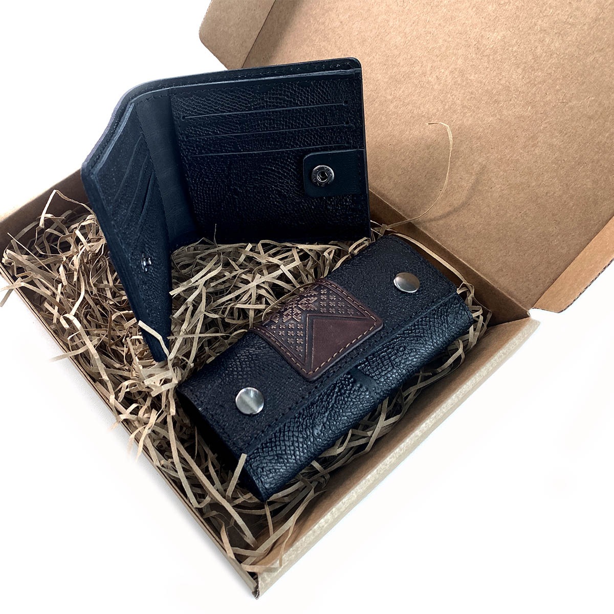 Подарочный набор из 2-х кожаных изделий в боксе из крафт-картона. В комплект набора входят: портмоне c евромонетницей, ключница.