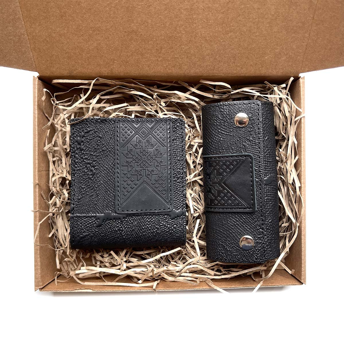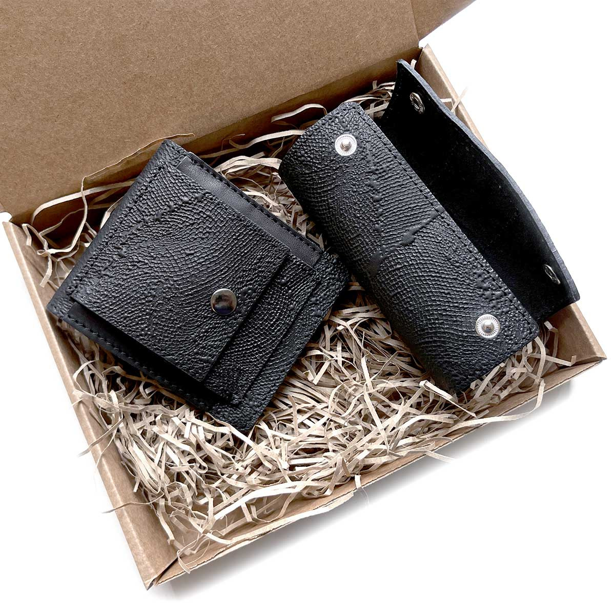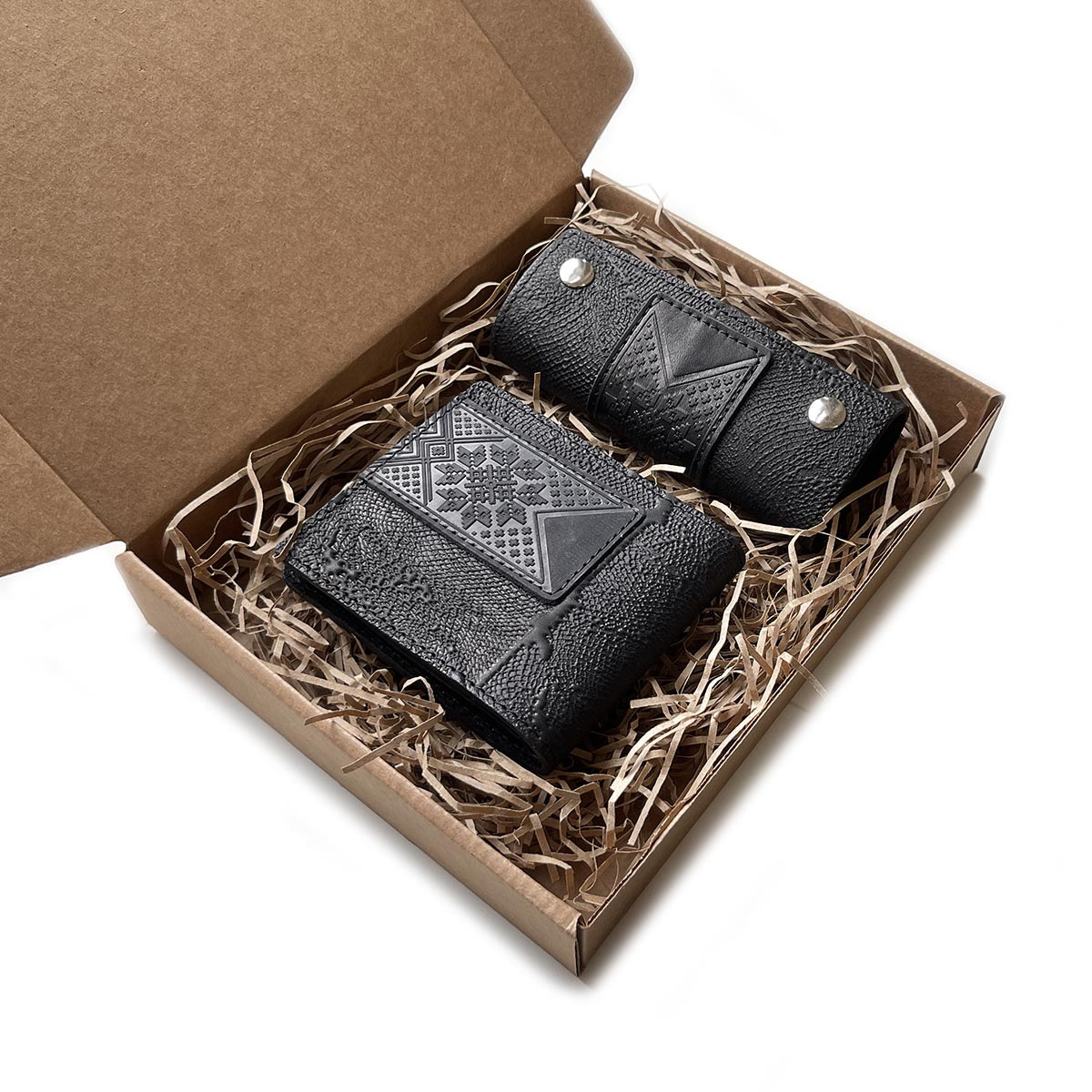 Подарочный набор из 2-х кожаных изделий в боксе из крафт-картона. В комплект набора входят: портмоне c евромонетницей, ключница.