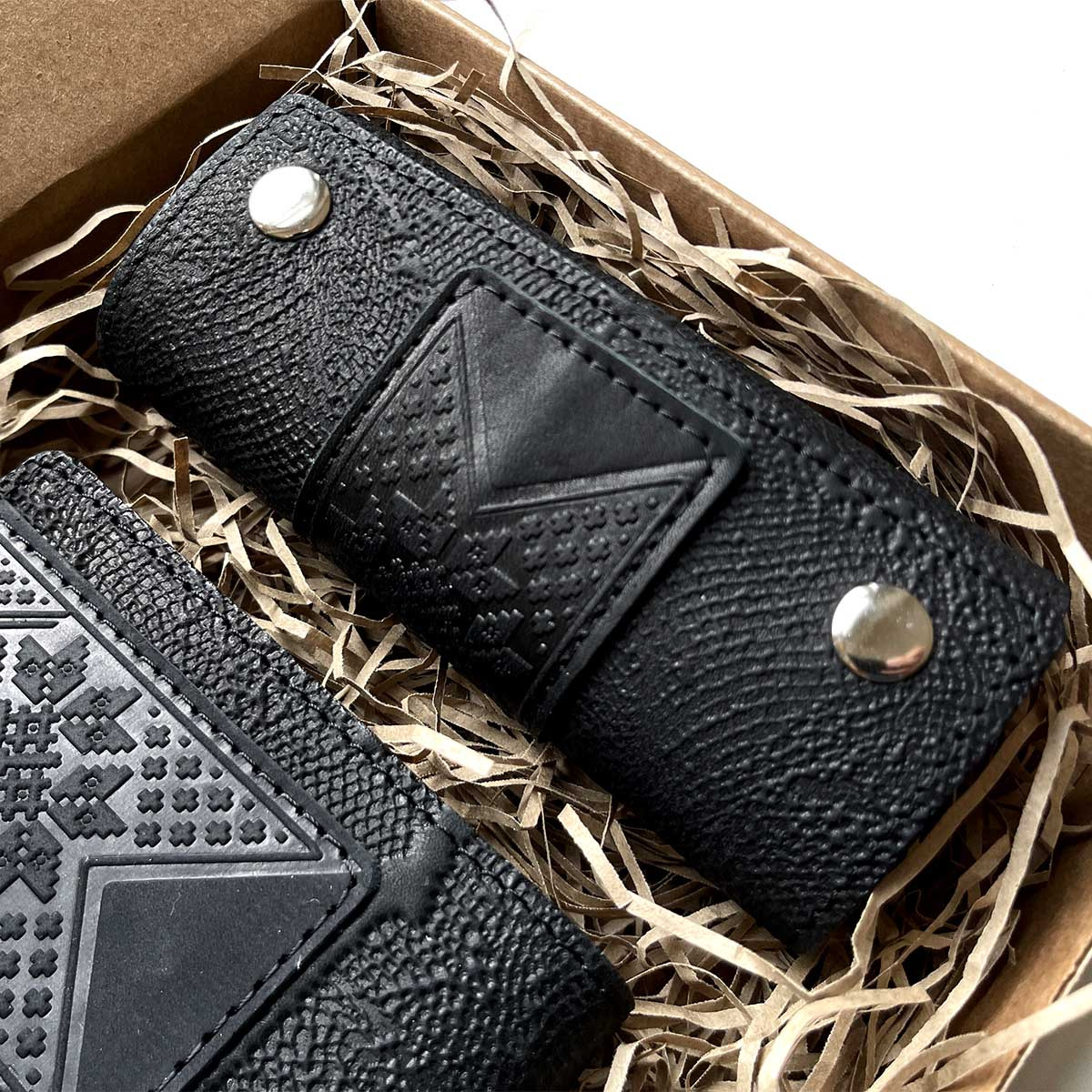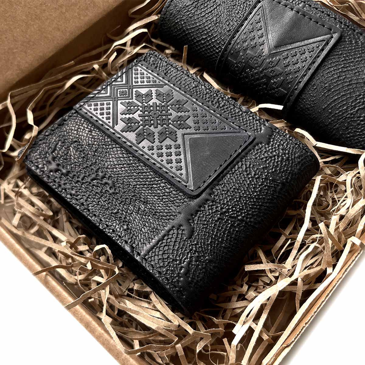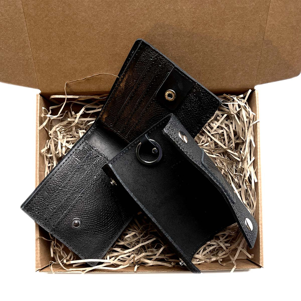 Подарочный набор из 2-х кожаных изделий в боксе из крафт-картона. В комплект набора входят: портмоне c евромонетницей, ключница.