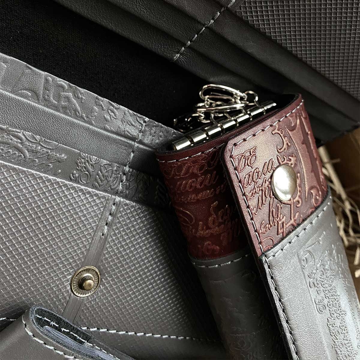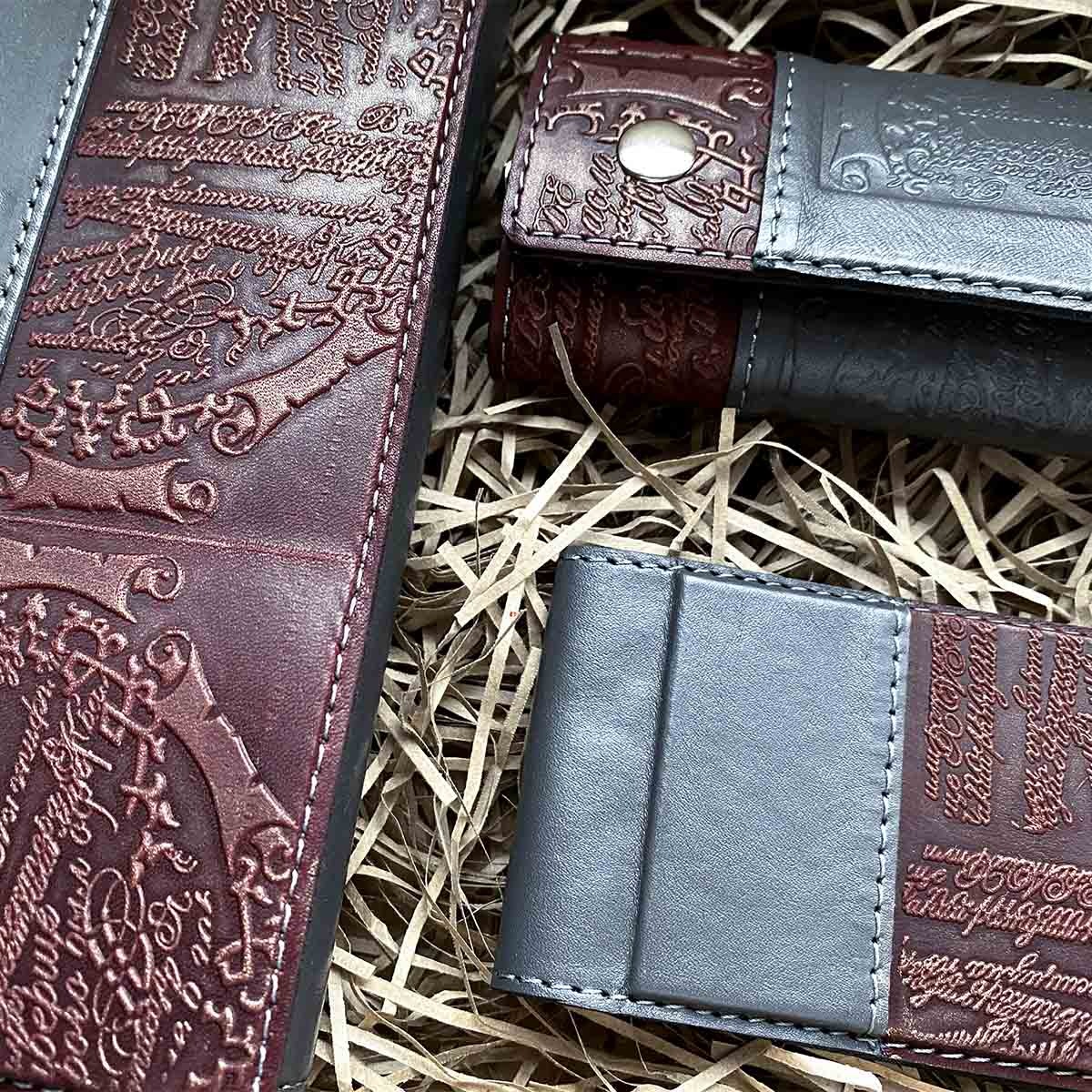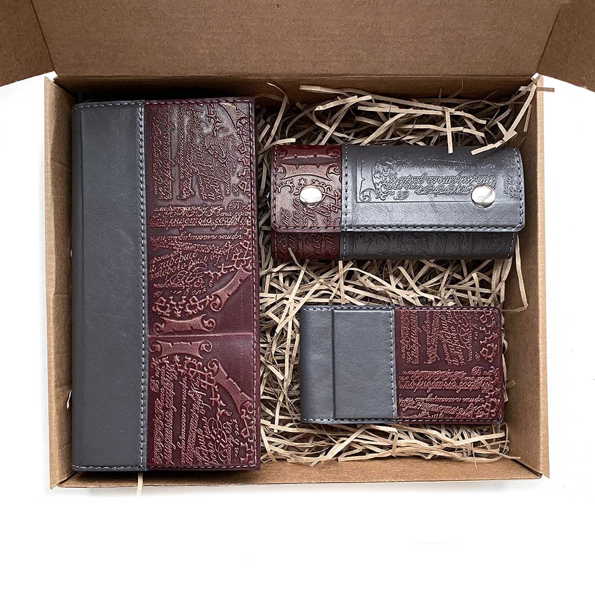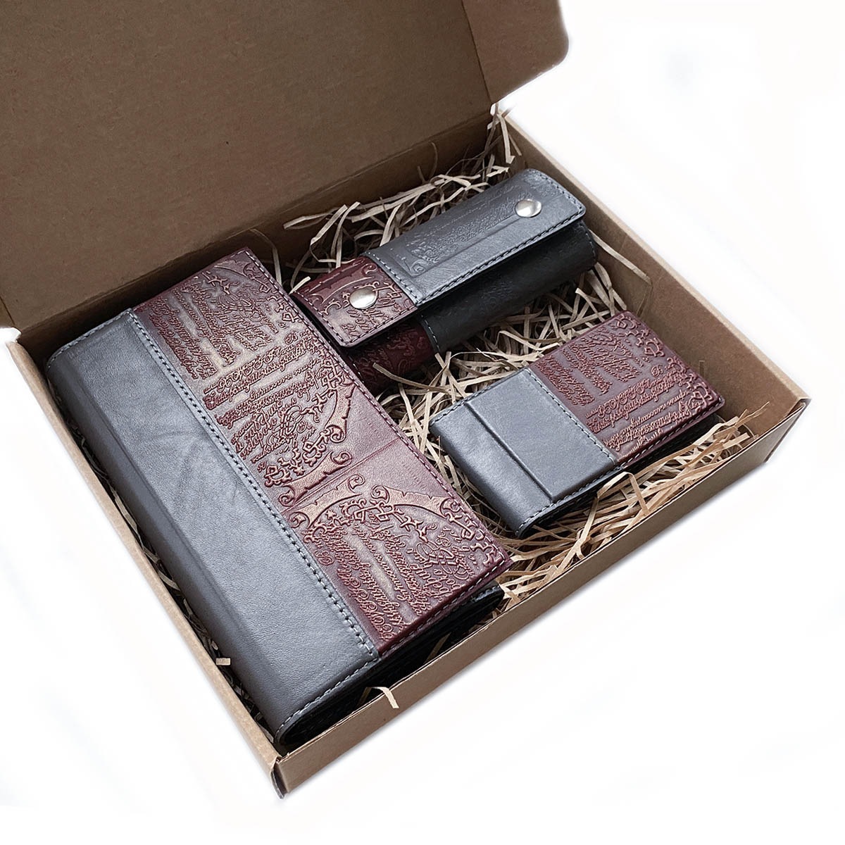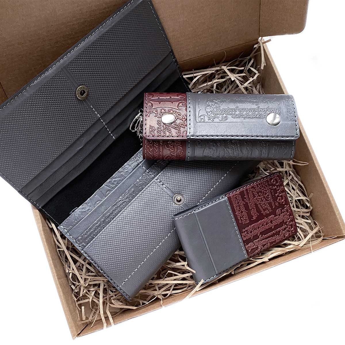 Подарочный набор из 4-х кожаных изделий в боксе из крафт-картона. В комплект набора входят: портмоне большое, ключница, визитница.