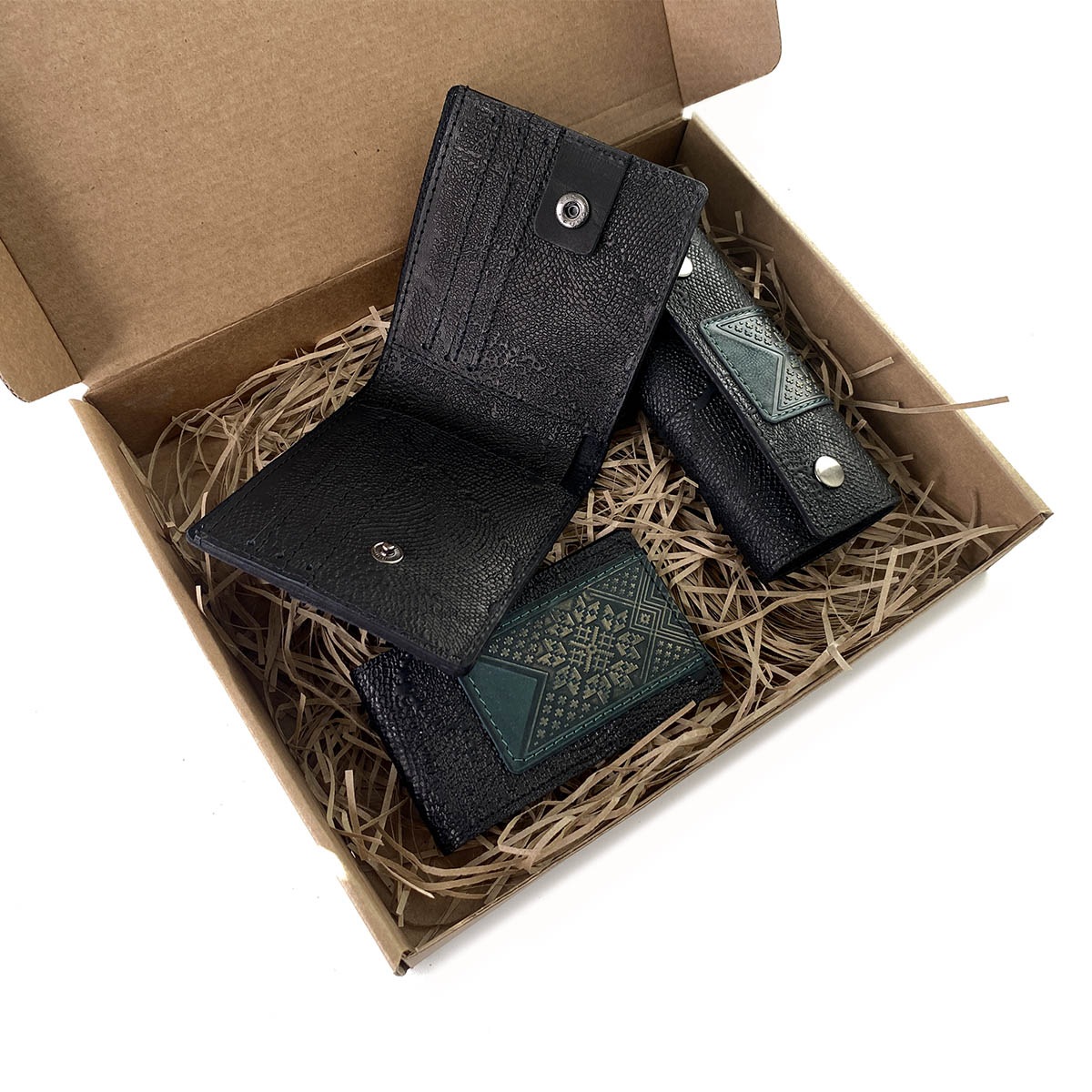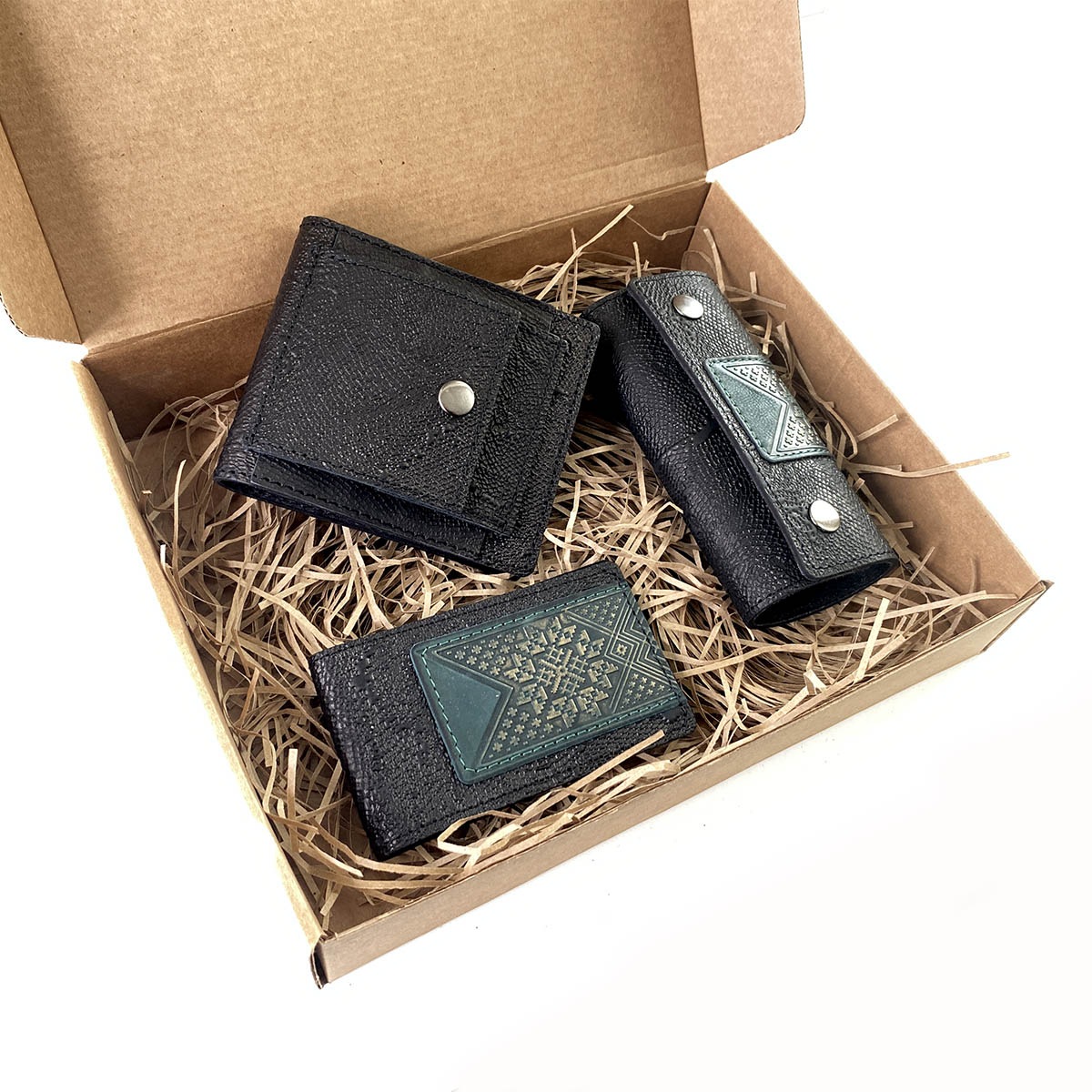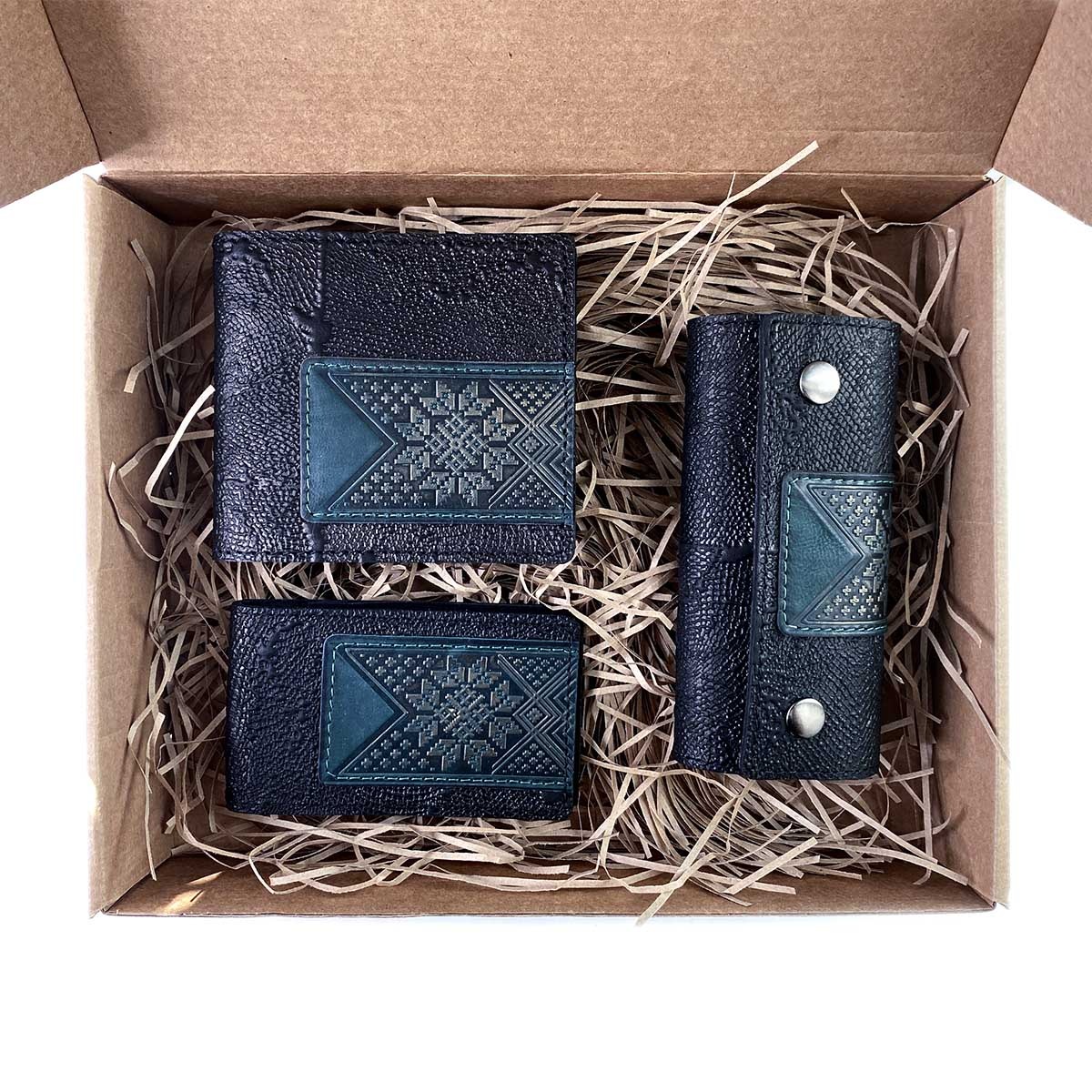 Подарочный набор из 3-х кожаных изделий в боксе из крафт-картона. В комплект набора входят: портмоне в евромонетницей, ключница, визитница.