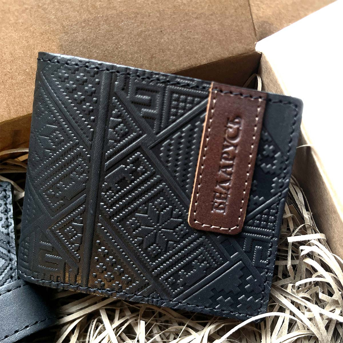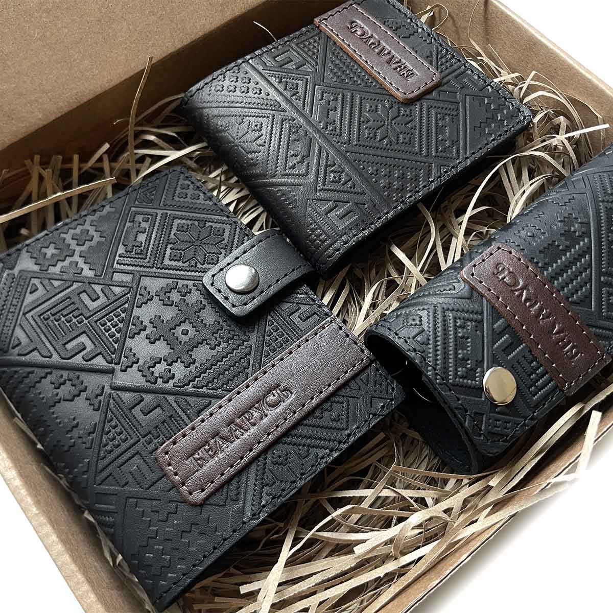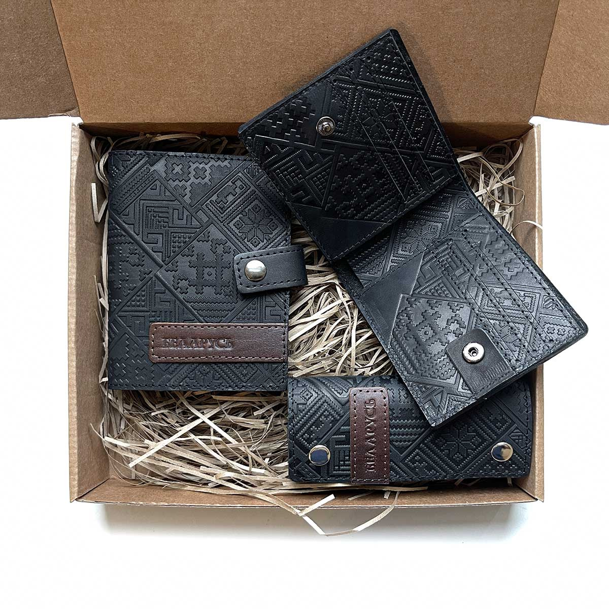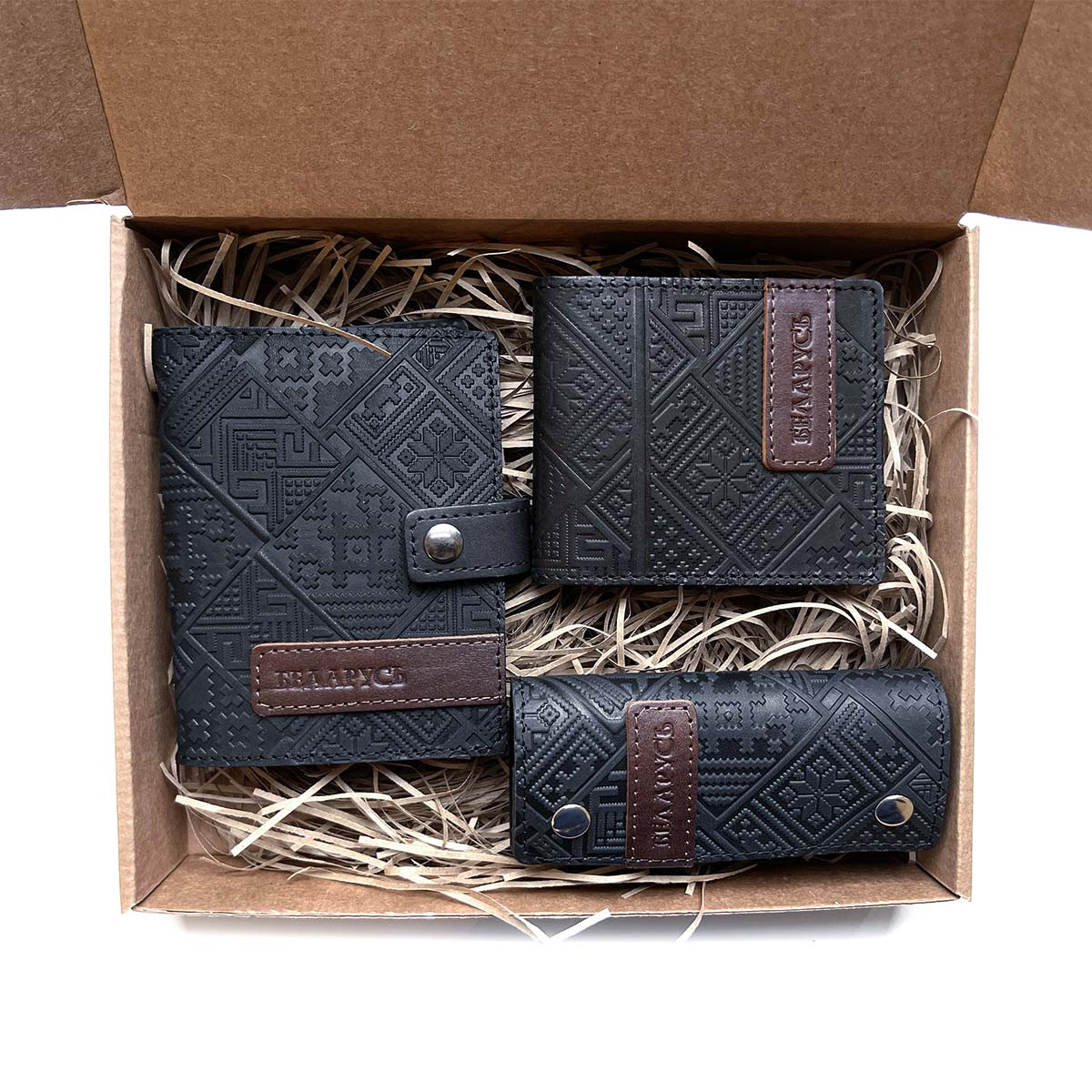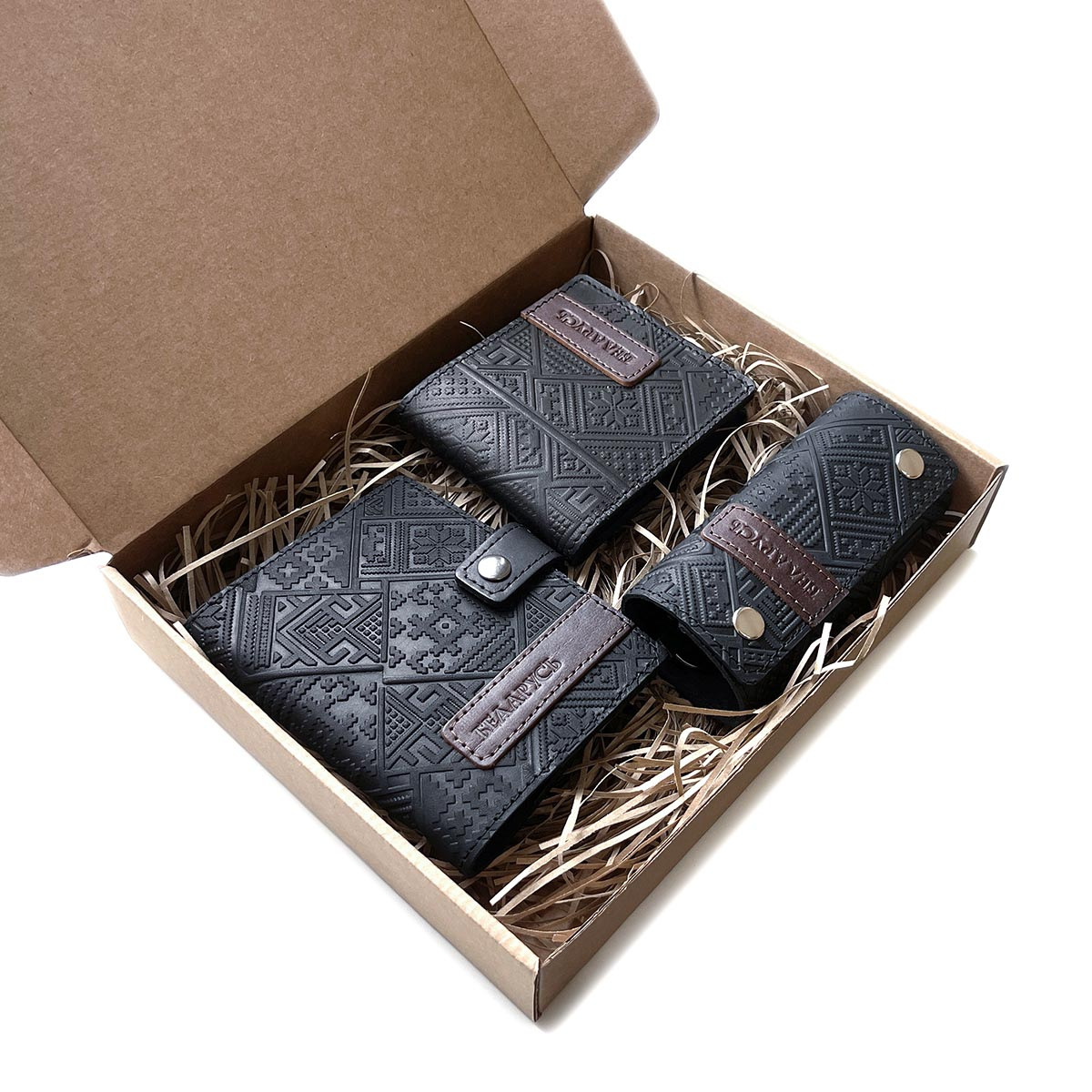Подарочный набор из 3-х кожаных изделий в боксе из крафт-картона. В комплект набора входят: обложка для автодокументов и паспорта, ключница, портмоне с евромонетницей.