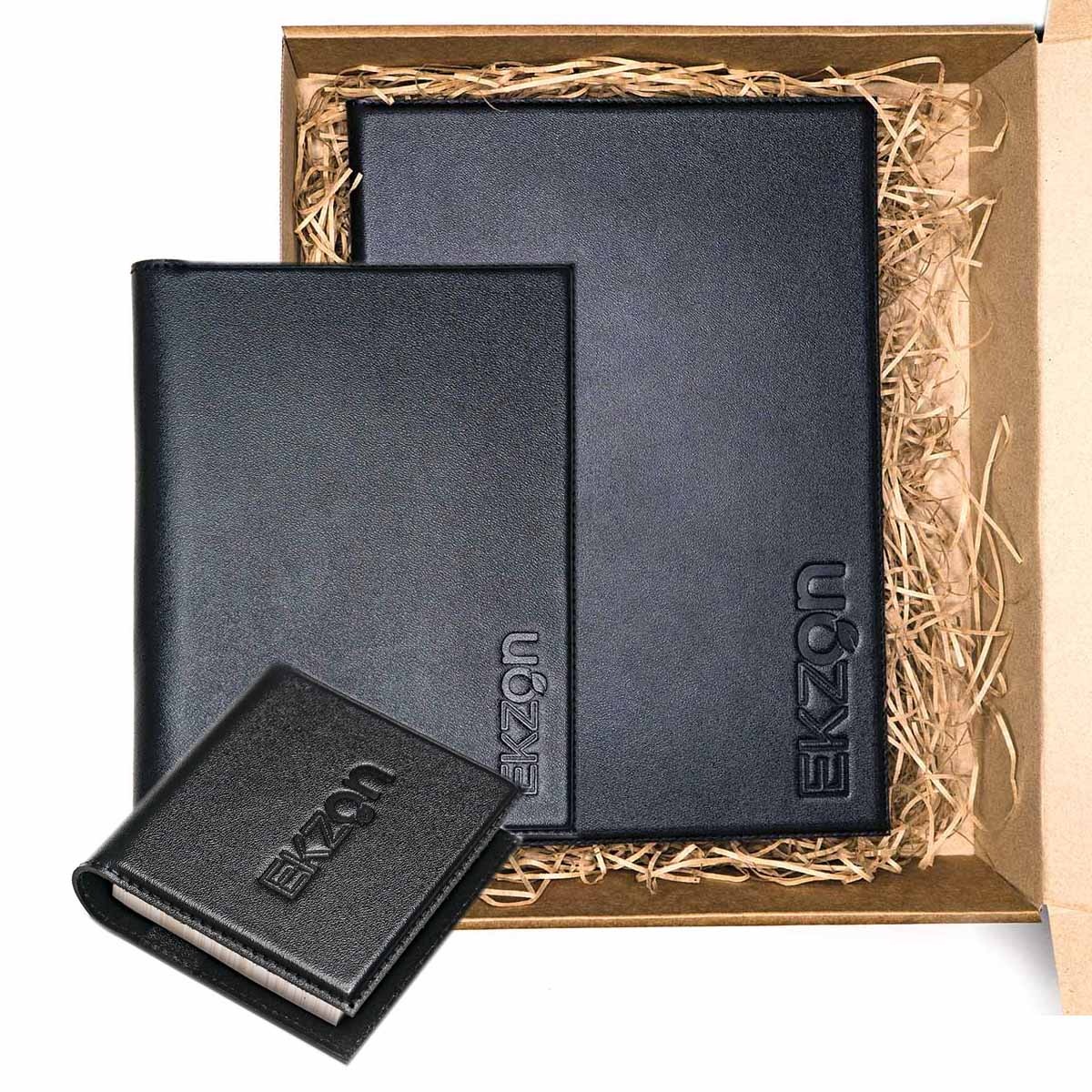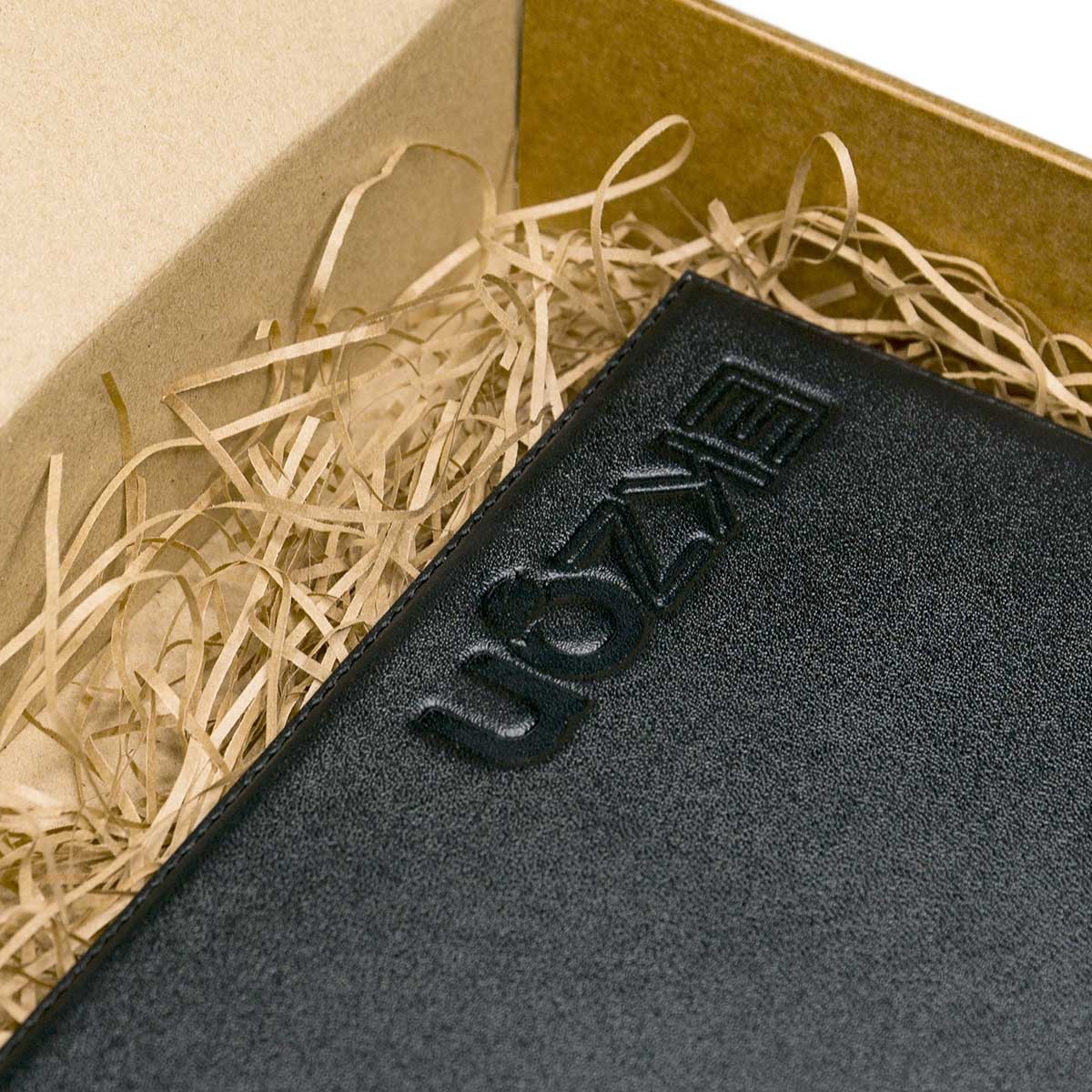 Пример изготовления подарочного набора с нанесением логотипа. В комплект входят: Кожаная папка на подпись, ежедневник в кожаной обложке, блокнот-кубарик в кожаной обложке. Все изделия выполнены с тиснением логотипа. Изделия упакованы в короб из крафт-картона с кожаной биркой с логотипом заказчика. Подобные изделия изготавливаются под заказ от 5 единиц.