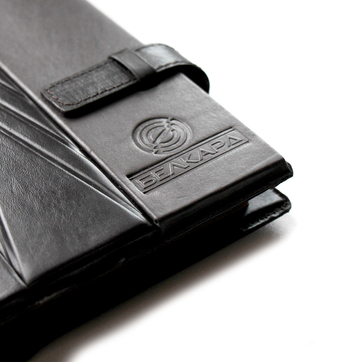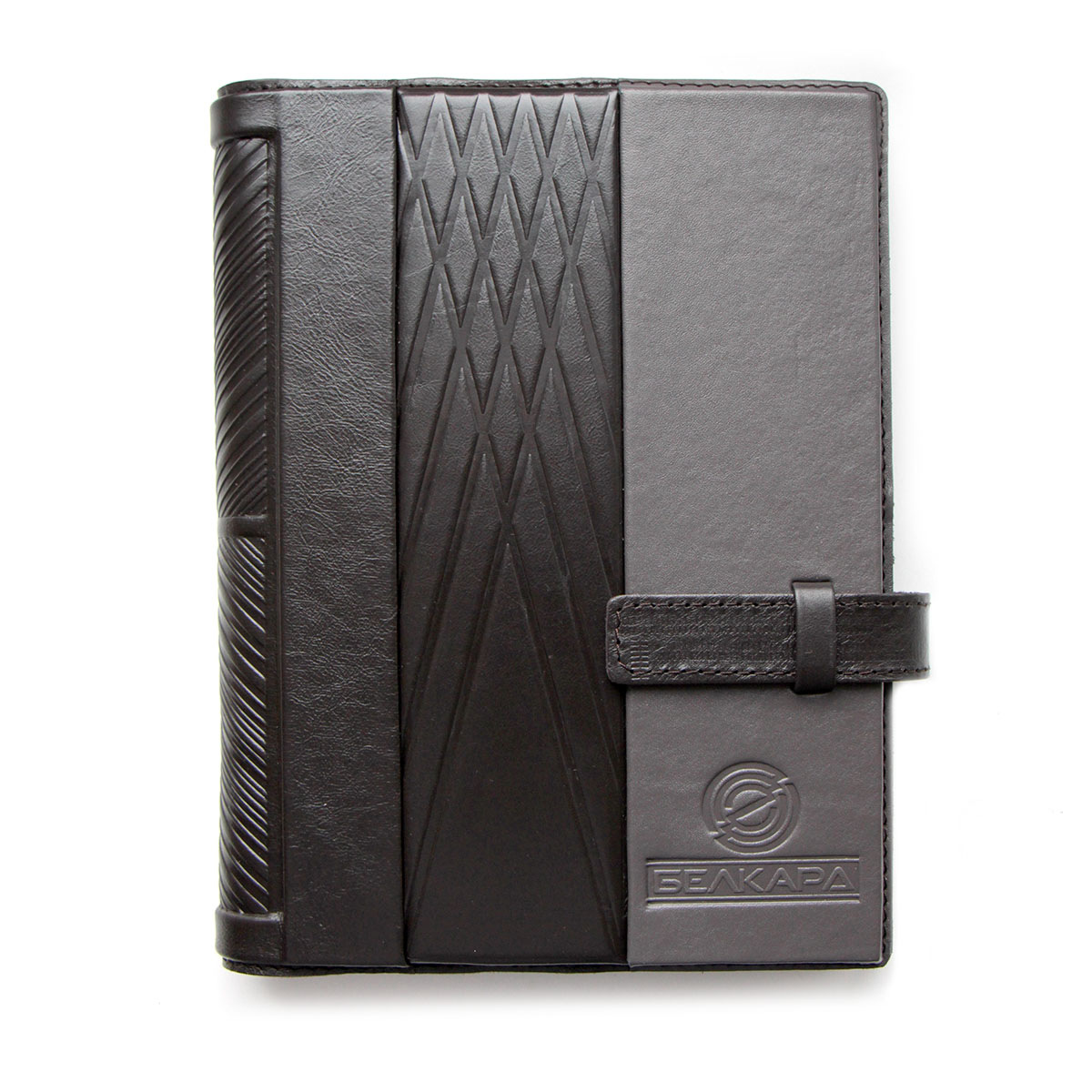 Пример изготовления органайзера с нанесением логотипа. Органайзер формата А5 в обложке из натуральной кожи с оригинальным тиснением. В левой части органайзера предусмотрены карманы для буклетов, визиток, карточек. Сменный блок стандартного размера А5, изготовлен из лощеной бумаги высокого качества. На каждой странице в виде водяных знаков сделаны изображения памятников архитектуры. На выбор мы предлагаем один из двух вариантов ежедневника: "Шедевры мирового зодчества" либо "Архитектура Беларуси". Оба варианта ежедневника недатированы, надписи на страницах дублируются на нескольких языках. Срез блока с трех сторон фольгирован "под золото". Обложка выполнена из высококачественной натуральной телячей кожи. Упакован в картонную упаковку, на которой приделана кожаная бирка с логотипом заказчика. Ежедневники в кожаной обложке с логотипом изготавливаются под заказ от 10 единиц.