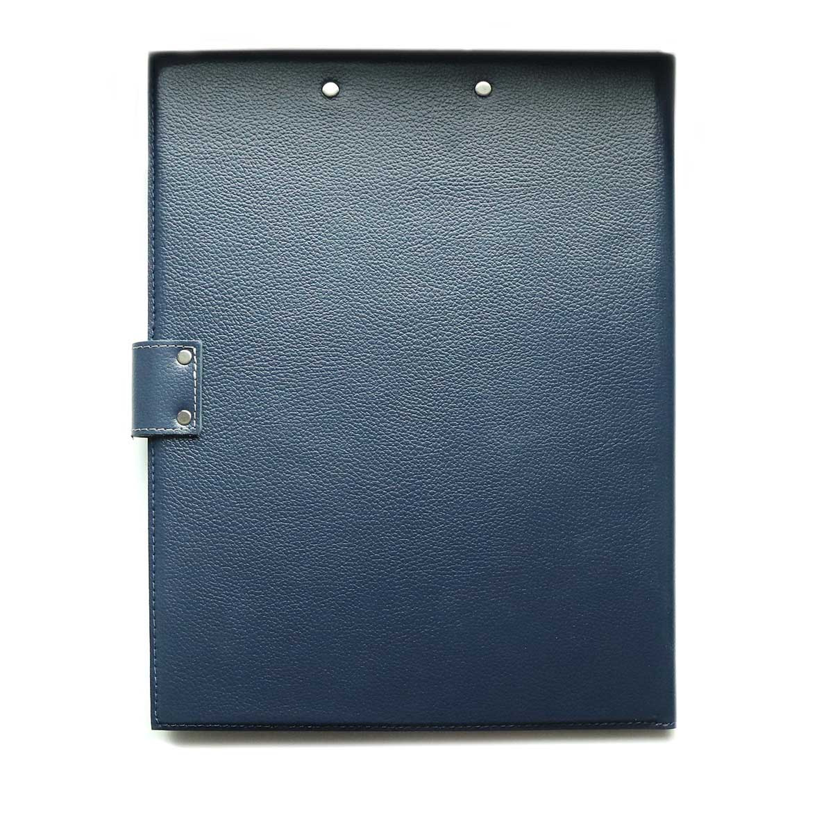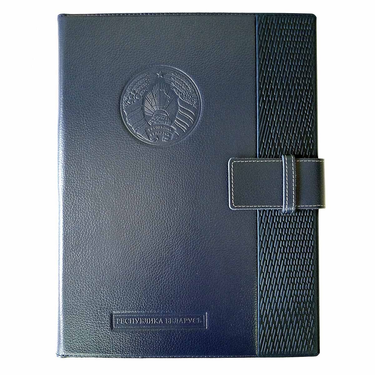 Папка деловая А4 из натуральной кожи с тиснением. Внутри слева - карман для листов А4, отделения для визитных карточек и буклетов, петля для ручки. справа - зажим для листов на пружине.