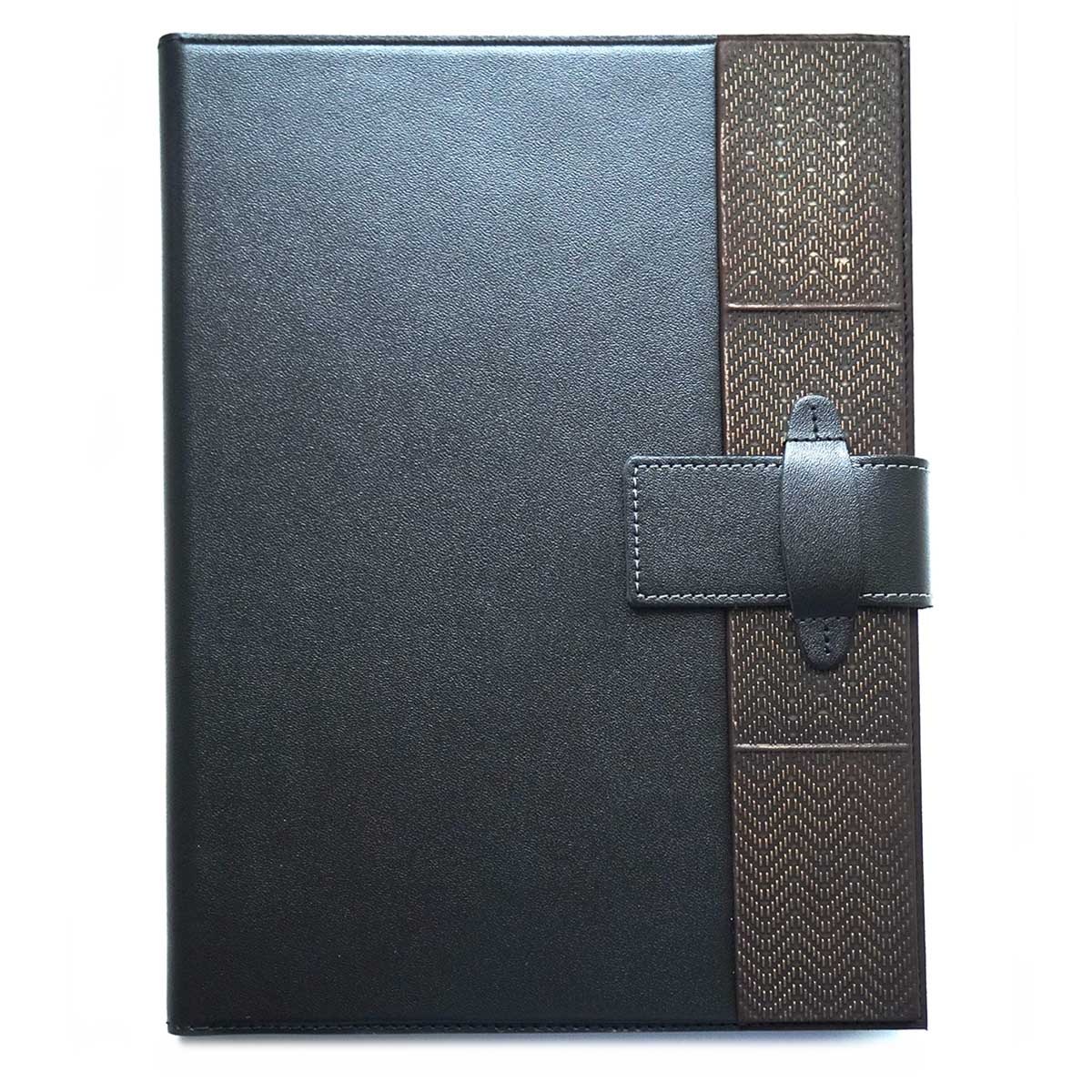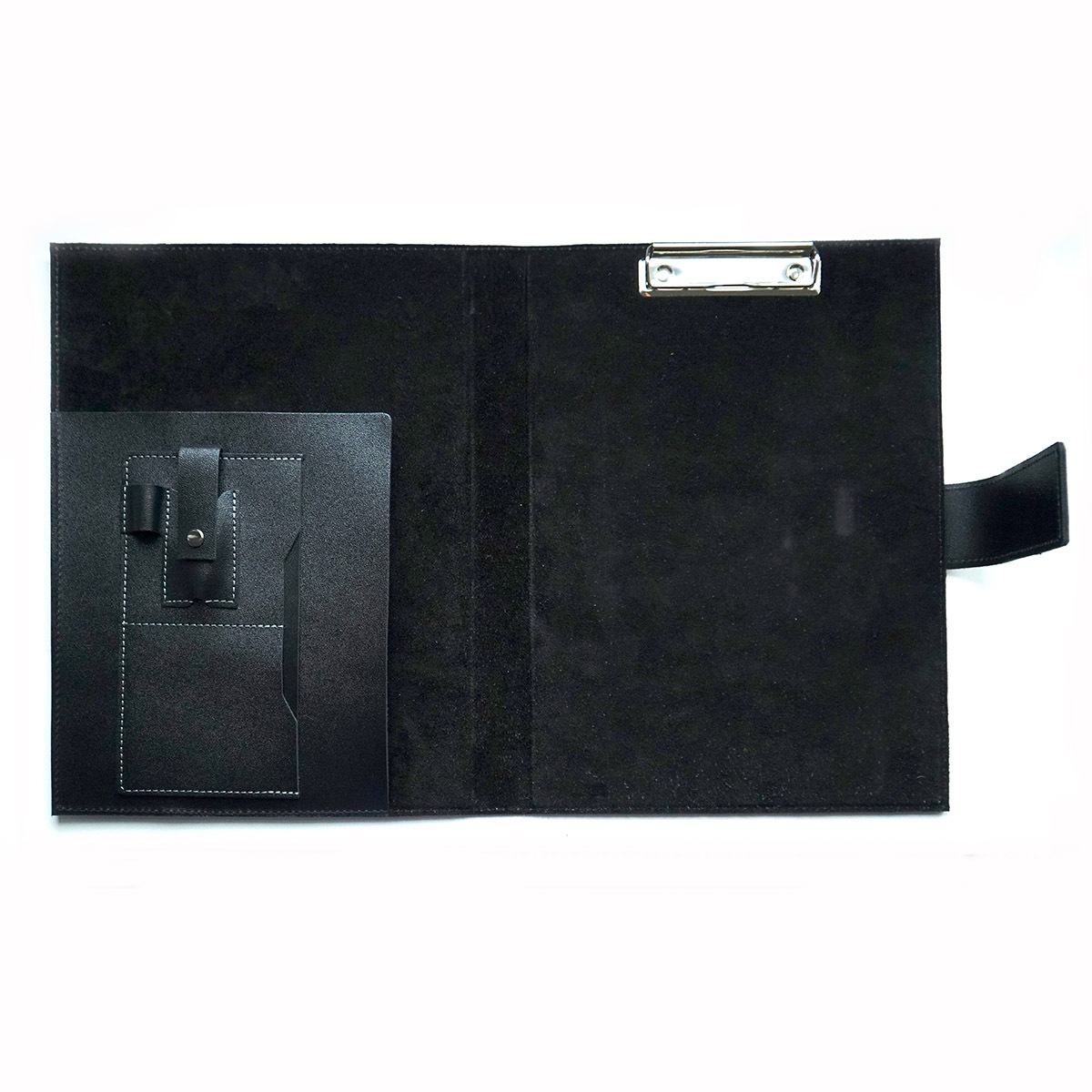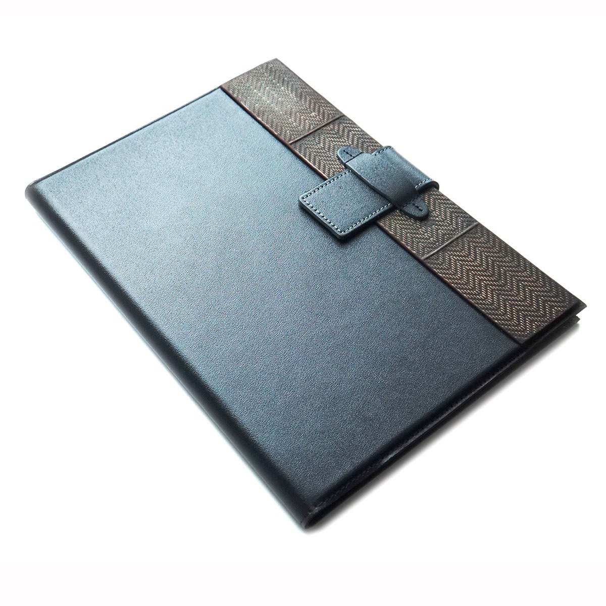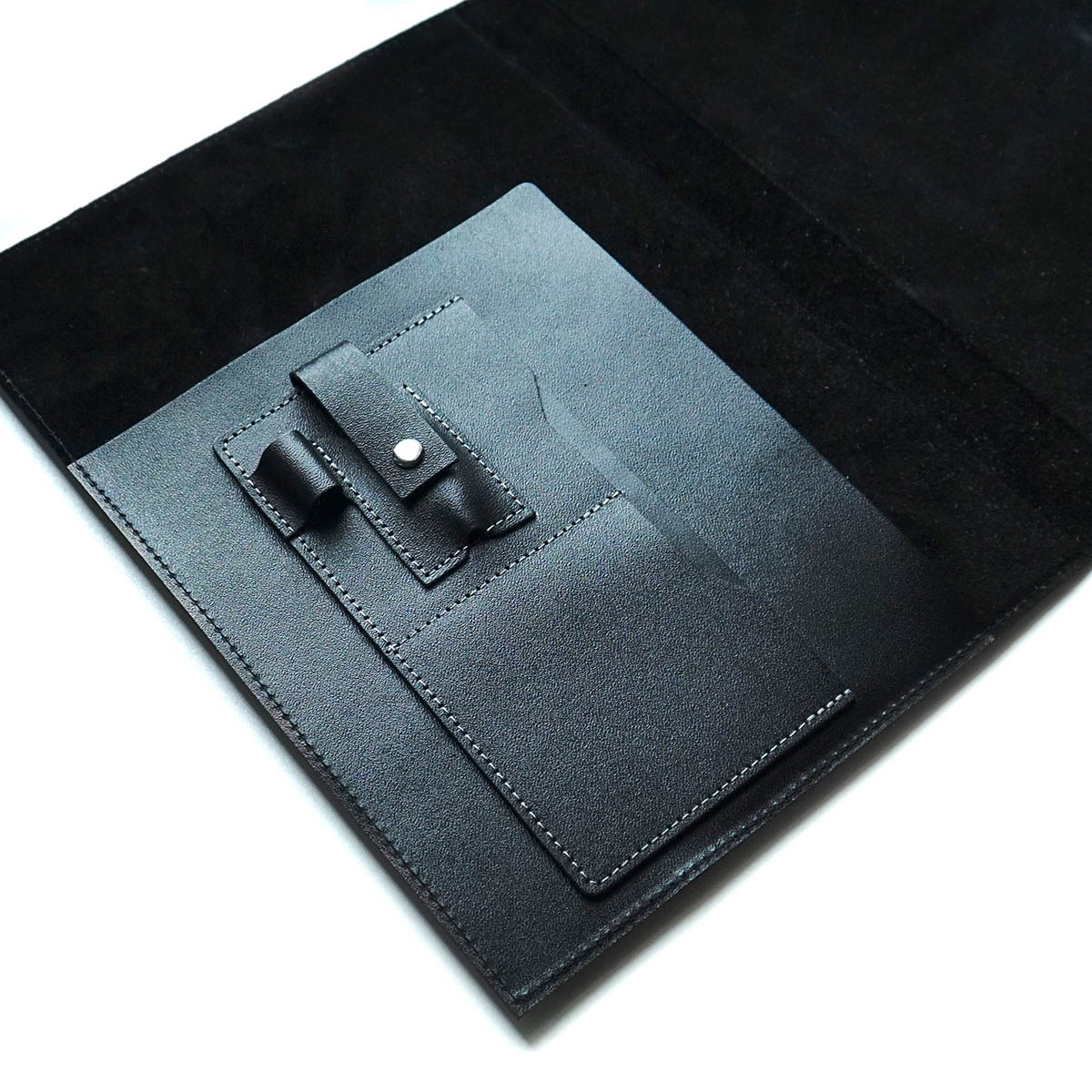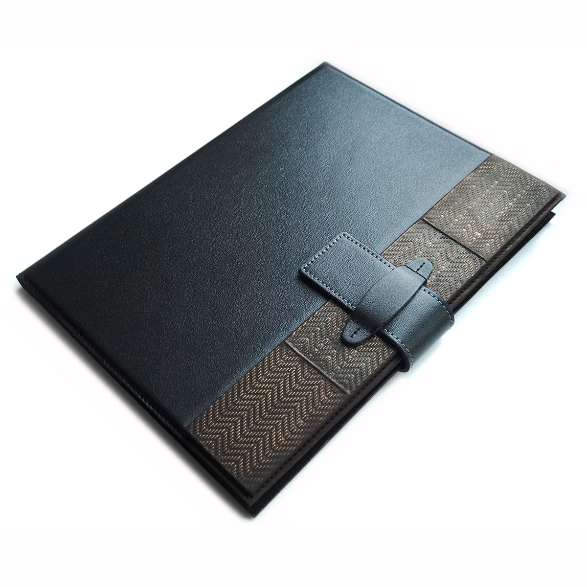 Папка деловая А4 из натуральной кожи с тиснением. Внутри слева - карман для листов А4, отделения для визитных карточек и буклетов, петля для ручки. справа - зажим для листов на пружине.