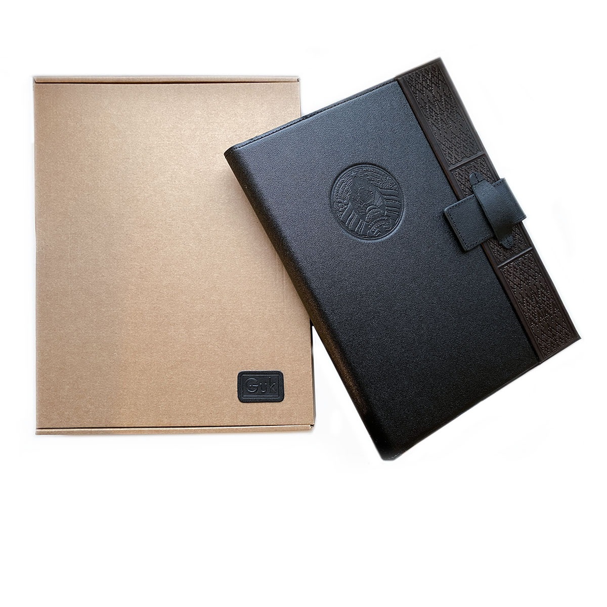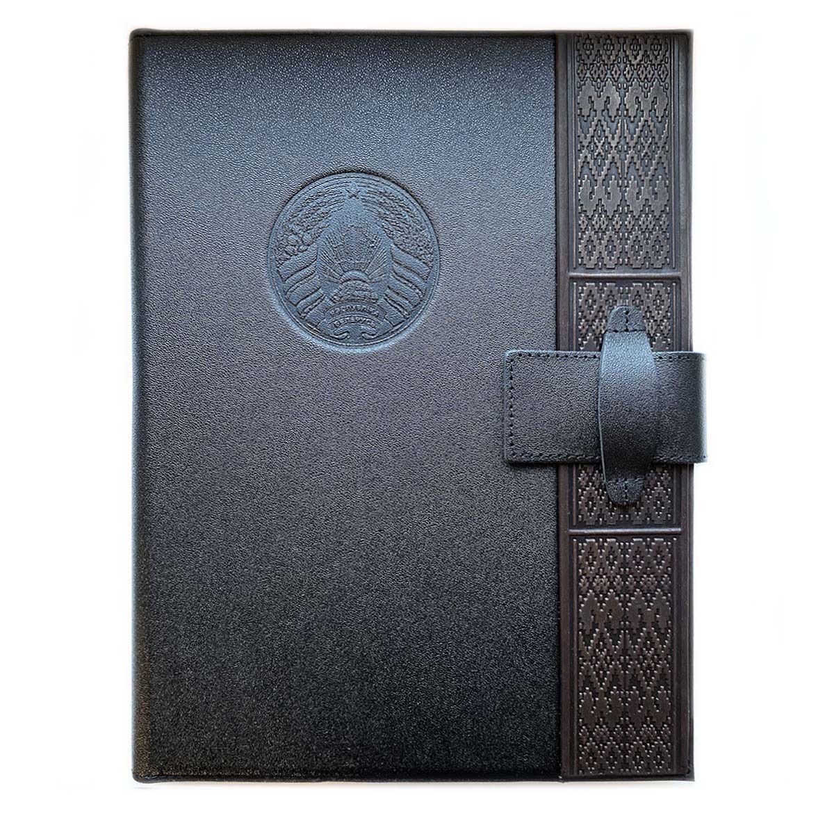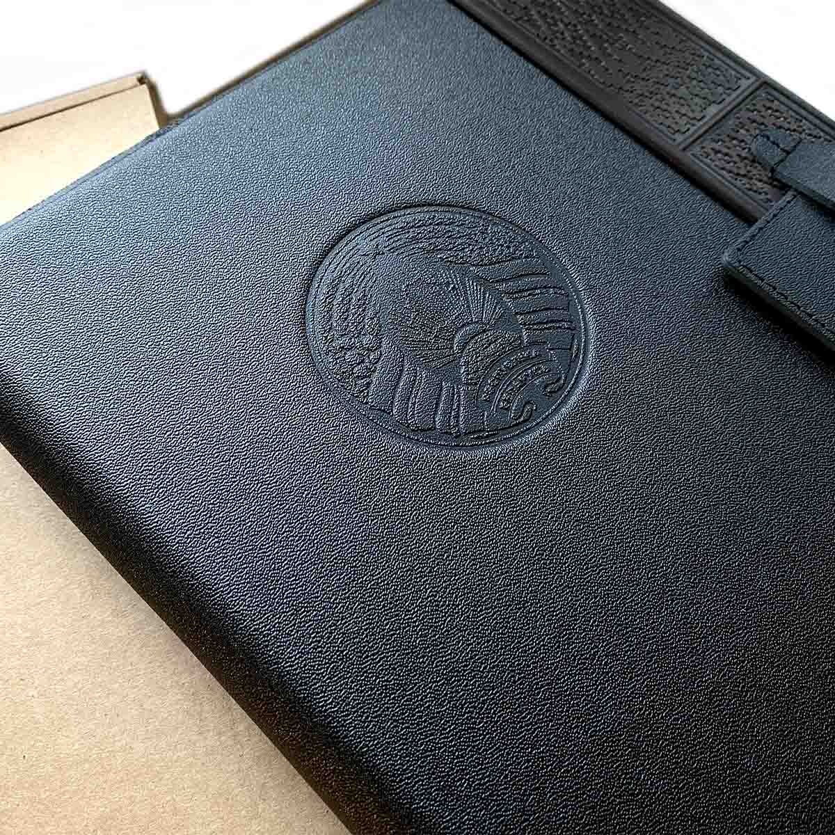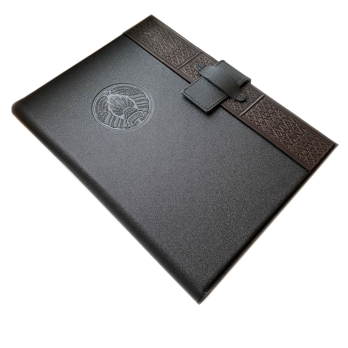Папка деловая А4 из натуральной кожи с тиснением. Внутри слева - карман для листов А4, отделения для визитных карточек и буклетов, петля для ручки. справа - зажим для листов на пружине.