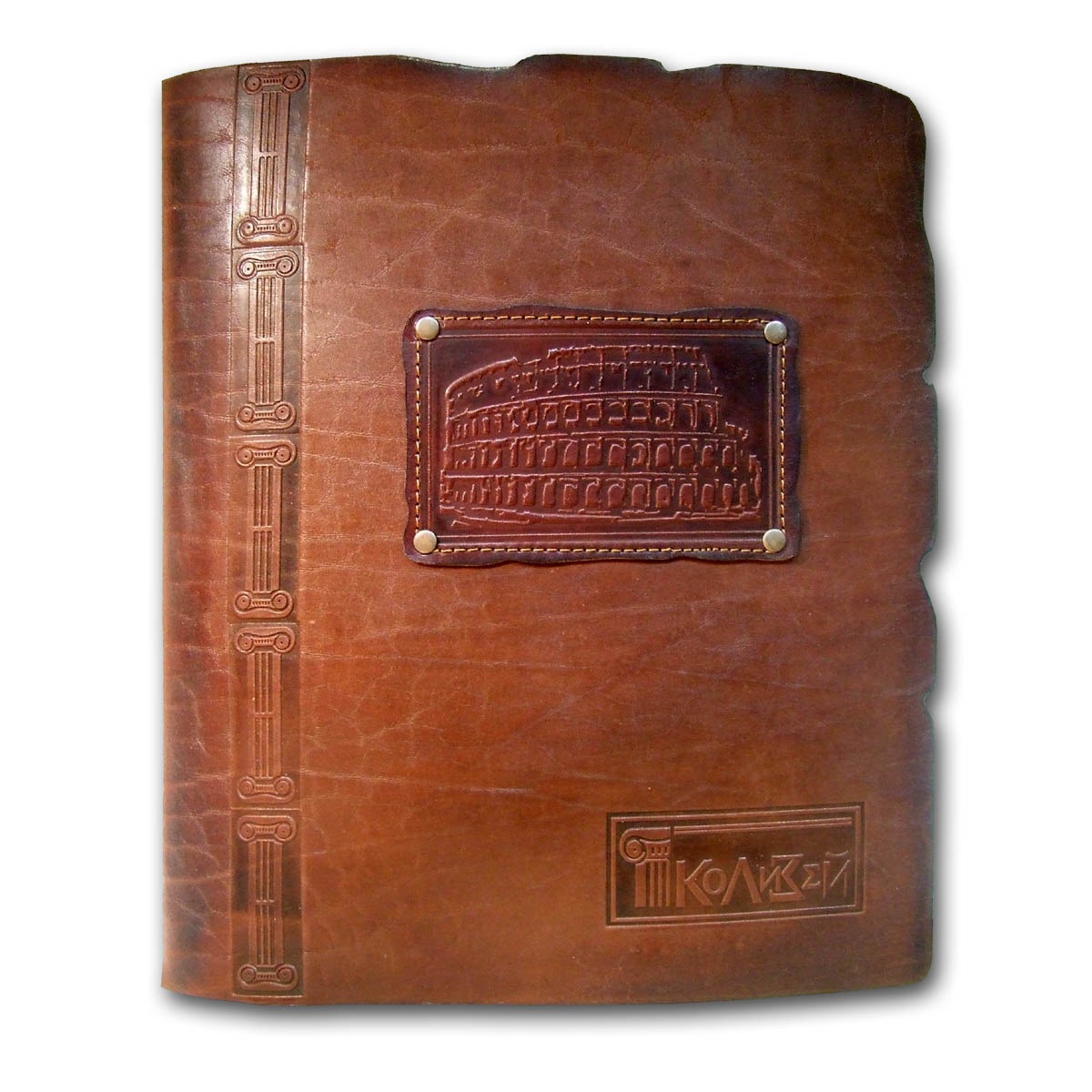 Пример папки из натуральной кожи с тиснением, выполнена из кожи толщиной 4-6 мм. Отличается повышенной прочностью и износостойкостью. Кожаные папки-меню изготавливаем под заказ от 5-ти единиц. Крепление файлов может по выбору заказчика осуществляться на кольцевой механизм, либо на стяжные болты. Цвет и дизайн папки согласовываются дополнительно. В стоимость папки не включено изготовление клише для тиснения логотипа или надписи. Его стоимость зависит от размера и сложности рисунка, и в среднем составляет около 50 белорусских рублей. При заказе на сумму от 600 белорусских рублей одно клише для тиснения размером до 8х8 см мы изготавливаем для заказчика бесплатно.