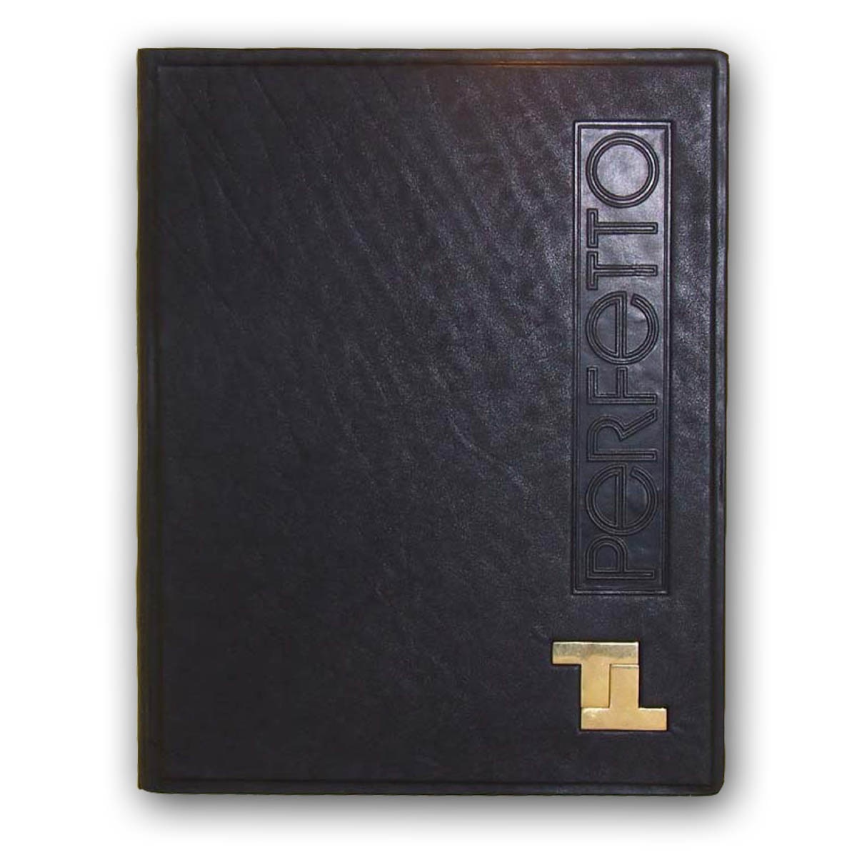 Пример папки-меню из натуральной кожи с тиснением. Кожаные папки-меню изготавливаем под заказ от 5-ти единиц. Крепление файлов может по выбору заказчика осуществляться на кольцевой механизм, либо на стяжные болты. Цвет и дизайн папки согласовываются дополнительно. В стоимость папки не включено изготовление клише для тиснения логотипа или надписи. Его стоимость зависит от размера и сложности рисунка, и в среднем составляет около 50 белорусских рублей. При заказе на сумму от 700 белорусских рублей одно клише для тиснения размером до 8х8 см мы изготавливаем для заказчика бесплатно.