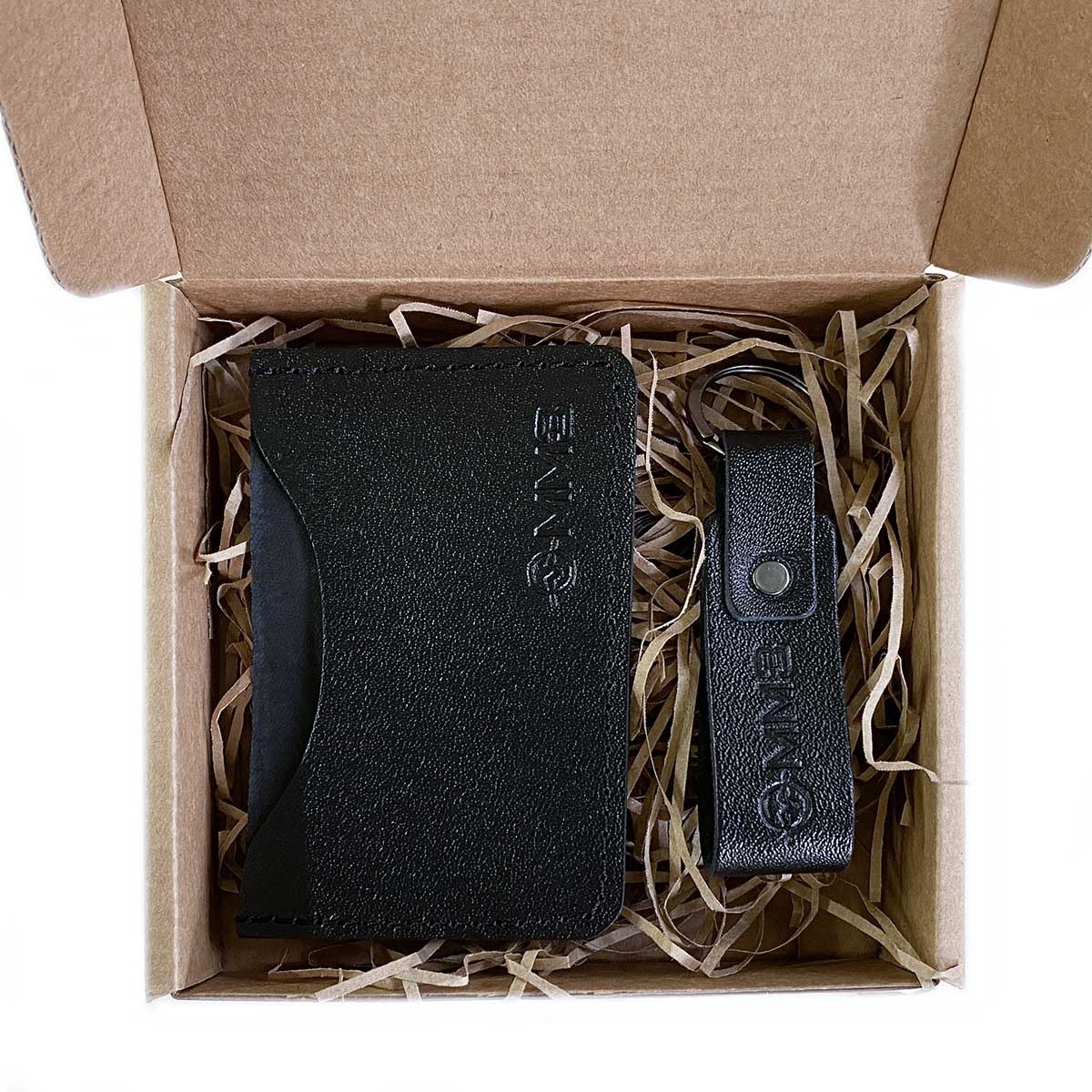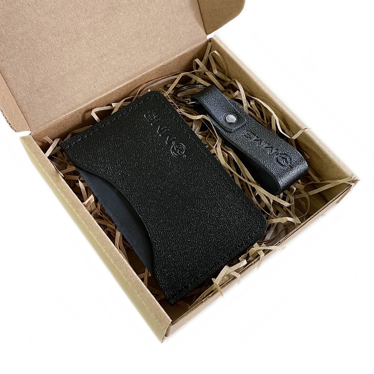 Подарочный набор из двух предметов с тиснением логотипа. В комплект входят кожаная кредитница, кожаный брелок. Упаковка- короб из крафт-картона с кожаной биркой. Данные изделия изготавливаем тиражем от 10 штук под заказ, возможно изготовление с вашим логотипом.