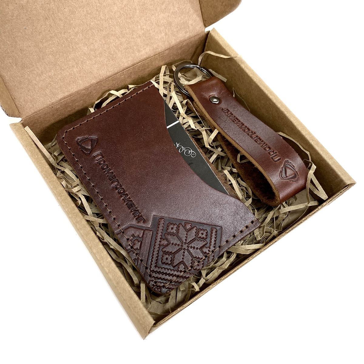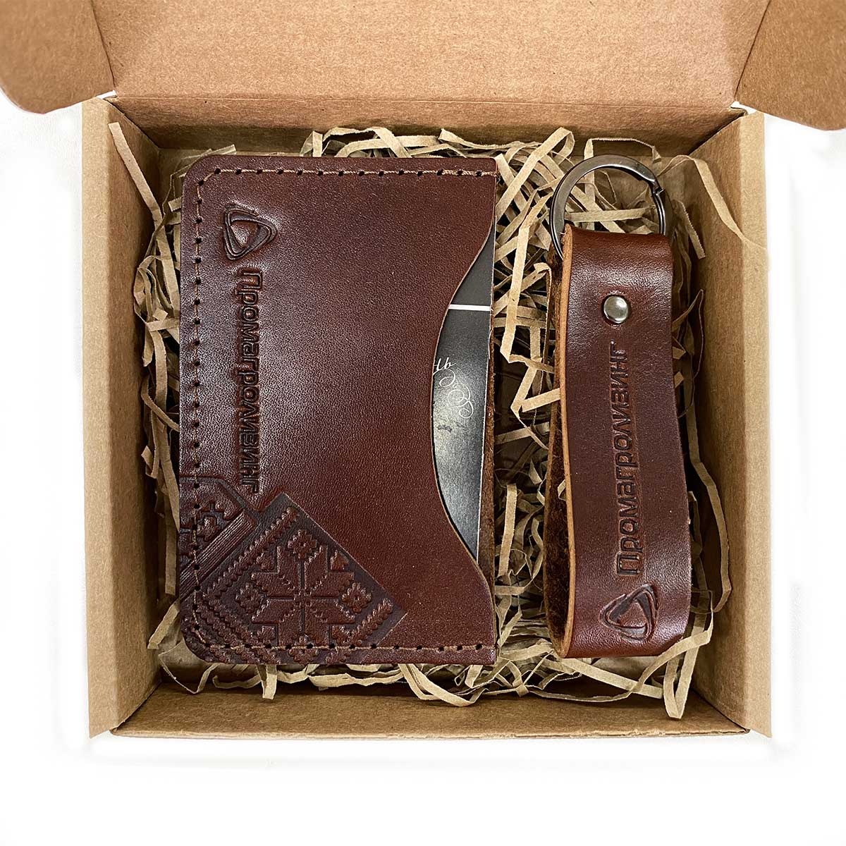 Подарочный набор из двух предметов с тиснением логотипа. В комплект входят кожаная кредитница, кожаный брелок. Упаковка- короб из крафт-картона с кожаной биркой. Данные изделия изготавливаем тиражом от 10 штук под заказ, возможно изготовление с вашим логотипом.