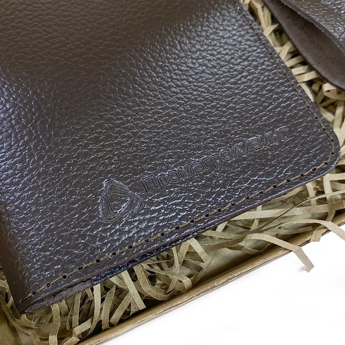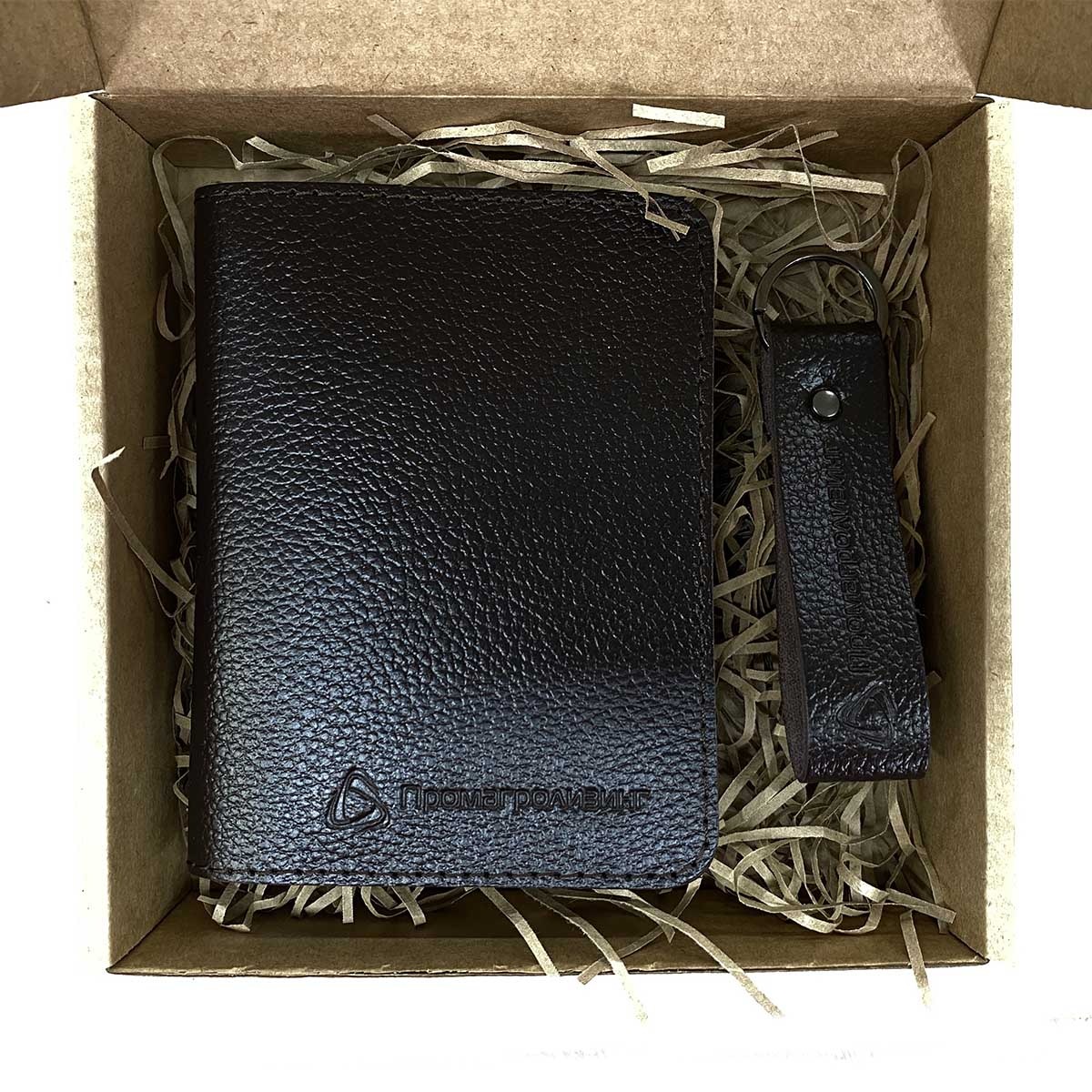 Подарочный набор из двух предметов с тиснением логотипа. В комплект входят кожаная обложка, кожаный брелок. Упаковка- короб из крафт-картона с кожаной биркой. Данные изделия изготавливаем тиражом от 10 штук под заказ, возможно изготовление с вашим логотипом.