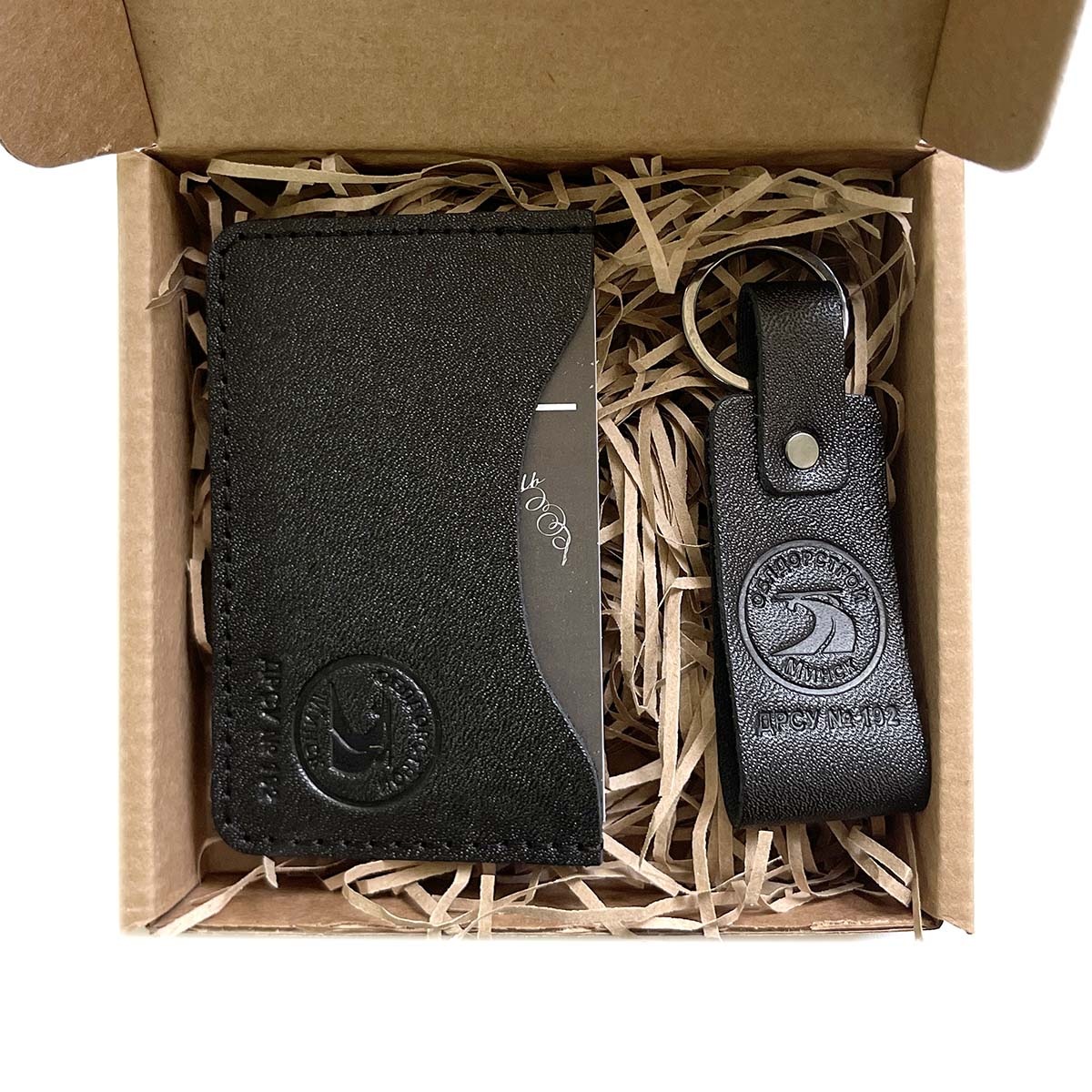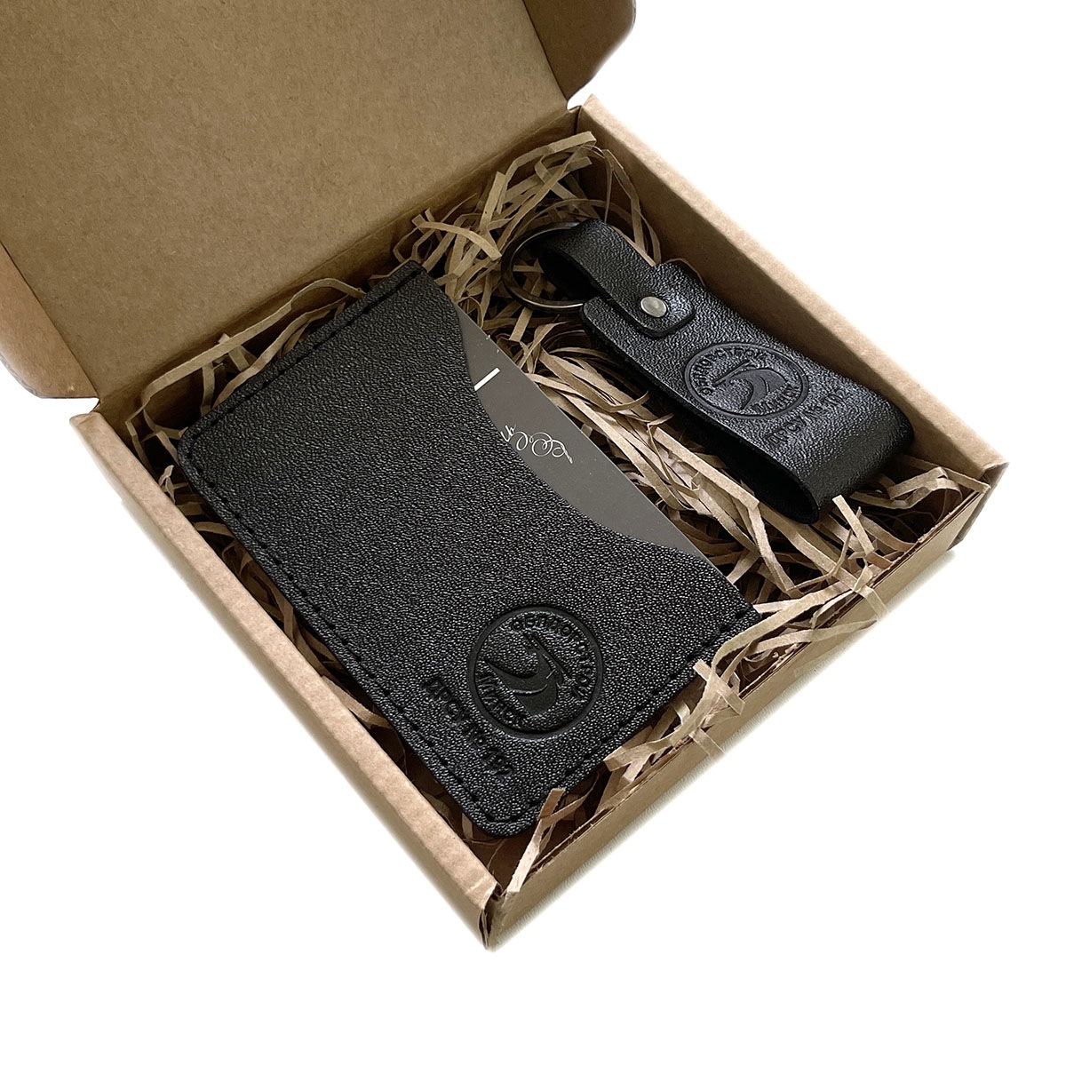 Подарочный набор из двух предметов с тиснением логотипа. В комплект входят кожаный чехол для карт, брелок. Упаковка- короб из крафт-картона с кожаной биркой. Данные изделия изготавливаем тиражом от 10 штук под заказ, возможно изготовление с вашим логотипом.