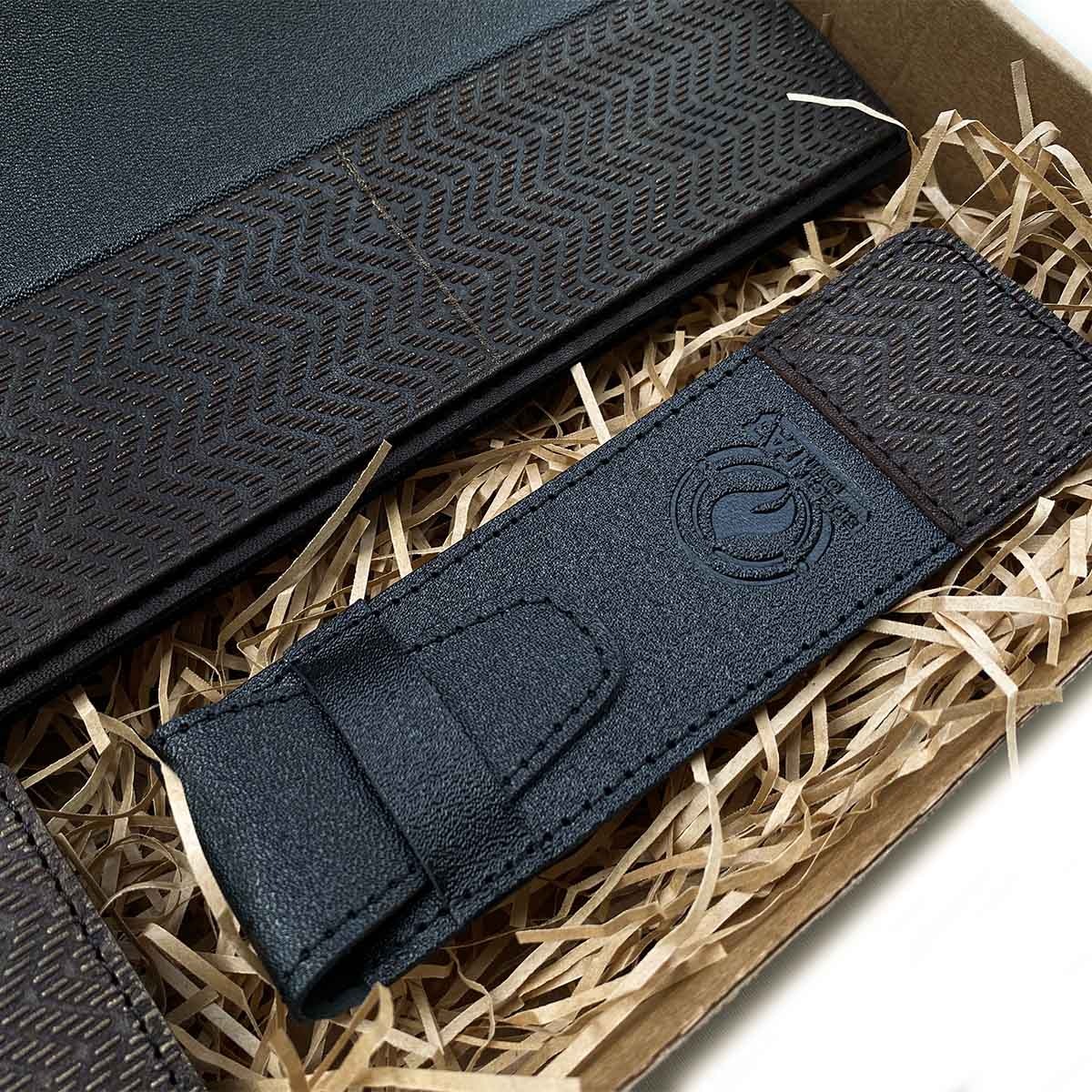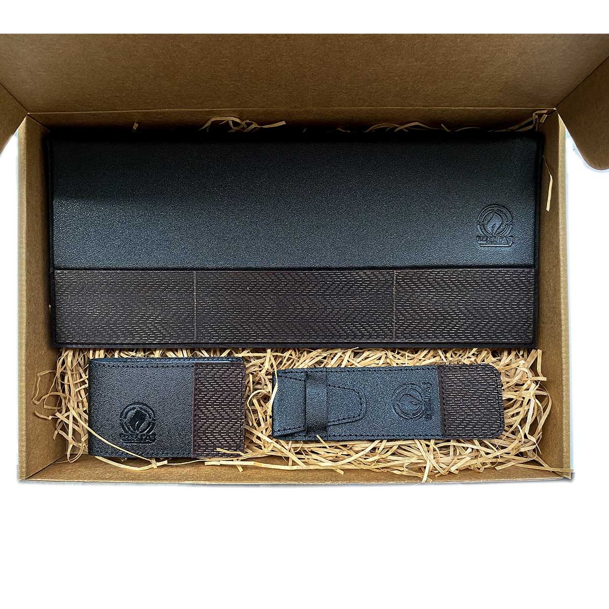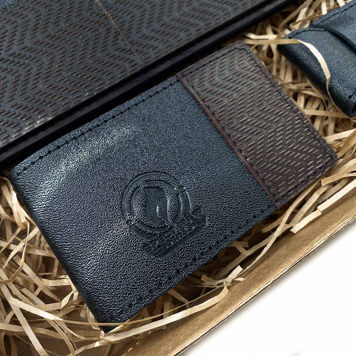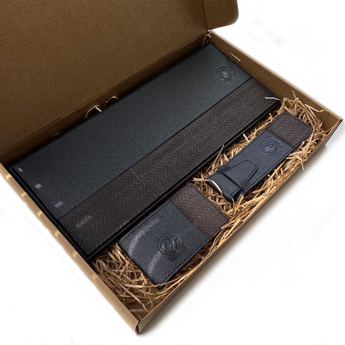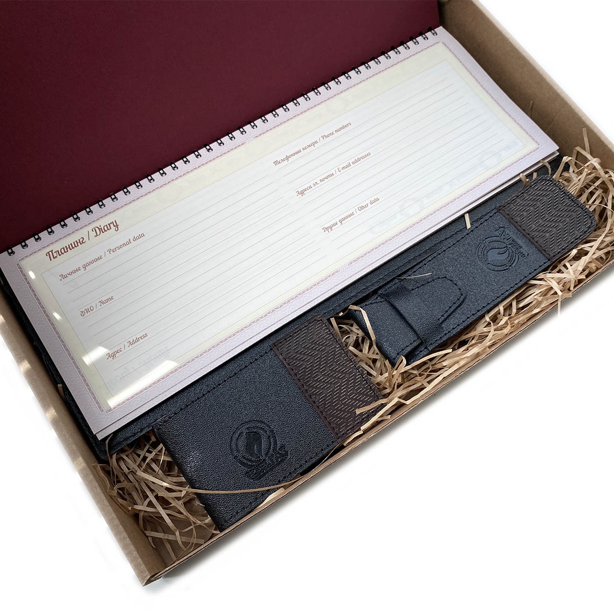 Подарочный набор из трех предметов с тиснением логотипа. В комплект входят планинг, кожаный визитница, кожаный чехол для ручки. Упаковка - короб из крафт-картона с бумажным наполнителем и кожаной биркой с тиснением логотипа. Данные изделия изготавливаем тиражем от 5 штук под заказ, возможно изготовление с вашим логотипом.