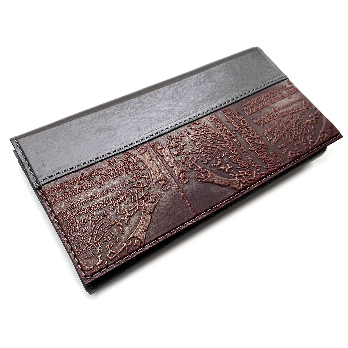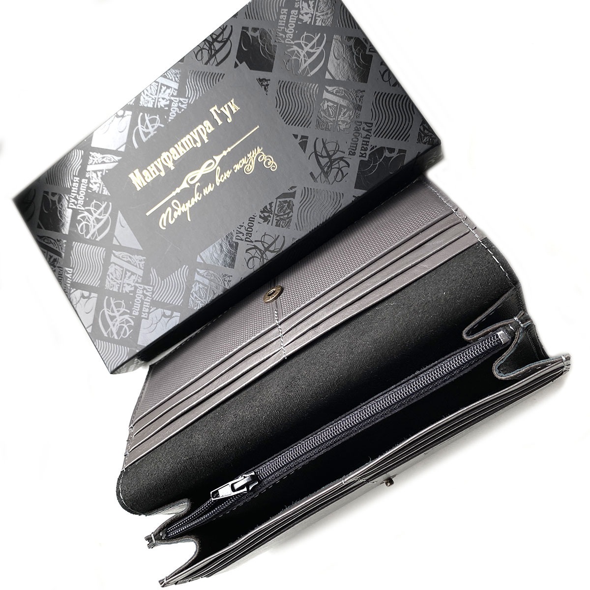 Портмоне большое из натуральной кожи с тиснением. Имеется 12 отдельных карманов для карточек, 3 вместительных отделения для бумажных купюр, а также 1 отделение на молнии, в котором удобно хранить монеты. Закрывается на кнопку.