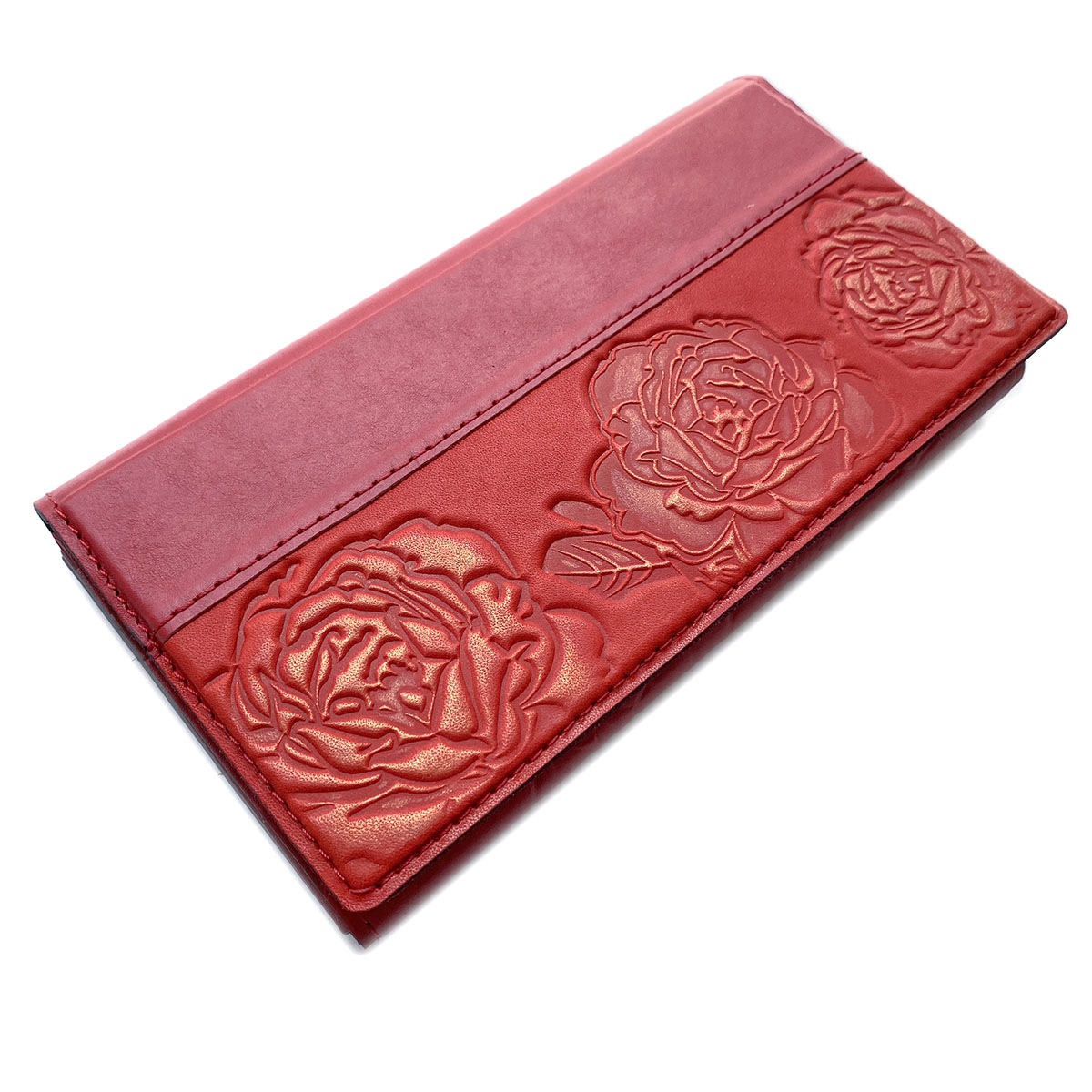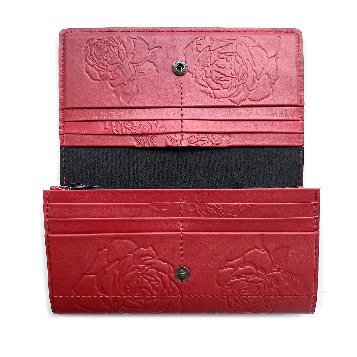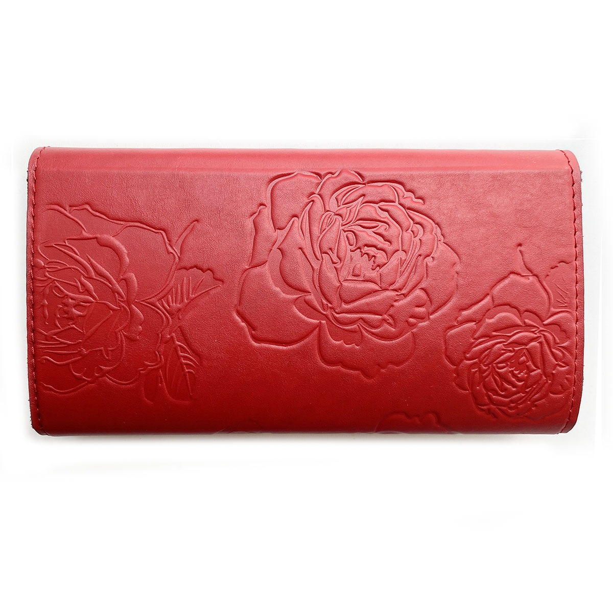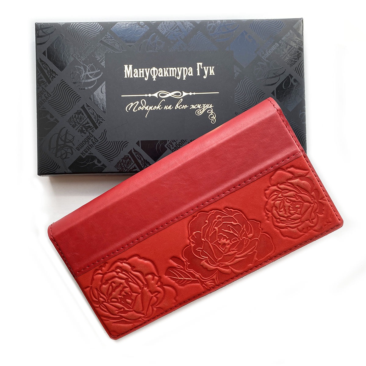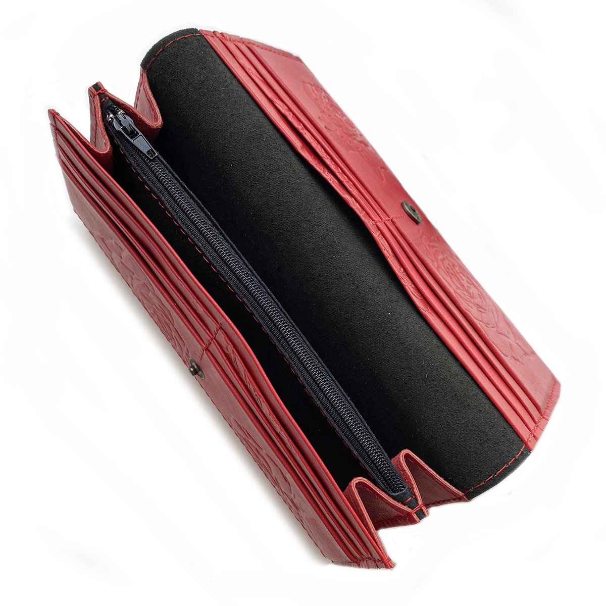 Портмоне большое из натуральной кожи с тиснением. Имеется 12 отдельных карманов для карточек, 3 вместительных отделения для бумажных купюр, а также 1 отделение на молнии, в котором удобно хранить монеты. Закрывается на кнопку.