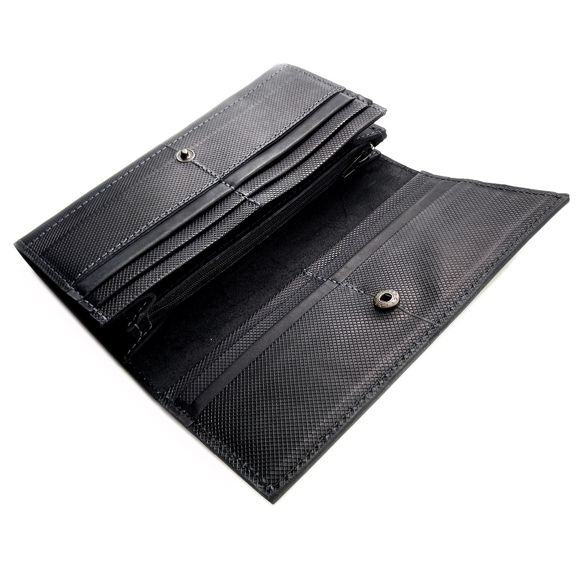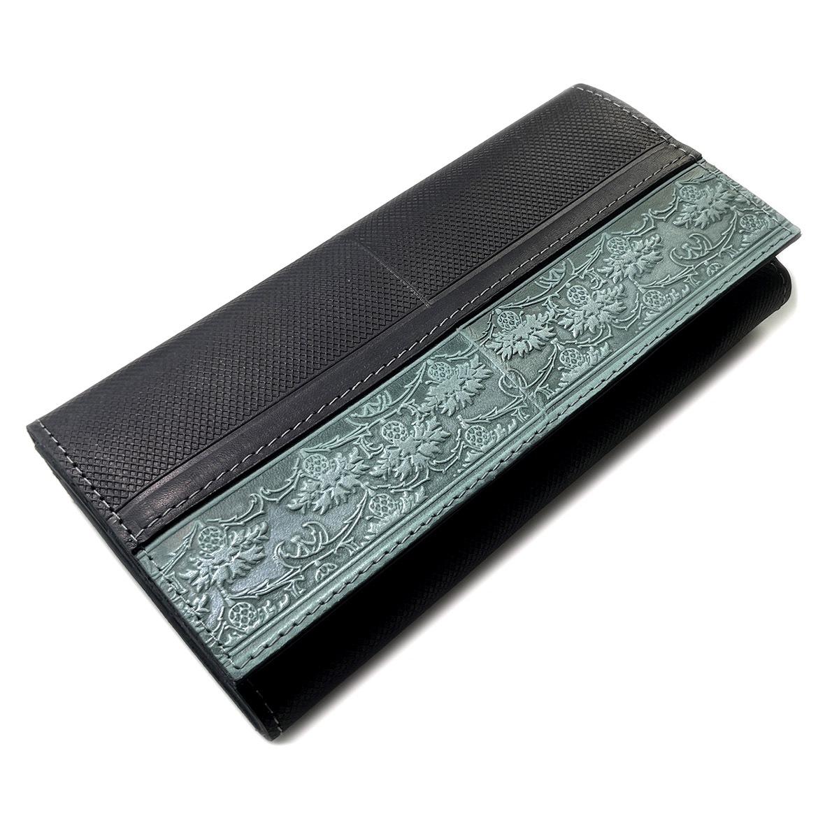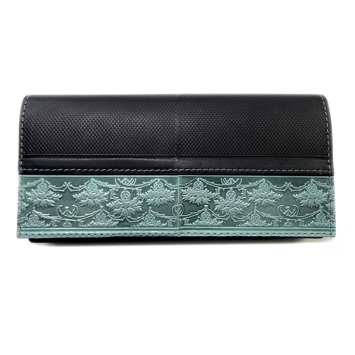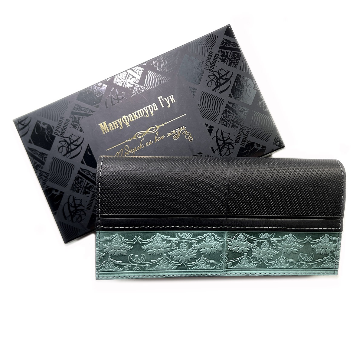 Портмоне большое из натуральной кожи с тиснением. Имеется 12 отдельных карманов для карточек, 3 вместительных отделения для бумажных купюр, а также 1 отделение на молнии, в котором удобно хранить монеты. Закрывается на кнопку.