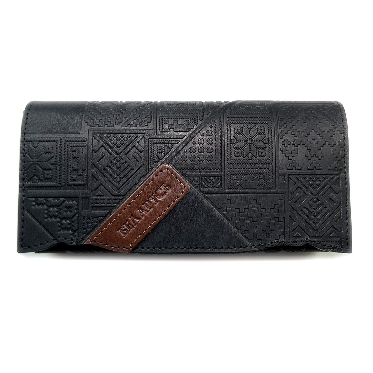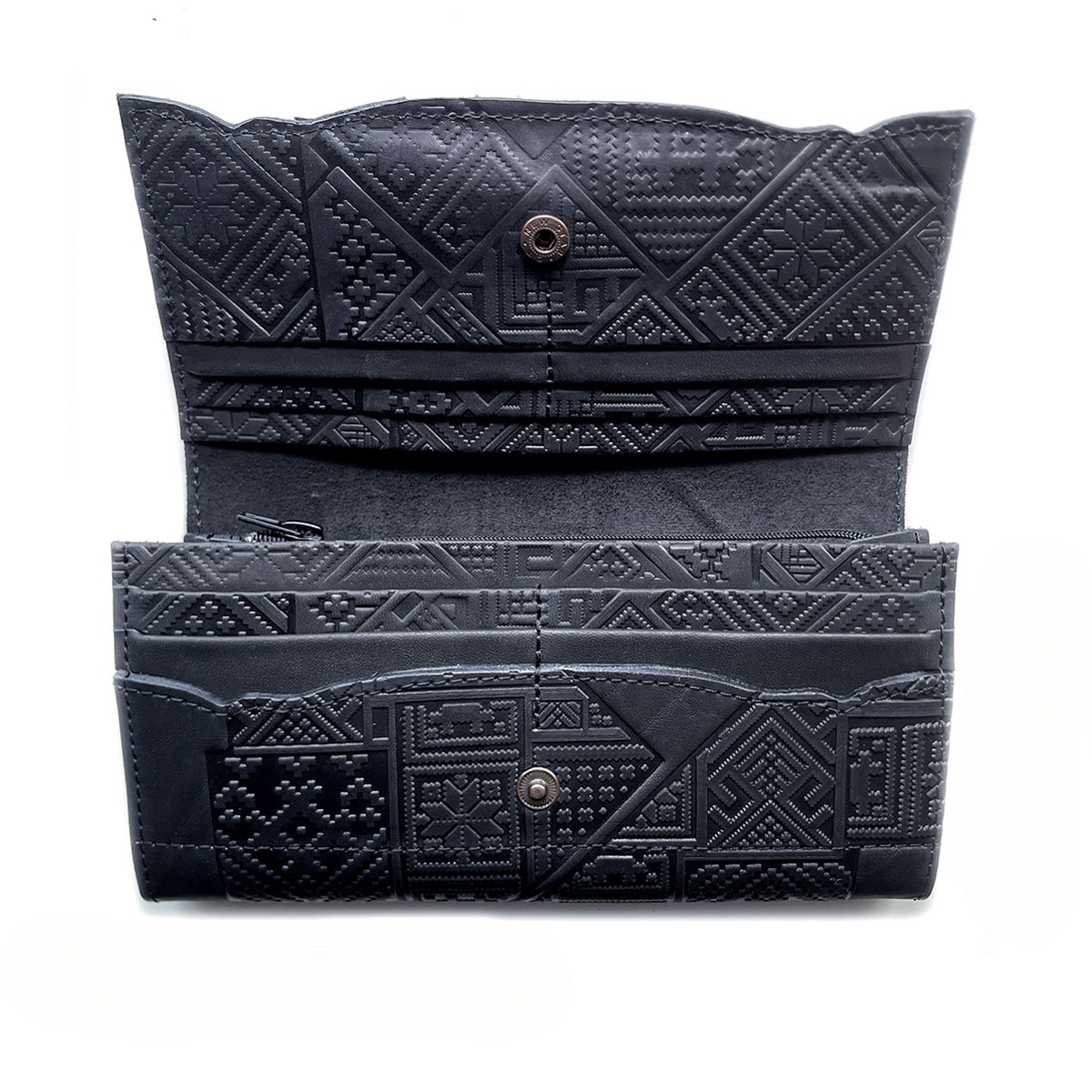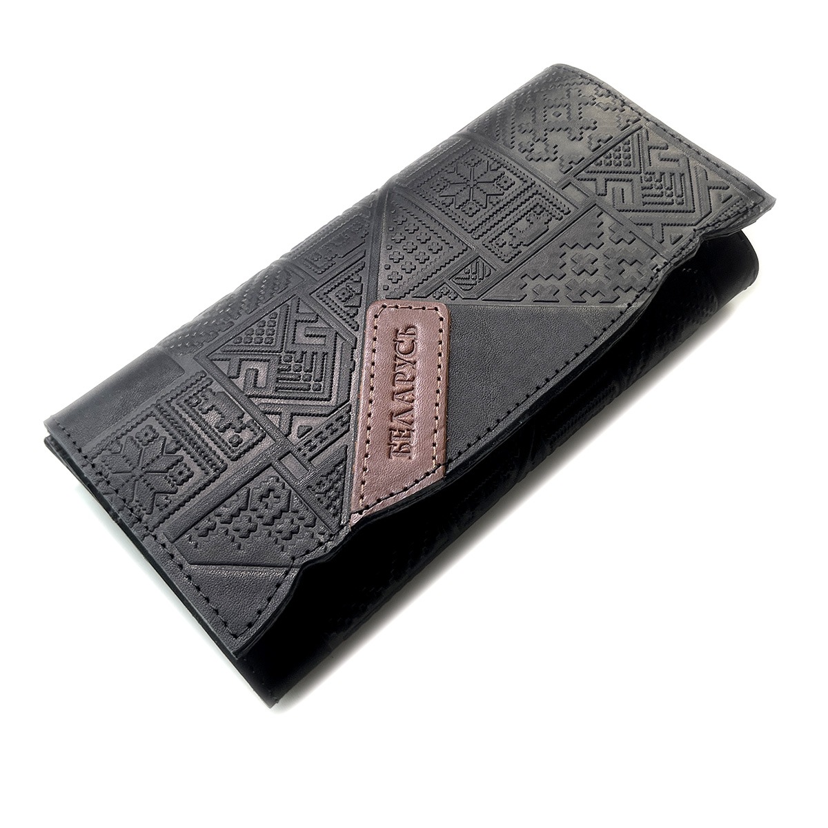 Портмоне большое из натуральной кожи с тиснением. Имеется 12 отдельных карманов для карточек, 3 вместительных отделения для бумажных купюр, а также 1 отделение на молнии, в котором удобно хранить монеты. Закрывается на кнопку.