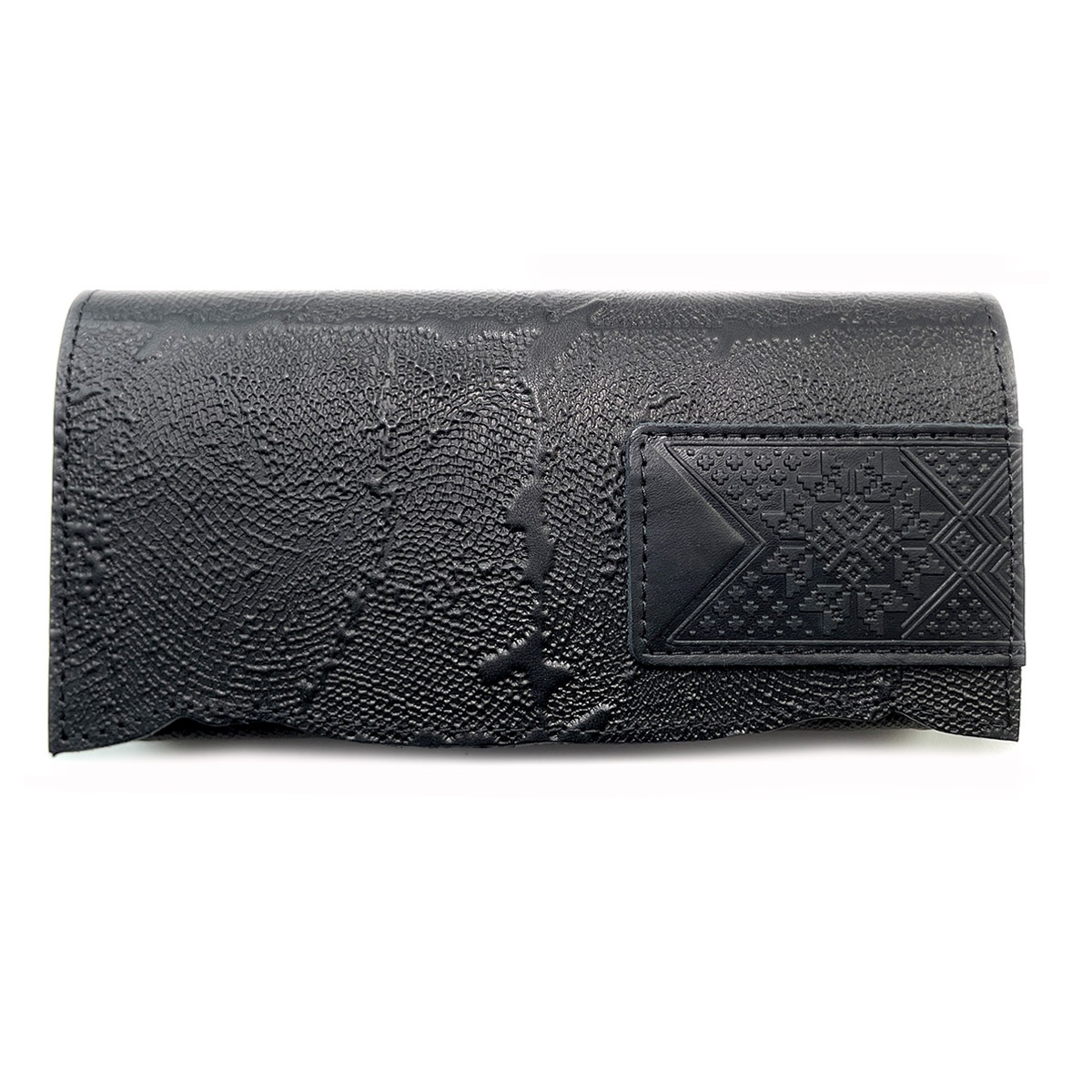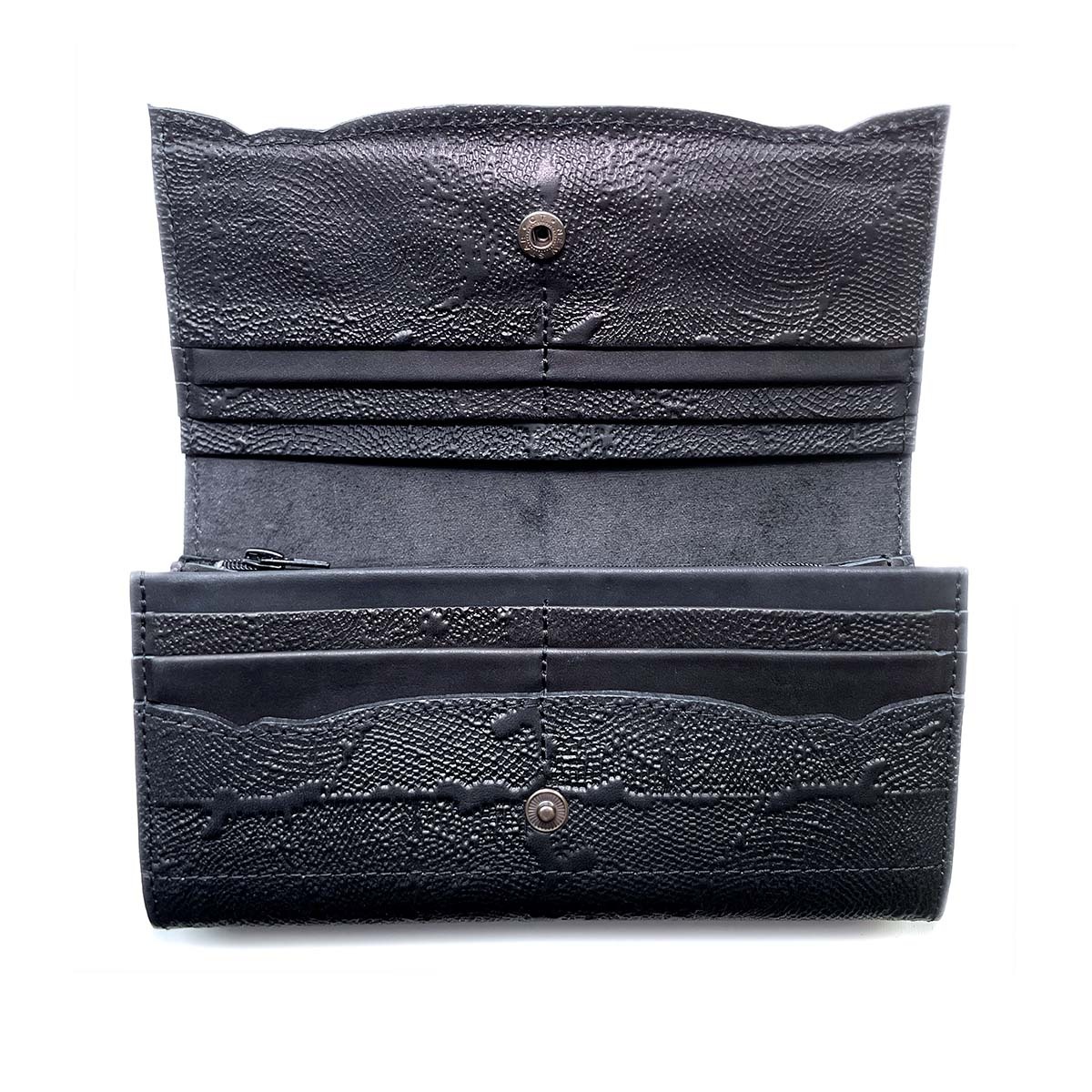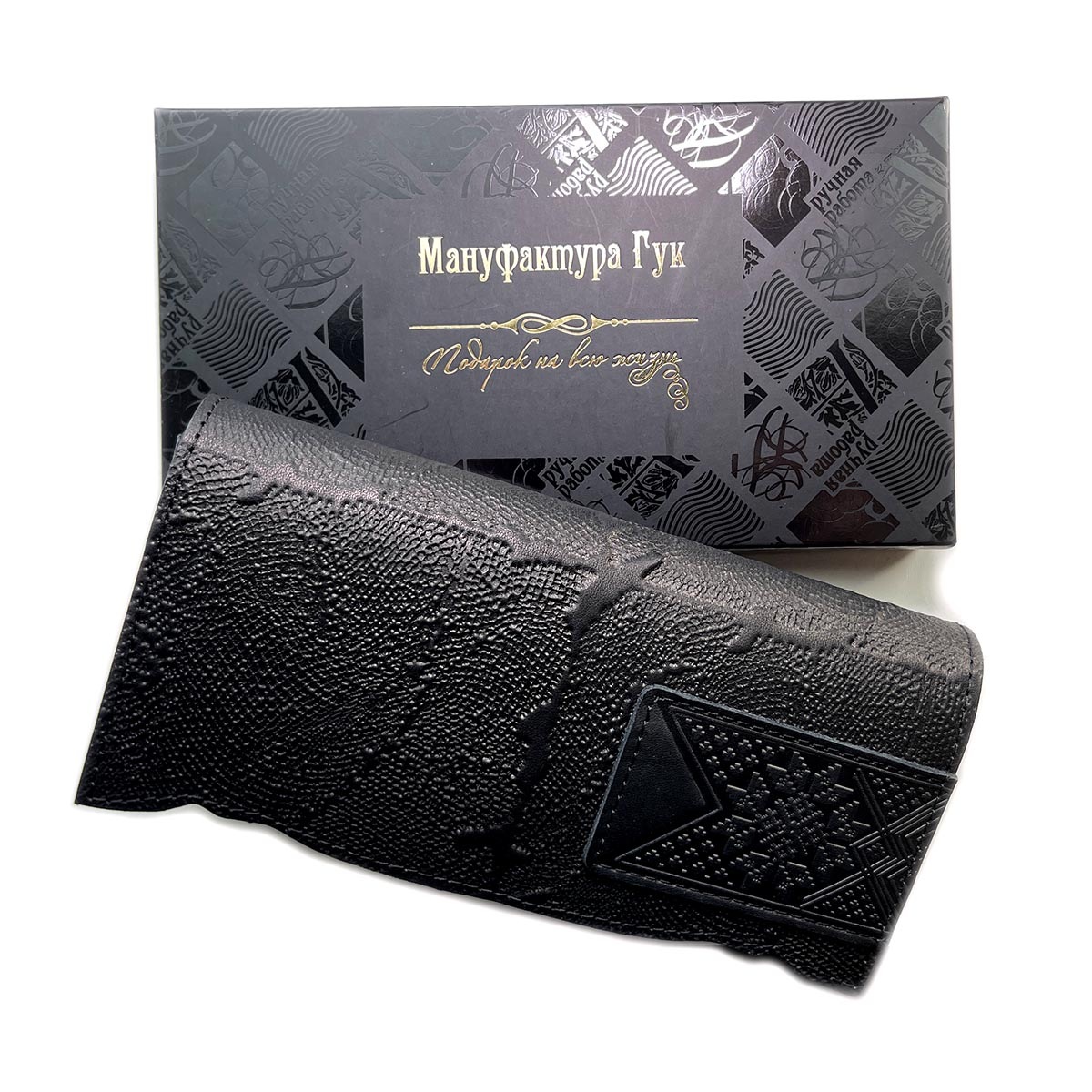 Портмоне большое из натуральной кожи с тиснением. Имеется 12 отдельных карманов для карточек, 3 вместительных отделения для бумажных купюр, а также 1 отделение на молнии, в котором удобно хранить монеты. Закрывается на кнопку.