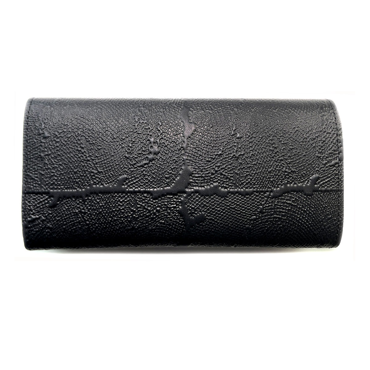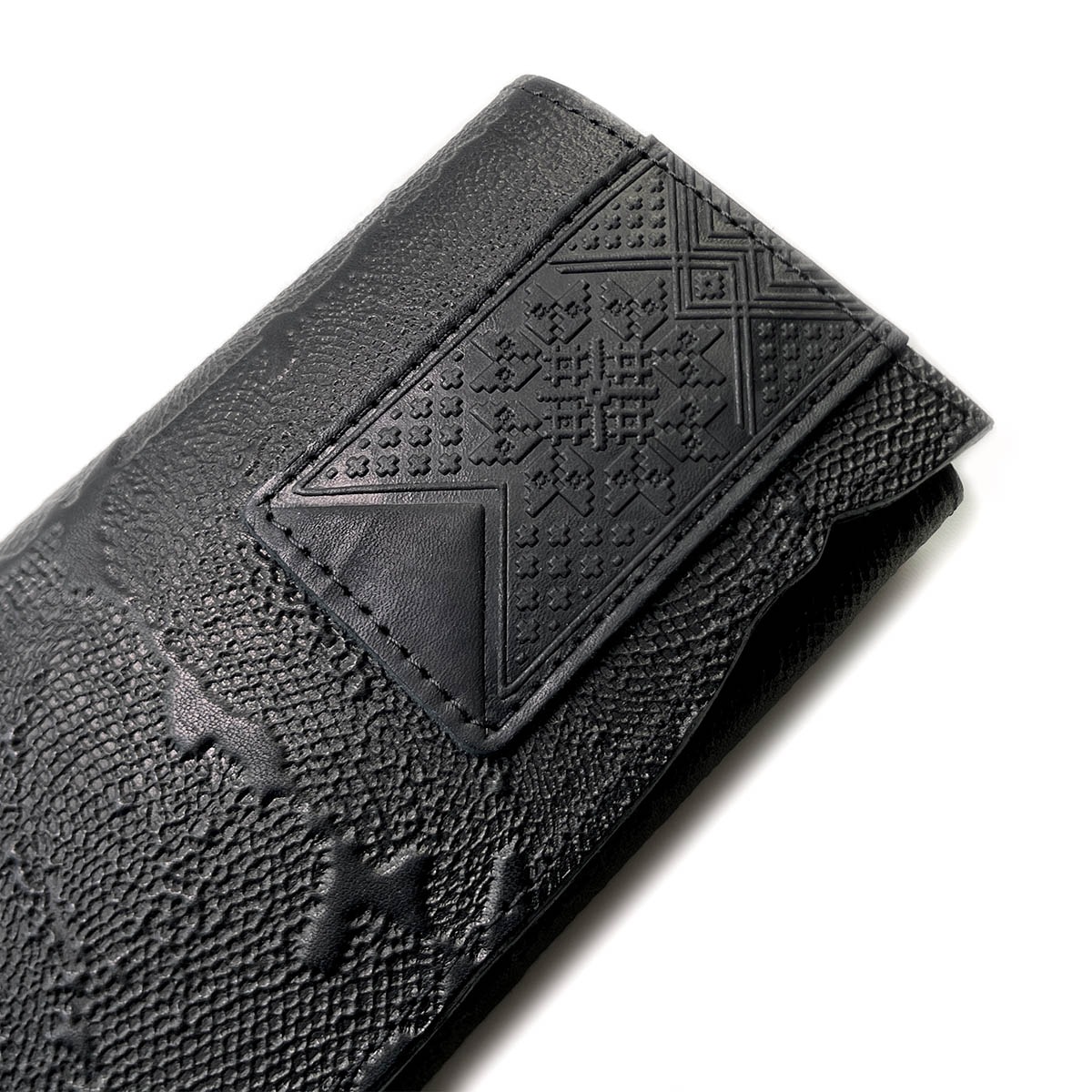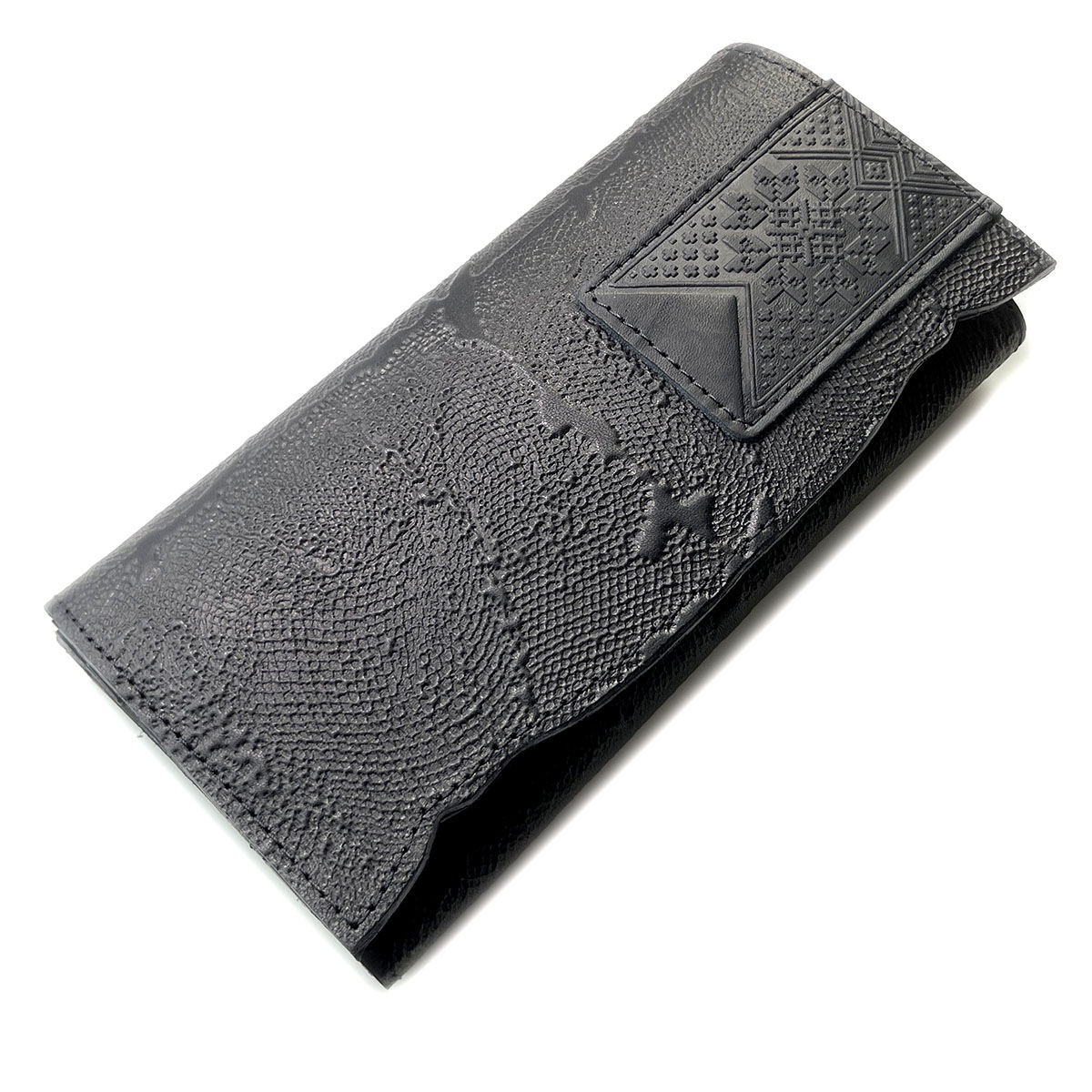 Портмоне большое из натуральной кожи с тиснением. Имеется 12 отдельных карманов для карточек, 3 вместительных отделения для бумажных купюр, а также 1 отделение на молнии, в котором удобно хранить монеты. Закрывается на кнопку.