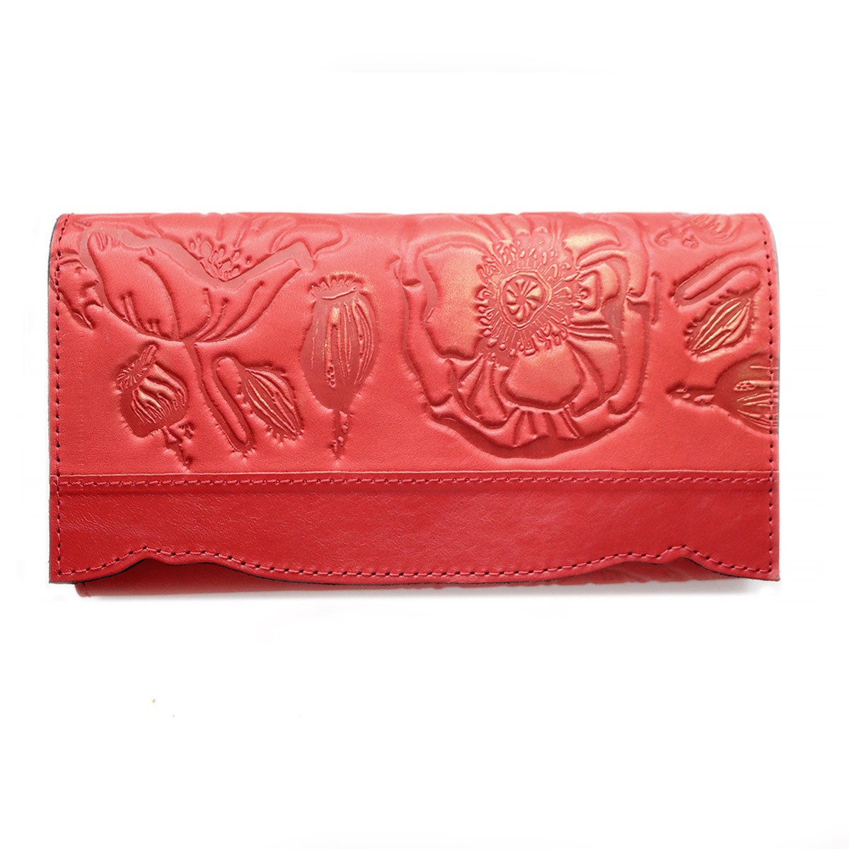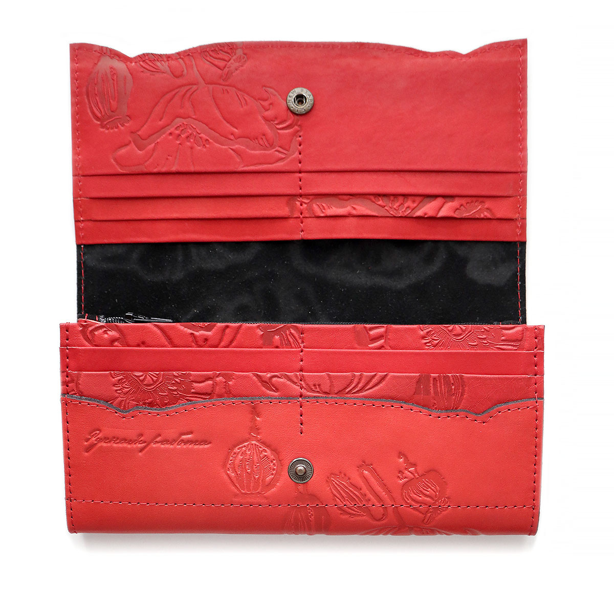 Портмоне большое "POPPY" из натуральной кожи с тиснением. Имеется 10 отдельных карманов для карточек, 3 вместительных отделения для бумажных купюр, а также 1 отделение на молнии, в котором удобно хранить монеты. Закрывается на кнопку.