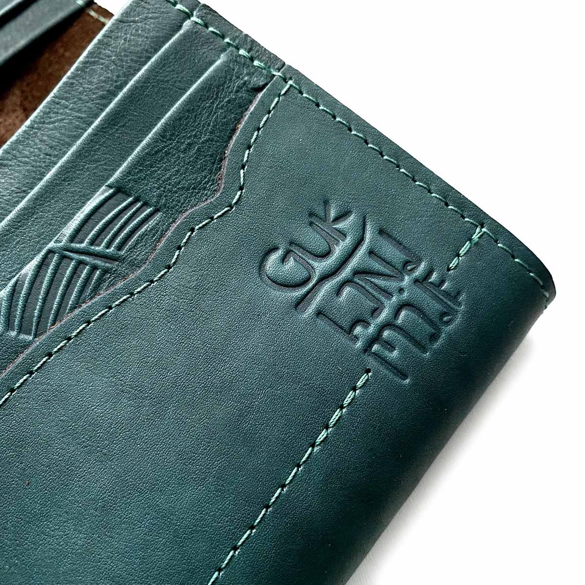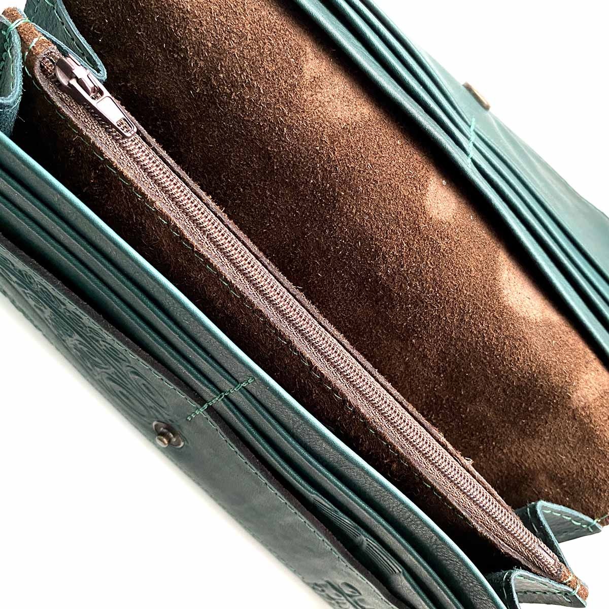 Портмоне большое "GREEN FEATHERS" из натуральной кожи с тиснением. Имеется 12 отдельных карманов для карточек, 3 вместительных отделения для бумажных купюр, а также 1 отделение на молнии, в котором удобно хранить монеты. Закрывается на кнопку.