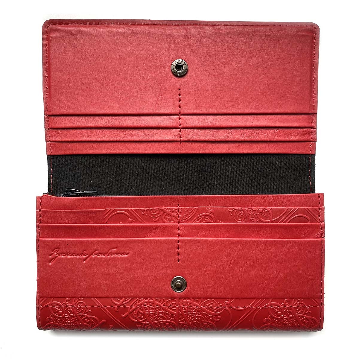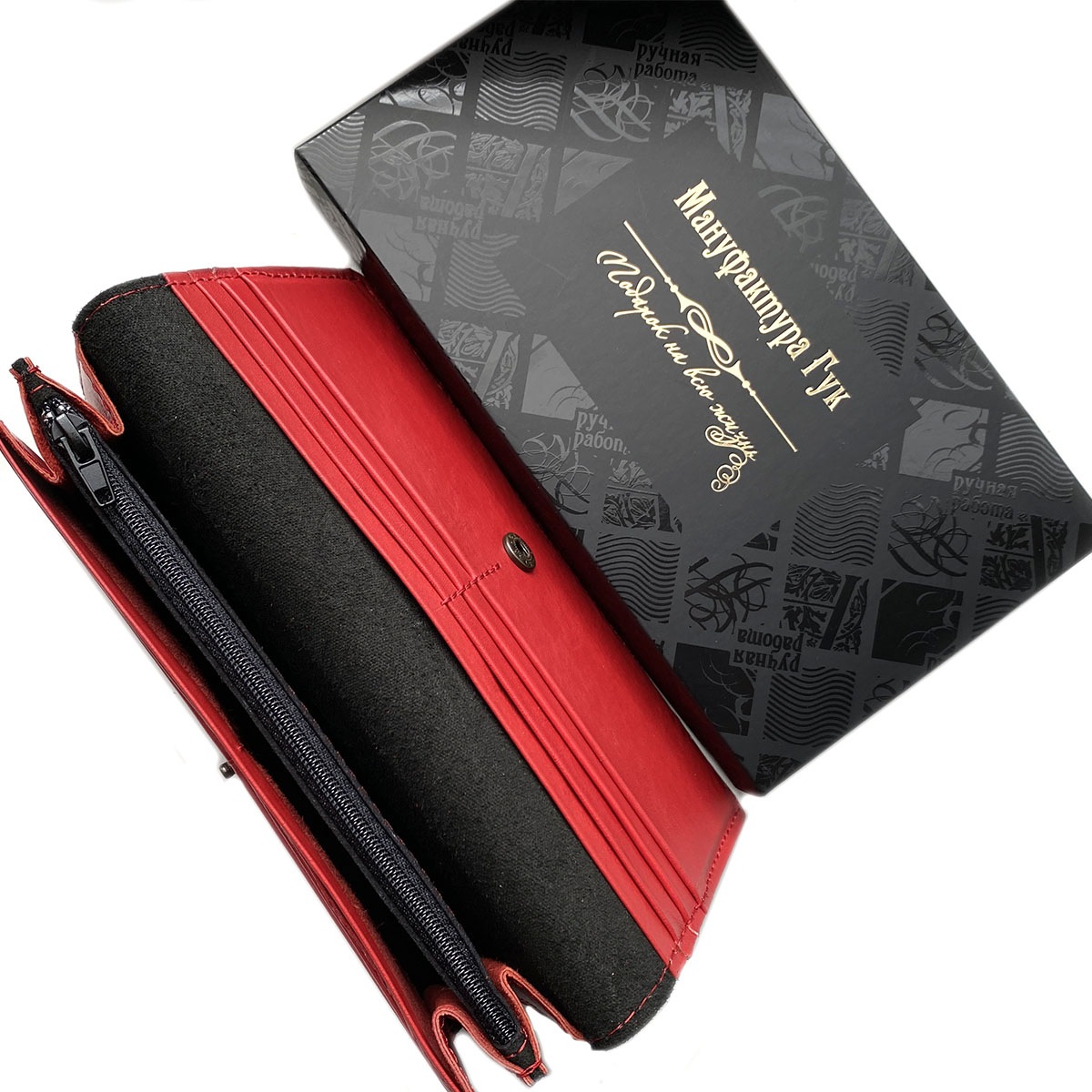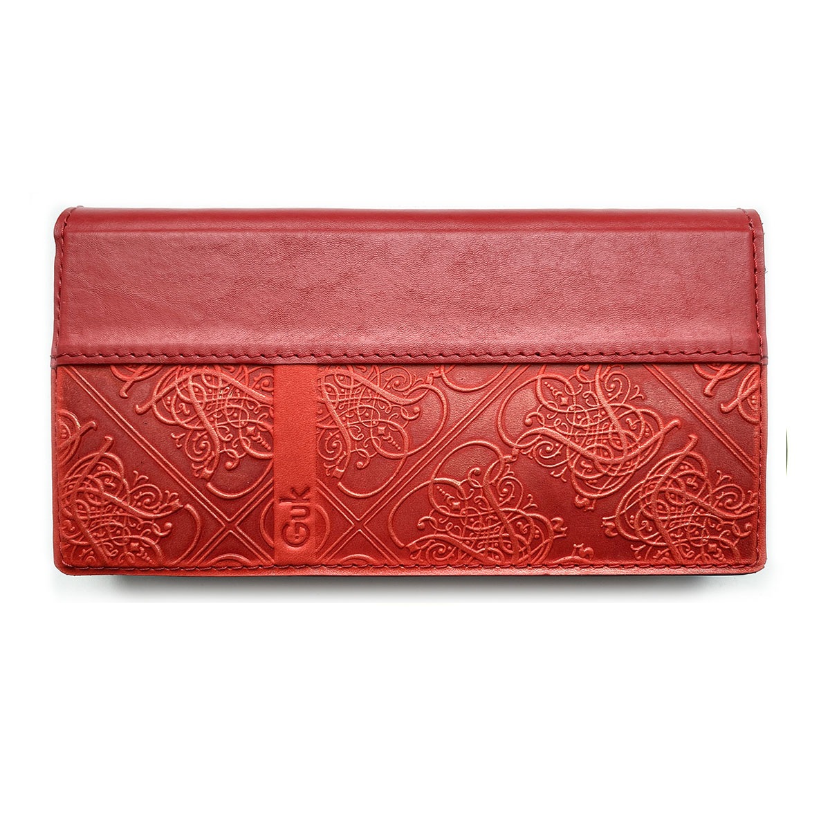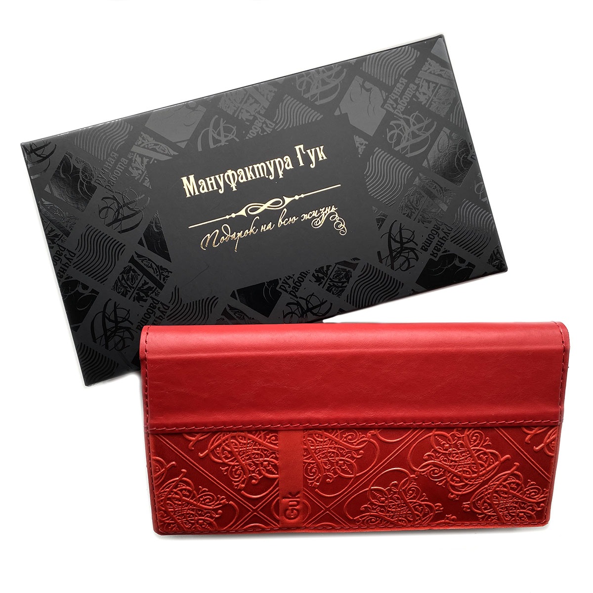 Портмоне большое из натуральной кожи с тиснением. Имеется 12 отдельных карманов для карточек, 3 вместительных отделения для бумажных купюр, а также 1 отделение на молнии, в котором удобно хранить монеты. Закрывается на кнопку.