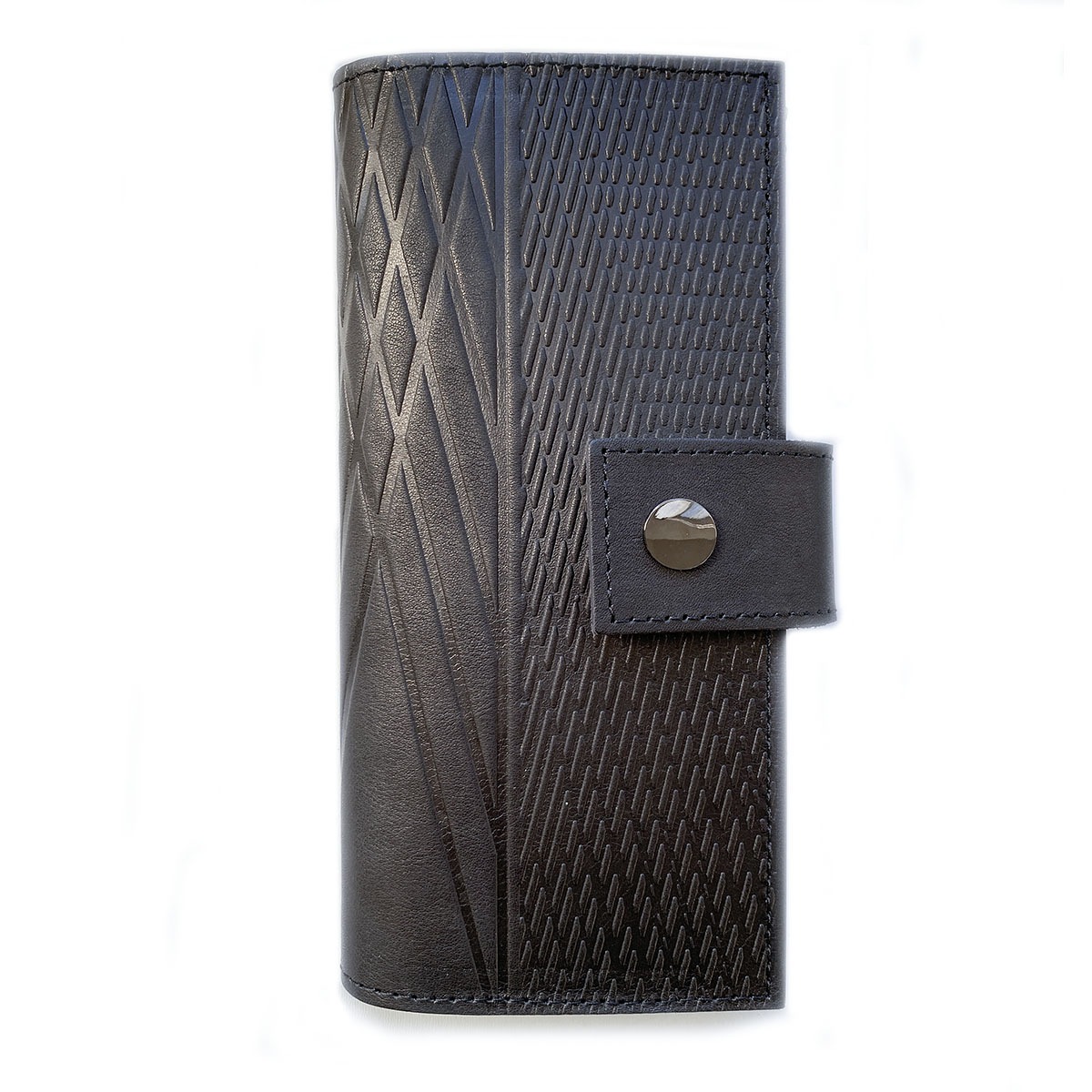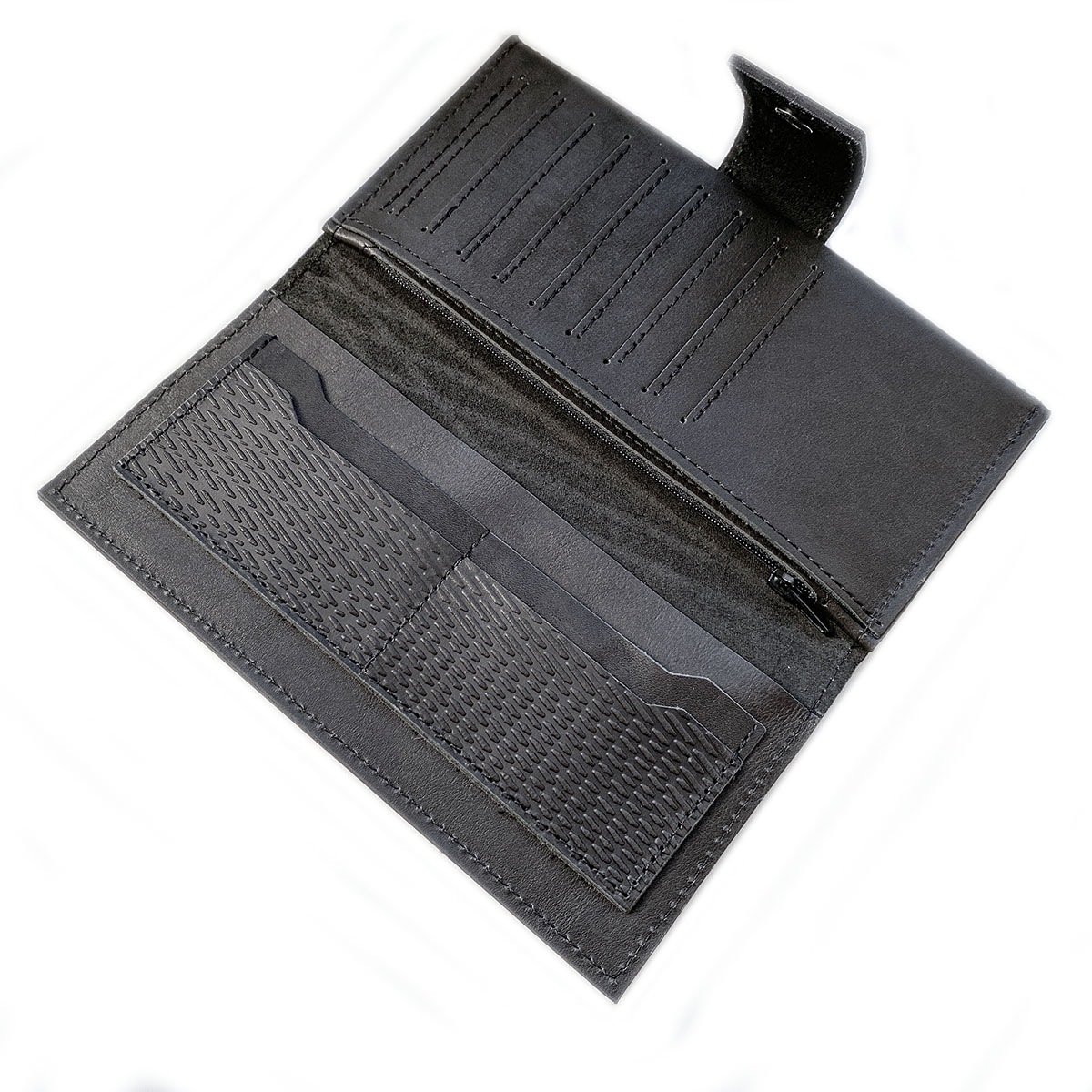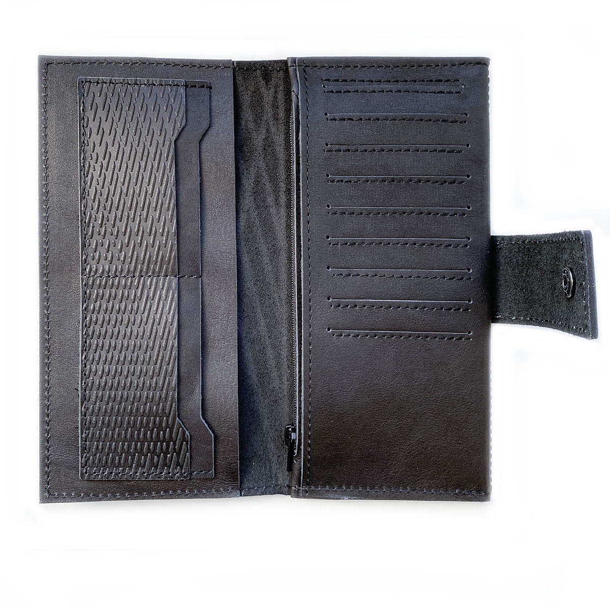 Портмоне большое из натуральной кожи с тиснением. Внутри слева: 4 кармана для карт + 1 карман на всю длину. Справа: 9 карманов для карт, два кармана на всю длину портмоне и также один карман на молнии, в котором удобно хранить монеты. Закрывается на кнопку. Портмоне сделано без картонного каркаса, для изготовления использовалась кожа 1,1..1,3 мм. Портмоне держит форму за счет плотности кожи.
